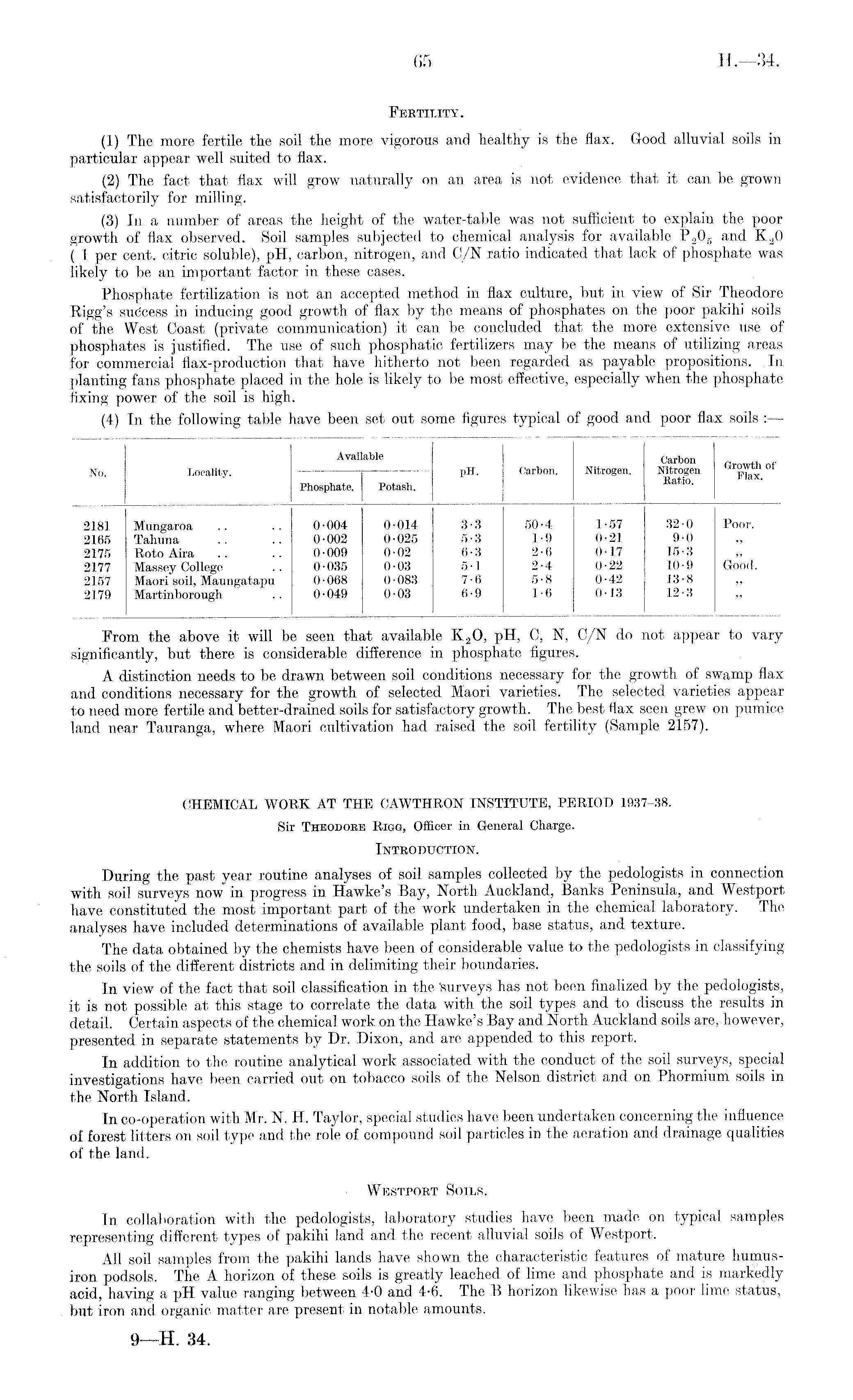 From the above, it will be seen that available K 2 O, pH, C, N, C/N do not appear to vary significantly, but there is considerable difference in phosphate figures. A distinction needs to be drawn between soil conditions necessary for the growth of swamp flax and conditions necessary for the growth of selected Maori varieties. The selected varieties appear to need more fertile and better-drained soils for satisfactory growth. The best flax seen grew on pumice land near Tauranga, where Maori cultivation had raised the soil fertility (Sample 2157). CHEMICAL WORK AT THE CAWTHRON INSTITUTE, PERIOD 1937-38. Sir Thkodobe Rigg, Officer in General Charge. Introduction. During the past year routine analyses of soil samples collected by the pedologists in connection with soil surveys now" in progress in Hawke's Bay, North Auckland, Banks Peninsula, and Westport have constituted the most important part of the work undertaken in the chemical laboratory. The analyses have included determinations of available plant food, base status, and texture. The data obtained by the chemists have been of considerable value to the pedologists in classifying the soils of the different districts and in delimiting their boundaries. In view of the fact that soil classification in the Surveys has not been finalized by the pedologists, it is not possible at this stage to correlate the data with the soil types and to discuss the results in detail. Certain aspects of the chemical work on the Hawke's Bay and North Auckland soils are, however, presented in separate statements by Dr. Dixon, and are appended to this report. In addition to the routine analytical work associated with the conduct of the soil, surveys, special investigations have been carried out on tobacco soils of the Nelson district and on Phormium soils in the North Island. In co-operation with Mr. N. H. Taylor, special studies have been undertaken concerning the influence of forest litters on soil type and the role of compound soil particles in the aeration and drainage qualities of the land. Westport Soils. In collaboration with the pedologists, laboratory studies have been made on typical'samples representing different types of pakihi land and the recent alluvial soils of Westport. All soil samples from the pakihi lands have shown the characteristic features of mature humusiron podsols. The A horizon of these soils is greatly leached, of lime and phosphate and is markedly acid, having apH value ranging between 4-0 and 4-6. The B horizon likewise lias a poor lime status, but iron and organic matter are present in notable amounts.