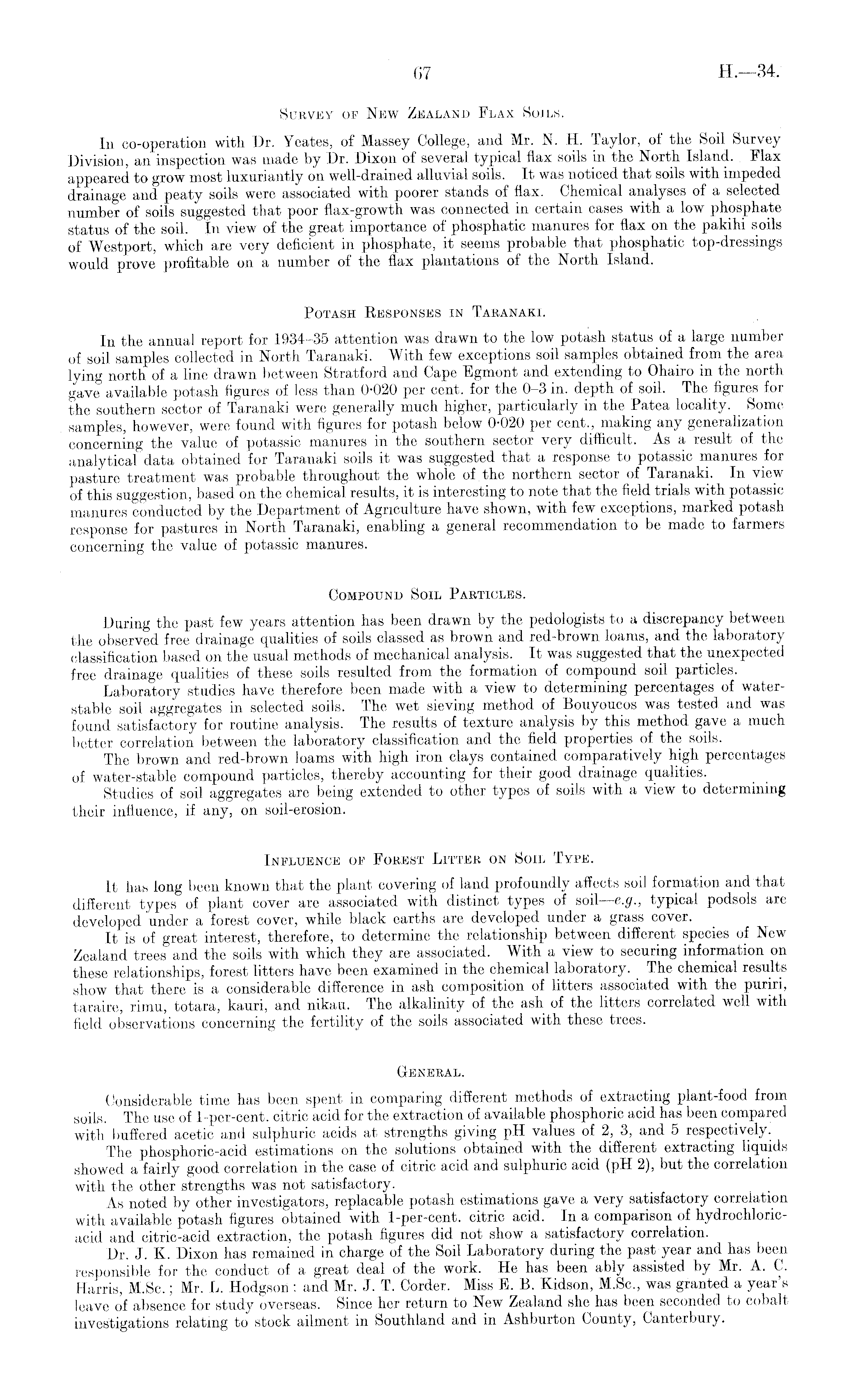 Survey of New Zealand Flax Soils. In co-operation with Dr. Yeates, of Massey College, and Mr. N. H. Taylor, of the Soil Survey Division, an inspection was made by Dr. Dixon of several typical flax soils in the North Island. , Flax appeared to grow most luxuriantly on well-drained alluvial soils. It was noticed that soils with impeded drainage and peaty soils were associated with poorer stands of flax. C hemical analyses of a selected number of soils suggested that poor flax-growth was connected in certain cases with a low phosphate status of the soil. In view of the great importance of phosphatic manures for flax on the pakihi soils of Westport, which are very deficient in phosphate, it seems probable that phosphatic top-dressings would prove profitable on a number of the flax plantations of the North Island. Potash Responses in Taranaki. In the annual report for 1934-35 attention was drawn to the low potash status of a large number of soil samples collected in North Taranaki. With few exceptions soil samples obtained from the area lying north of a line drawn between Stratford and Cape Egmont and extending to Ohairo in the north gave available potash figures of less than 0-020 per cent, for the 0-3 in. depth of soil. The figures for the southern sector of Taranaki were generally much higher, particularly in the Patea locality. Some samples, however, were found with figures for potash below 0-020 per cent., making any generalization concerning the value of potassic manures in the southern sector very difficult. As a result of the analytical data obtained for Taranaki soils it was suggested that a response to potassic manures for pasture treatment was probable throughout the whole of the northern sector of Taranaki. In view of this suggestion, based on the chemical results, it is interesting to note that the field trials with potassic manures conducted by the Department of Agriculture have shown, with few exceptions, marked potash response for pastures in North Taranaki, enabling a general recommendation to be made to farmers concerning the value of potassic manures. Compound Soil Particles. During the past few years attention has been drawn by the pedologists to a discrepancy between the observed free drainage qualities of soils classed as brown and red-brown loams, and the laboratory classification based on the usual methods of mechanical analysis. It was suggested that the unexpected free drainage qualities of these soils resulted from the formation of compound soil particles. Laboratory studies have therefore been made with a view to determining percentages of waterstable soil aggregates in selected soils. The wet sieving method of Bouyoucos was tested and was found satisfactory for routine analysis. The results of texture analysis by this method gave a much better correlation between the laboratory classification and the field properties of the soils. The brown and red-brown loams with high iron clays contained comparatively high percentages of water-stable compound particles, thereby accounting for their good drainage qualities. Studies of soil aggregates are being extended to other types of soils with a view to determining their influence, if any, on soil-erosion. Influence op Forest Litter on Soil Type. It has long been known that the plant covering of land profoundly affects soil formation and that different types of plant cover are associated with distinct types of soil—e.g., typical podsols are developed under a forest cover, while black earths are developed under a grass cover. It is of great interest, therefore, to determine the relationship between different species of New Zealand trees and the soils with which they are associated. With a view to securing information on these relationships, forest litters have been examined in the chemical laboratory. The chemical results show that there is a considerable difference in ash composition of litters associated with the puriri, taraire, rimu, totara, kauri, and nikau. The alkalinity of the ash of the litters correlated well with field observations concerning the fertility of the soils associated with these trees. General. Considerable time has been spent in comparing different methods of extracting plant-food from soils. The use of 1-per-cent. citric acid for the extraction of available phosphoric acid has been compared with buffered acetic and sulphuric acids at strengths giving pH values of 2, 3, and 5 respectively. The phosphoric-acid estimations on the solutions obtained with the different extracting liquids showed a fairly good correlation in the case of citric acid and sulphuric acid (pH 2), but the correlation with the other strengths was not satisfactory. As noted by other investigators, replacable potash estimations gave a very satisfactory correlation with available potash figures obtained with 1-per-cent. citric acid. In a comparison of hydrochloricacid and citric-acid extraction, the potash figures did not show a satisfactory correlation. Dr. J. K. Dixon has remained in charge of the Soil Laboratory during the past year and has been responsible for the conduct of a great deal of the work. He has been ably assisted by Mr. A. C. Harris, M.Sc, ; Mr. L. Hodgson: and Mr. J. T. Corder. Miss E. B. Kidson, M.Sc., was granted a year's leave of absence for study overseas. Since her return to New Zealand she has been seconded to cobalt investigations relating to stock ailment in Southland and in Ashburton County, Canterbury.