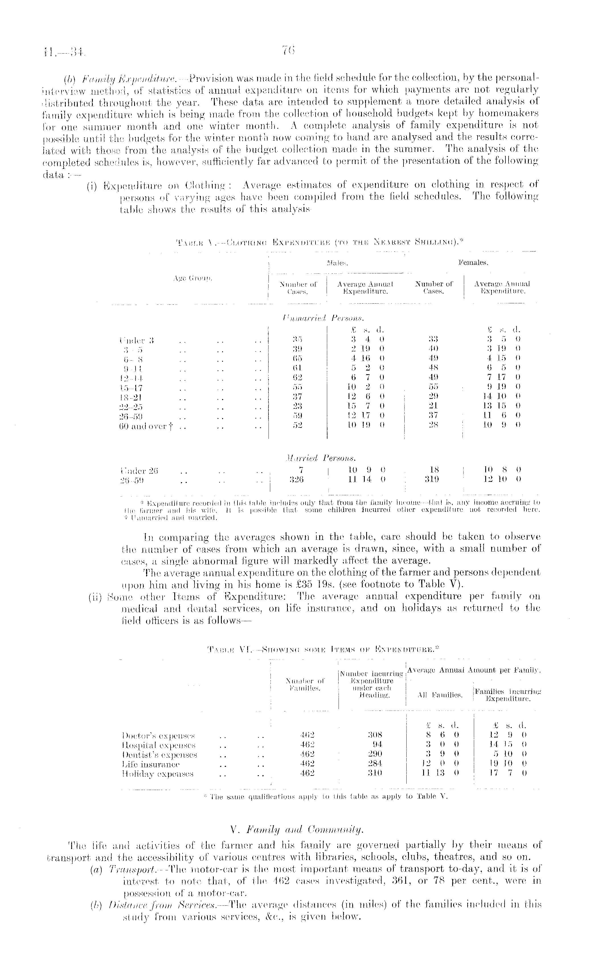 In comparing the averages shown in the table, care should be taken to observe the number of cases from which an average is drawn, since, with a small number of cases, a single abnormal figure will markedly affect the average. The average annual expenditure on the clothing of the farmer and persons dependent upon him and living in his home is £35 19s. (see footnote to Table V). (ii) Some other Items of Expenditure: The average annual expenditure per family on medical and dental services, on life insurance, and on holidays as returned to the field officers is as follows —