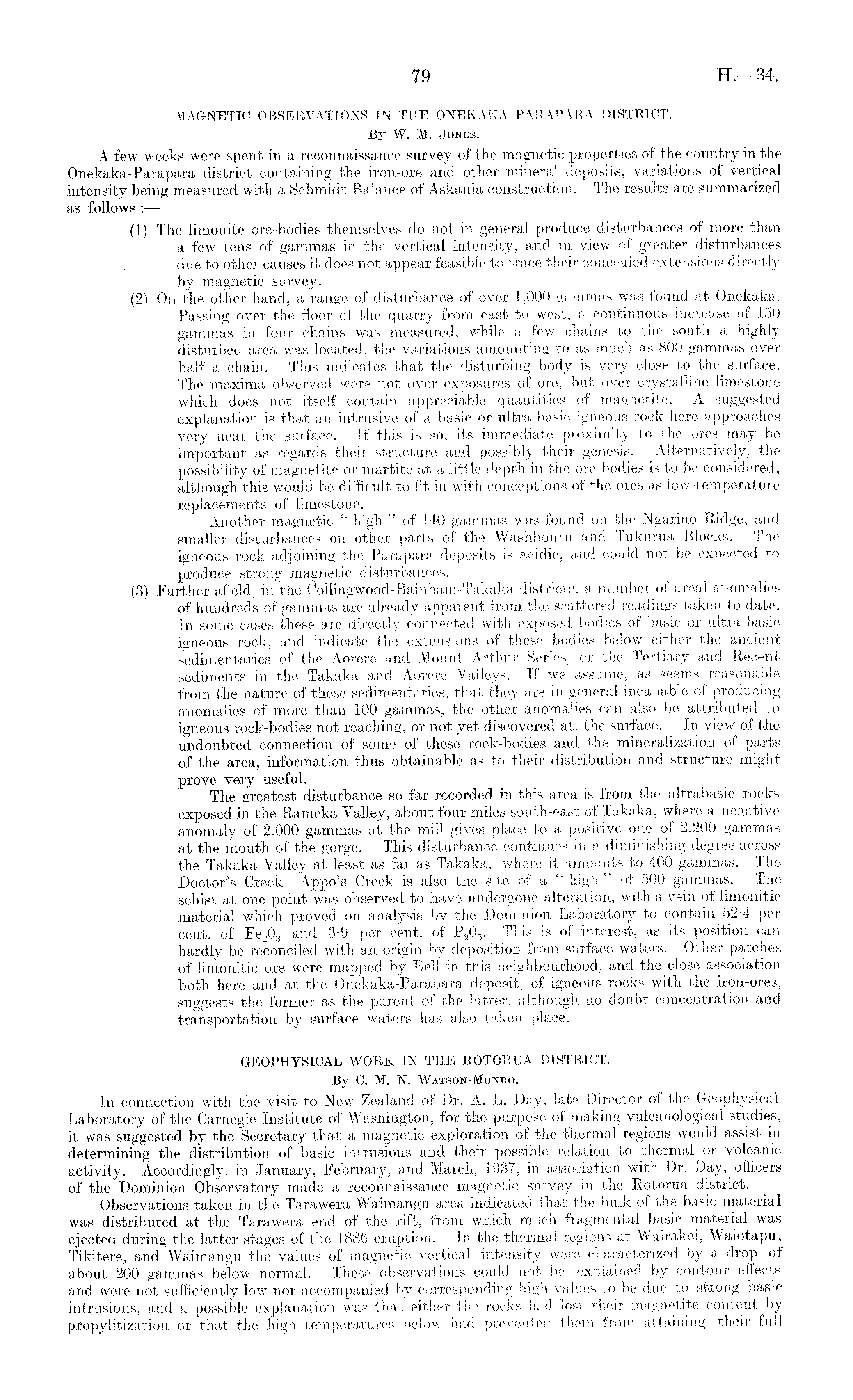 MAGNETIC OBSERVATIONS IN THE ONEKAKA-PARAPARA DISTRICT. By W. M. Jones. A few weeks were spent in a reconnaissance survey of the magnetic properties of the country in the Onekaka-Parapara district containing the iron-ore and other mineral deposits, variations of vertical intensity being measured with a Schmidt Balance of Askania construction. The results are summarized as follows :— (1) The limonite ore-bodies themselves do not in general produce disturbances of more than a few tens of gammas in the vertical intensity, and in view of greater disturbances due to other causes it does not appear feasible to trace their concealed extensions directly by magnetic survey. (2) On the other hand, a range of disturbance of over 1,000 gammas was found at Onekaka. Passing over the floor of the quarry from east to west, a continuous increase of 150 gammas in four chains was measured, while a few chains to the south a highly disturbed area was located, the variations amounting to as much as 800 gammas over half a chain. This indicates that the disturbing body is very close to the surface. The maxima observed were not over exposures of ore, but over crystalline limestone which does not itself contain appreciable quantities of magnetite. A suggested explanation is that an intrusive of a basic or ultra-basic igneous rock here approaches very near the surface. If this is so, its immediate proximity to the ores may be important as regards their structure and possibly their genesis. Alternatively, the possibility of magnetite or martite at a little depth in the ore-bodies is to be considered, although this would be difficult to fit in with conceptions of the ores as low-temperature replacements of limestone. Another magnetic " high " of 140 gammas was found on the Ngarino Ridge, and smaller disturbances on other parts of the Washbourn and Tukurua Blocks. The igneous rock adjoining the Parapara, deposits is acidic, and could not be expected to produce strong magnetic disturbances. (3) Farther afield, in the Collingwood-Bainham-Takaka districts, a number of areal anomalies of hundreds of gammas are already apparent from the scattered readings taken to date. In some cases these are directly connected with exposed bodies of basic or ultra-basic igneous rock, and indicate the extensions of these bodies below either the ancient sedimentaries of the Aorere and Mount Arthur Series, or the Tertiary and Recent sediments in the Takaka and Aorere Valleys. If we assume, as seems reasonable from the nature of these sedimentaries, that they are in general incapable of producing anomalies of more than 100 gammas, the other anomalies can also be attributed to igneous rock-bodies not reaching, or not yet discovered at, the surface. In view of the undoubted connection of some of these rock-bodies and the mineralization of parts of the area, information, thus obtainable as to their distribution and structure might prove very useful. The greatest disturbance so far recorded in this area is from the ultrabasic rocks exposed in the Rameka Yallev, about four miles south-east of Takaka, where a negative anomaly of 2,000 gammas at the mill gives place to a positive one of 2,200 gammas at the mouth of the gorge. This disturbance continues in a diminishing degree across the Takaka Valley at least as far as Takaka, where it amounts to 400 gammas. The Doctor's Creek - Appo's Creek is also the site of a " high "of 500 gammas. The schist at one point was observed to have undergone alteration, with a vein of limonitic material which proved on analysis by the Dominion Laboratory to contain 52-4 per cent, of Fe 2 0 3 and 3-9 per cent, of P 2 0 5 . This is of interest, as its position can hardly be reconciled with an origin by deposition from surface waters. Other patches of limonitic ore were mapped by Bell in this neighbourhood, and the close association both here and at the Onekaka-Parapara deposit, of igneous rocks with the iron-ores, suggests the former as the parent of the latter, although no doubt concentration and transportation by surface waters has also taken place. GEOPHYSICAL WORK IN THE ROTORUA DISTRICT. By C. M. N. Watson-Munro. 11l connection with the visit to New Zealand of Dr. A. L. Day, late Director of the Geophysical Laboratory of the Carnegie Institute of Washington, for the purpose of making vulcanological studies, it was suggested by the Secretary that a magnetic exploration of the thermal regions would assist in determining the distribution of basic intrusions and their possible relation to thermal or volcanic activity. Accordingly, in January, February, and March, 1937, in association with Dr. Day, officers of the Dominion Observatory made a reconnaissance magnetic survey in the Rotorua district. Observations taken in the Tarawera-Waimangu area indicated that the bulk of the basic material was distributed at the Tarawera end of the rift, from which much fragmental basic material was ejected during the latter stages of the 1886 eruption. In the thermal regions at Wairakei, Waiotapu, Tikitere, and Waimangu the values of magnetic vertical intensity were characterized by a drop of about 200 gammas below normal. These observations could not be explained by contour effects and were not sufficiently low nor accompanied by corresponding high values to be due to strong basic intrusions, and a possible explanation was that either the rocks had lost their magnetite content by propylitization or that the high temperatures below had prevented them, from attaining their full