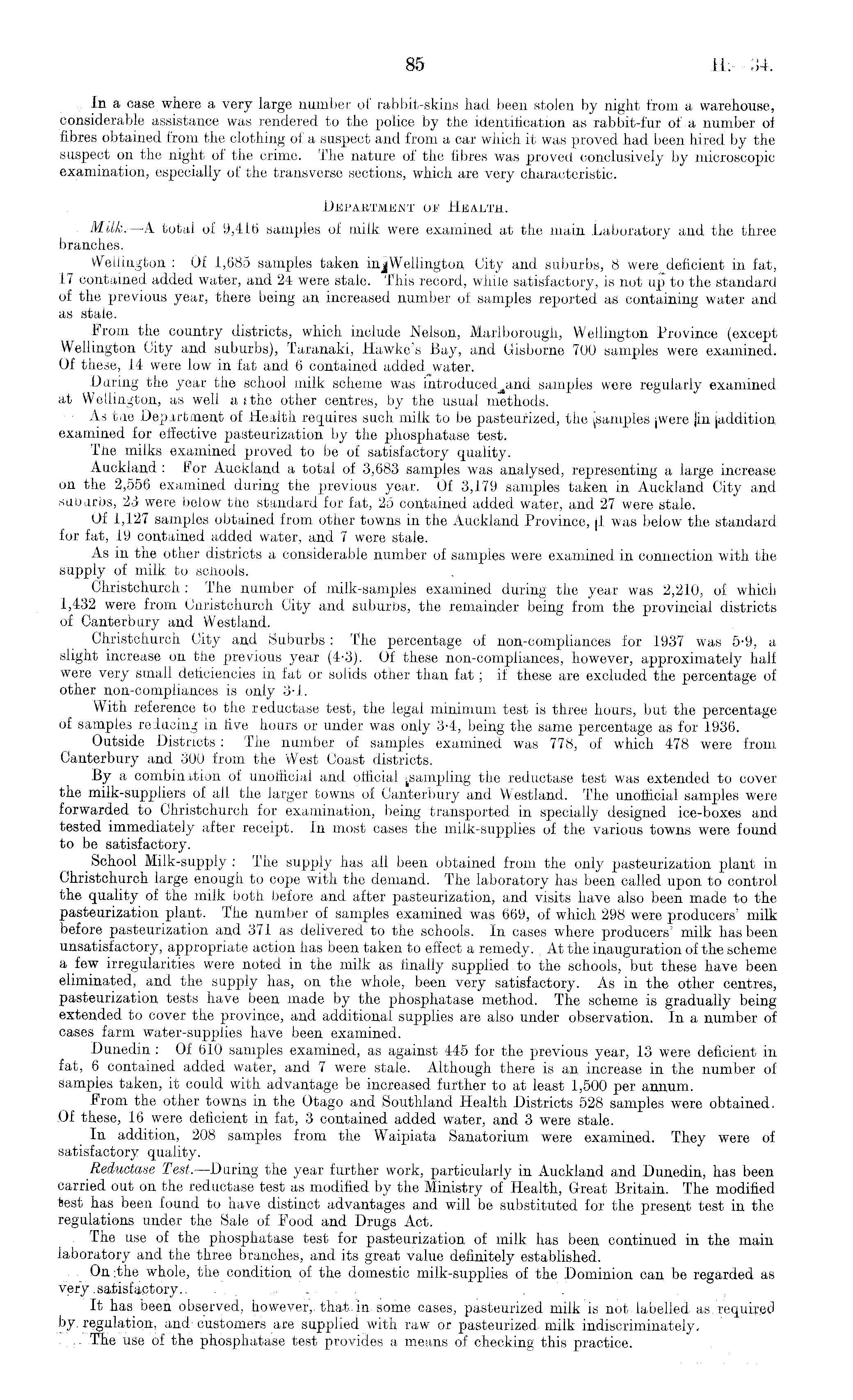 In a case where a very large number of rabbit-skins had been stolen by night from a warehouse, considerable assistance was rendered to the police by the identification as rabbit-fur of a number of fibres obtained from the clothing of a suspect and from a car which it was proved had been hired by the suspect on the night of the crime. The nature of the fibres was proved conclusively by microscopic examination, especially of the transverse sections, which are very characteristic. Department of Health. Milk.—-A total of 9,416 samples of milk were examined at the main Laboratory and the three branches. Wellington : Of 1,685 samples taken injWellington City and suburbs, 8 were deficient in fat, 17 contained added water, and 24 were stale. This record, while satisfactory, is not up to the standard of the previous year, there being an increased number of samples reported as containing water and as stale. From the country districts, which include Nelson, Marlborough, Wellington Province (except Wellington City and suburbs), Taranaki, Hawke's Bay, and Gisborne 700 samples were examined. Of these, 14 were low in fat and 6 contained added water. Daring the year the school milk scheme was samples were regularly examined at Wellington, as well a utile other centres, by the usual methods. As tae -Department of Health requires such milk to be pasteurized, the (samples jwere jin (addition examined for effective pasteurization by the phosphatase test. Tie milks examined proved to be of satisfactory quality. Auckland : For Auckland a total of 3,683 samples was analysed, representing a large increase on the 2,556 examined during the previous year. Of 3,179 samples taken in Auckland City and suDarbs, 23 were below tiie standard for fat, 26 contained added water, and 27 were stale. Of 1,127 samples obtained from other towns in the Auckland Province, jl was below the standard for fat, 19 contained added water, and 7 were stale. As in the other districts a considerable number of samples were examined in connection with the supply of milk to sciiools. Christchurch : The number of milk-samples examined during the year was 2,210, of which 1,432 were from Unristchurch City and suburbs, the remainder being from the provincial districts of Canterbury and Westland. Christchurch City and Suburbs : The percentage of non-compliances for 1937 was 5-9, a slight increase on the previous year (4-3). Of these non-compliances, however, approximately half were very small deficiencies in fat or solids other than fat ; if these are excluded the percentage of other non-compliances is only 3-1. With reference to the reductase test, the legal minimum test is three hours, but the percentage of samples reducing in five hours or under was only 3-4, being the same percentage as for 1936. Outside Districts : The number of samples examined was 778, of which 478 were from Canterbury and 300 from the West Coast districts. By a combination of unolficiai and official sampling the reductase test was extended to cover the milk-suppliers of all the larger towns of Canterbury and Westland. The unofficial samples were forwarded to Christchurch for examination, being transported in specially designed ice-boxes and tested immediately after receipt. In most cases the milk-supplies of the various towns were found to be satisfactory. School Milk-supply : The supply has all been obtained from the only pasteurization plant in Christchurch large enough to cope with the demand. The laboratory has been called upon to control the quality of the milk both before and after pasteurization, and visits have also been made to the pasteurization plant. The number of samples examined was 669, of which 298 were producers' milk before pasteurization and 371 as delivered to the schools. In cases where producers' milk has been unsatisfactory, appropriate action has been taken to effect a remedy. At the inauguration of the scheme a few irregularities were noted in the milk as finally supplied to the schools, but these have been eliminated, and the supply has, on the whole, been very satisfactory. As in the other centres, pasteurization tests have been made by the phosphatase method. The scheme is gradually being extended to cover the province, and additional supplies are also under observation. In a number of cases farm water-supplies have been examined. Dunedin : Of 610 samples examined, as against 445 for the previous year, 13 were deficient in fat, 6 contained added water, and 7 were stale. Although there is an increase in the number of samples taken, it could with advantage be increased further to at least 1,500 per annum. From the other towns in the Otago and Southland Health Districts 528 samples were obtained. Of these, 16 were deficient in fat, 3 contained added water, and 3 were stale. In addition, 208 samples from the Waipiata Sanatorium were examined. They were of satisfactory quality. Reductase Test. —During the year further work, particularly in Auckland and Dunedin, has been carried out on the reductase test as modified by the Ministry of Health, Great Britain. The modified test has been found to have distinct advantages and will be substituted for the present test in the regulations under the Sale of Food and Drugs Act. The use of the phosphatase test for pasteurization of milk has been continued in the main laboratory and the three branches, and its great value definitely established. On :the whole, the condition of the domestic milk-supplies of the Dominion can be regarded as very .satisfactory.. ......... It has been observed, however,, that, in some cases, pasteurized milk is not labelled as. required by..regulation:, and customers are supplied with raw or pasteurized milk indiscriminately, - The use of the phosphatase test provides a means of checking this practice.