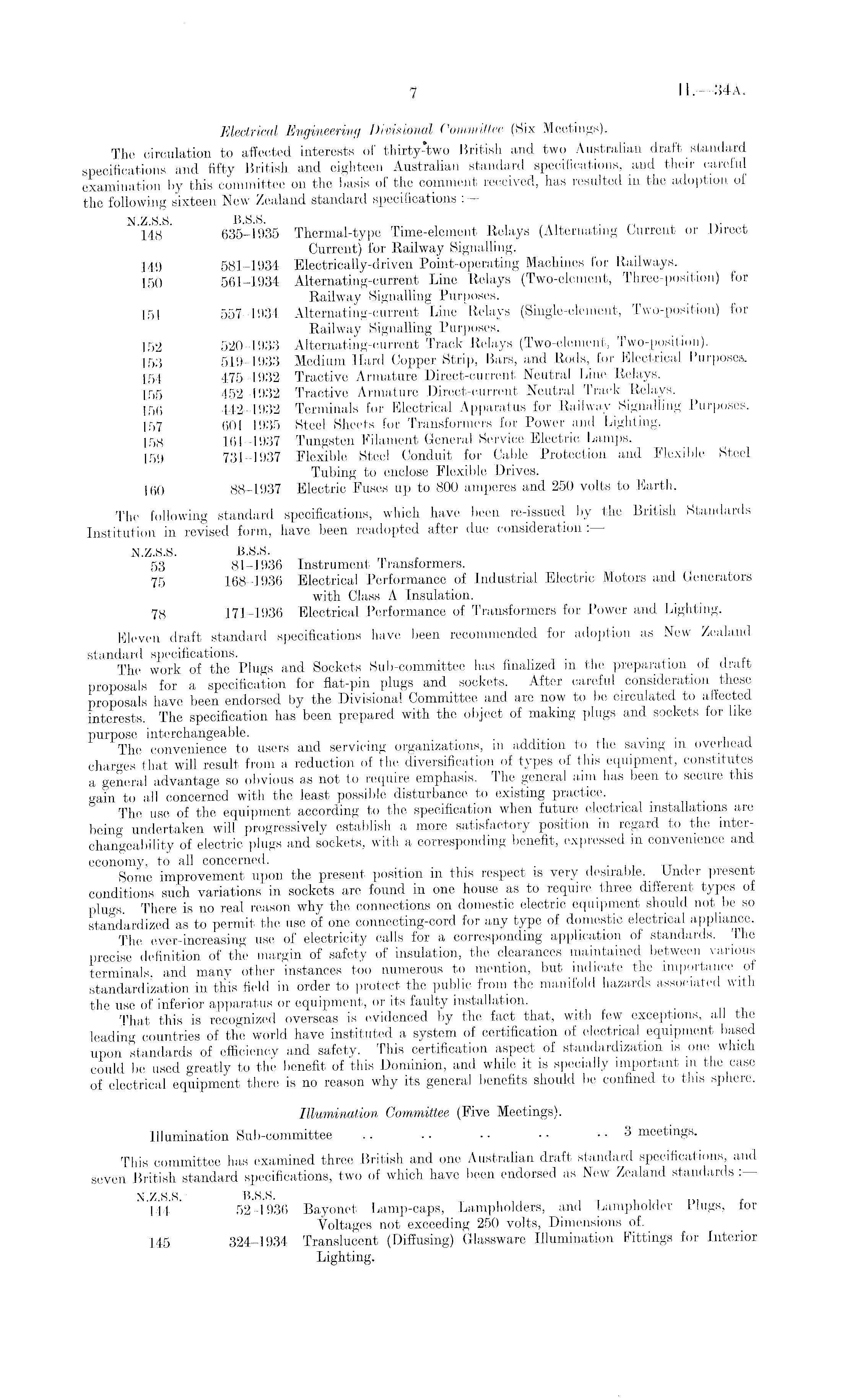 Electrical Engineering Divisional Committee (Six Meetings). The circulation to affected interests of thirty-two British and two Australian draft standard specifications and fifty British and eighteen Australian standard specifications, and their careful examination by this committee on the basis of the comment received, has resulted in the adoption of the following sixteen New Zealand standard specifications : — 148 ' 635-1935 Thermal-type Time-element Relays (Alternating Current or Direct Current) for Railway Signalling. 149 581-1934 Electrically-driven Point-operating Machines for Railways. 150 561-1934 Alternating-current Line Relays (Two-clement, Three-position) for Railway Signalling Purposes. 151 557-1934 Alternating-current Line 'Relays (Single-element, Two-position) for Railway Signalling Purposes. 152 520-1933 Alternating-current Track Relays (Two-element, Two-position). 153 519-1933 Medium Hard Copper Strip, Bars, and Rods, for Electrical Purposes. 154 475-1932 Tractive Armature Direct-current Neutral Line Relays. 155 452-1932 Tractive Armature Direct-current Neutral Track Relays. 156 442-1932 Terminals for Electrical Apparatus for Railway Signalling Purposes. 157 601-1935 Steel Sheets for Transformers for Power and Lighting. 158 161-1937 Tungsten Filament General Service Electric Lamps. 159 731-1937 Flexible Steel Conduit for Cable Protection and Flexible Steel Tubing to enclose Flexible Drives. 160 88-1937 Electric Fuses up to 800 amperes and 250 volts to Earth. The following standard specifications, which have been re-issued by the British Standards Institution in revised form, have been readopted after due consideration :— N.Z.S.S. B.S.S. 53 81-1936 Instrument Transformers. 75 168-1936 Electrical Performance of Industrial Electric Motors and Generators with Class A Insulation. 78 171-1936 Electrical Performance of Transformers for Power and Lighting. Eleven draft standard specifications have been recommended for adoption as New Zealand standard specifications. The work of the Plugs and Sockets Sub-committee has finalized in the preparation of draft proposals for a specification for flat-pin plugs and sockets. After careful consideration these proposals have been endorsed by the Divisional Committee and are now to be circulated to affected interests. The specification has been prepared with the object of making plugs and sockets for like purpose interchangeable. . . The convenience to users and servicing organizations, in addition to the saving in overhead charges that will result from a reduction of the diversification of types of this equipment, constitutes a general advantage so obvious as not to require emphasis. The general aim has been to secure this gain to all concerned with the least possible disturbance to existing practice. The use of the equipment according to the specification when future electrical installations are being undertaken will progressively establish a more satisfactory position in regard to the interchangeability of electric plugs and sockets, with a corresponding benefit, expressed in convenience and economy, to all concerned. , Some improvement upon the present position in this respect is very desirable. Under present conditions such variations in sockets are found in one house as to require three different types of plugs. There is no real reason why the connections on domestic electric equipment should not be so standardized as to permit the use of one connecting-cord for any type of domestic electrical appliance. The ever-increasing use of electricity calls for a corresponding application of standards. The precise definition of the margin of safety of insulation, the clearances maintained between various terminals and many other instances too numerous to mention, but indicate the importance of standardization in this field in order to protect the public from the manifold hazards associated with the use of inferior apparatus or equipment, or its faulty installation. That this is recognized overseas is evidenced by the fact that, with few exceptions, all the leading countries of the world have instituted a system of certification of electrical equipment based upon standards of efficiency and safety. This certification aspect of standardization is one which could be used greatly to the benefit of this Dominion, and while it is specially important in the case of electrical equipment there is no reason why its general benefits should be confined to this sphere. Illumination Committee (Five Meetings). Illumination Sub-committee .. .. • • • • • ■ 3 meetings. This committee has examined three British and one Australian draft standard specifications, and seven British standard specifications, two of which have been endorsed as New Zealand standards :— N.Z.S.S. B.S.S. 144 52-1936 Bayonet Lamp-caps, Lampholders, and Lampholder Plugs, tor Voltages not exceeding 250 volts, Dimensions of. 145 324-1934 Translucent (Difiusing) Glassware Illumination Fittings for Interior Lighting.