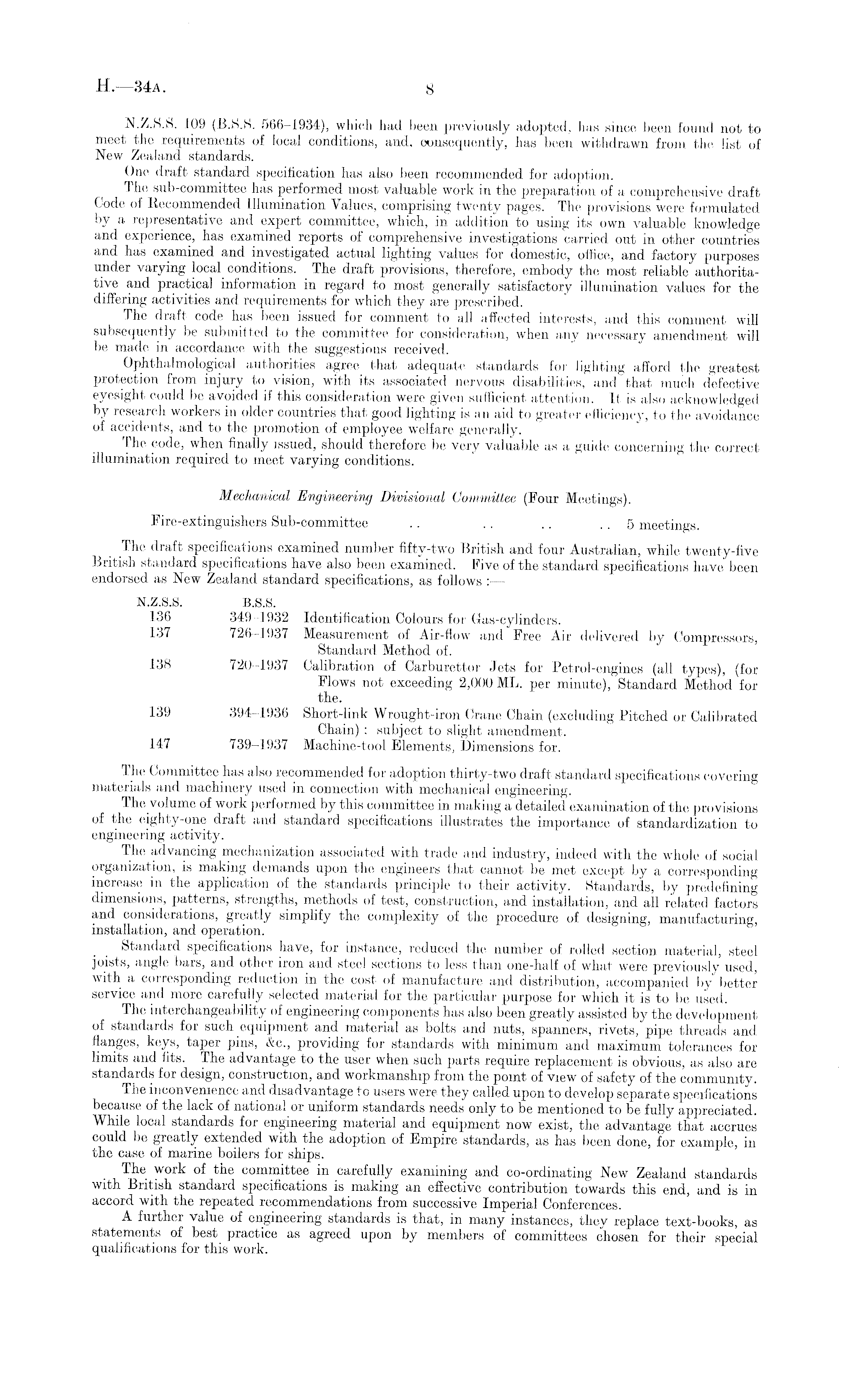 N.Z.S.S. 109 (B.S.S. 566-1934), which had been previously adopted, has since been found not to meet the requirements of local conditions, and. consequently, has been withdrawn from the list of New Zealand standards. One draft standard specification has also been recommended for adoption. The sub-committee has performed most valuable work in the preparation of a comprehensive draft Code of Recommended Illumination Values, comprising twenty pages. The provisions were formulated by a representative and expert committee, which, in addition to using its own valuable knowledge and experience, has examined reports of comprehensive investigations carried out in other countries and has examined and investigated actual lighting values for domestic, office, and factory purposes under varying local conditions. The draft provisions, therefore, embody the most reliable authoritative and practical information in regard to most generally satisfactory illumination values for the differing activities and requirements for which they are prescribed. The draft code has been issued for comment to all affected interests, and this comment will subsequently be submitted to the committee for consideration, when any necessary amendment will be made in accordance with the suggestions received. Ophthalmological authorities agree that adequate standards for lighting afford the greatest protection from injury to vision, with its associated nervous disabilities," and that much defective eyesight could be avoided if this consideration were given sufficient attention. It is also acknowledged by research workers in older countries that good lighting is an aid to greater efficiency, to the avoidance of accidents, and to the promotion of employee welfare generally. The code, when finally issued, should therefore be very valuable as a guide concerning the correct illumination required to meet varying conditions. Mechanical Engineering Divisional Committee (Four Meetings). Fire-extinguishers Sub-committee .. .. .. .. 5 meetings. The draft specifications examined number fifty-two British and four Australian, while twenty-five British standard specifications have also been examined. Five of the standard specifications have been endorsed as New Zealand standard specifications, as follows : — N.Z.S.S. B.S.S. 136 349-1932 Identification Colours for Gas-cylinders. 137 726-1937 Measurement of Air-flow and Free Air delivered by Compressors, Standard Method of. 138 720-1937 Calibration of Carburettor Jets for Petrol-engines (all types), (for Flows not exceeding 2,000 ML. per minute), Standard Method for the. 139 394-1936 Short-link Wrought-iron Crane Chain (excluding Pitched or Calibrated Chain) ; subject to slight amendment. 147 739-1937 Machine-tool Elements, Dimensions for. The Committee has also recommended for adoption thirty-two draft standard specifications covering materials and machinery used in connection with mechanical engineering. The volume of work performed by this committee in making a detailed examination of the provisions of the eighty-one draft and standard specifications illustrates the importance of standardization to engineering activity. The advancing mechanization associated with trade and industry, indeed with the whole of social organization, is making demands upon the engineers that cannot be met except by a corresponding increase in the application of the standards principle to their activity. Standards, by predefining dimensions, patterns, strengths, methods of test, construction, and installation, and all related factors and considerations, greatly simplify the complexity of the procedure of designing, manufacturing, installation, and operation. Standard specifications have, for instance, reduced the number of rolled section material, steel joists, angle bars, and other iron and steel sections to less than one-half of what were previously used, with a corresponding reduction in the cost of manufacture and distribution, accompanied by better service and more carefully selected material for the particular purpose for which it is to be used. The interchangeably of engineering components has also been greatly assisted by the development of standards for such equipment and material as bolts and nuts, spanners, rivets, pipe threads and flanges, keys, taper pins, &c, providing for standards with minimum and maximum tolerances for limits and fits. The advantage to the user when such parts require replacement is obvious, as also are standards for design, construction, and workmanship from the point of view of safety of the community. The inconvenience and disadvantage to users were they called upon to develop separate specifications because of the lack of national or uniform standards needs only to be mentioned to be fully appreciated. While local standards for engineering material and equipment now exist, the advantage that accrues could be greatly extended with the adoption of Empire standards, as has been done, for example, in the case of marine boilers for ships. The work of the committee in carefully examining and co-ordinating New Zealand standards with British standard specifications is making an effective contribution towards this end, and is in accord with the repeated recommendations from successive Imperial Conferences. A further value of engineering standards is that, in many instances, they replace text-books, as statements of best practice as agreed upon by members of committees chosen for their special qualifications for this work.