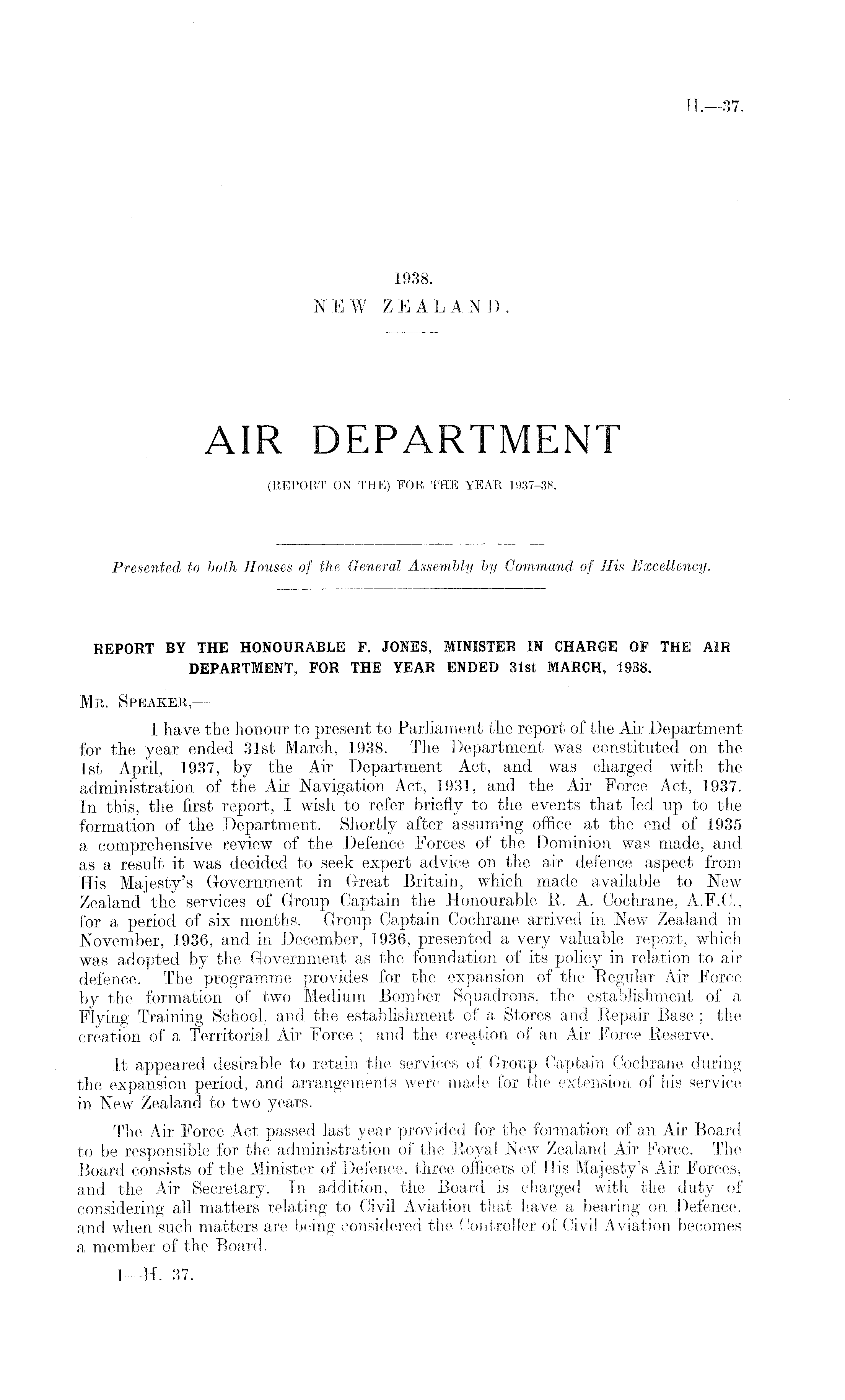 REPORT BY THE HONOURABLE F. JONES, MINISTER IN CHARGE OF THE AIR DEPARTMENT, FOR THE YEAR ENDED 31st MARCH, 1938. Mr. Speaker,— I have the honour to present to Parliament the report of the Air Department for the year ended 31st March, 1938. The Department was constituted on the Ist April, 1937, by the Air Department Act, and was charged with the administration of the Air Navigation Act, 1931, and the Air Force Act, 1937. In this, the first report, I wish to refer briefly to the events that led up to the formation of the Department. Shortly after assuming office at the end of 1935 a comprehensive review of the Defence Forces of the Dominion was made, and as a result it was decided to seek expert advice on the air defence aspect from His Majesty's Government in Great Britain, which made available to New Zealand the services of Group Captain the Honourable 11. A. Cochrane, A.F.C., for a period of six months. Group Captain Cochrane arrived in New Zealand in November, 1936, and in December, 1936, presented a very valuable report, which was adopted by the Government as the foundation of its policy in relation to air defence. The programme provides for the expansion of the Regular Air Force by the formation of two Medium Bomber Squadrons, the establishment of a Flying Training School, and the establishment of a Stores and Repair Base ; the creation of a Territorial Air Force ; and the creation of an Air Force Reserve. It appeared desirable to retain the services of Group Captain Cochrane during the expansion period, and arrangements were made for the extension of his service in New Zealand to two years. The Air Force Act passed last year provided for the formation of an Air Board to be responsible for the administration of the Royal New Zealand Air Force. The Board consists of the Minister of Defence, three officers of His Majesty's Air Forces, and the Air Secretary. In addition, the Board is charged with the duty of considering all matters relating to Civil Aviation that have a bearing on Defence, and when such matters are being considered the Controller of Civil Aviation becomes a member of the Board.