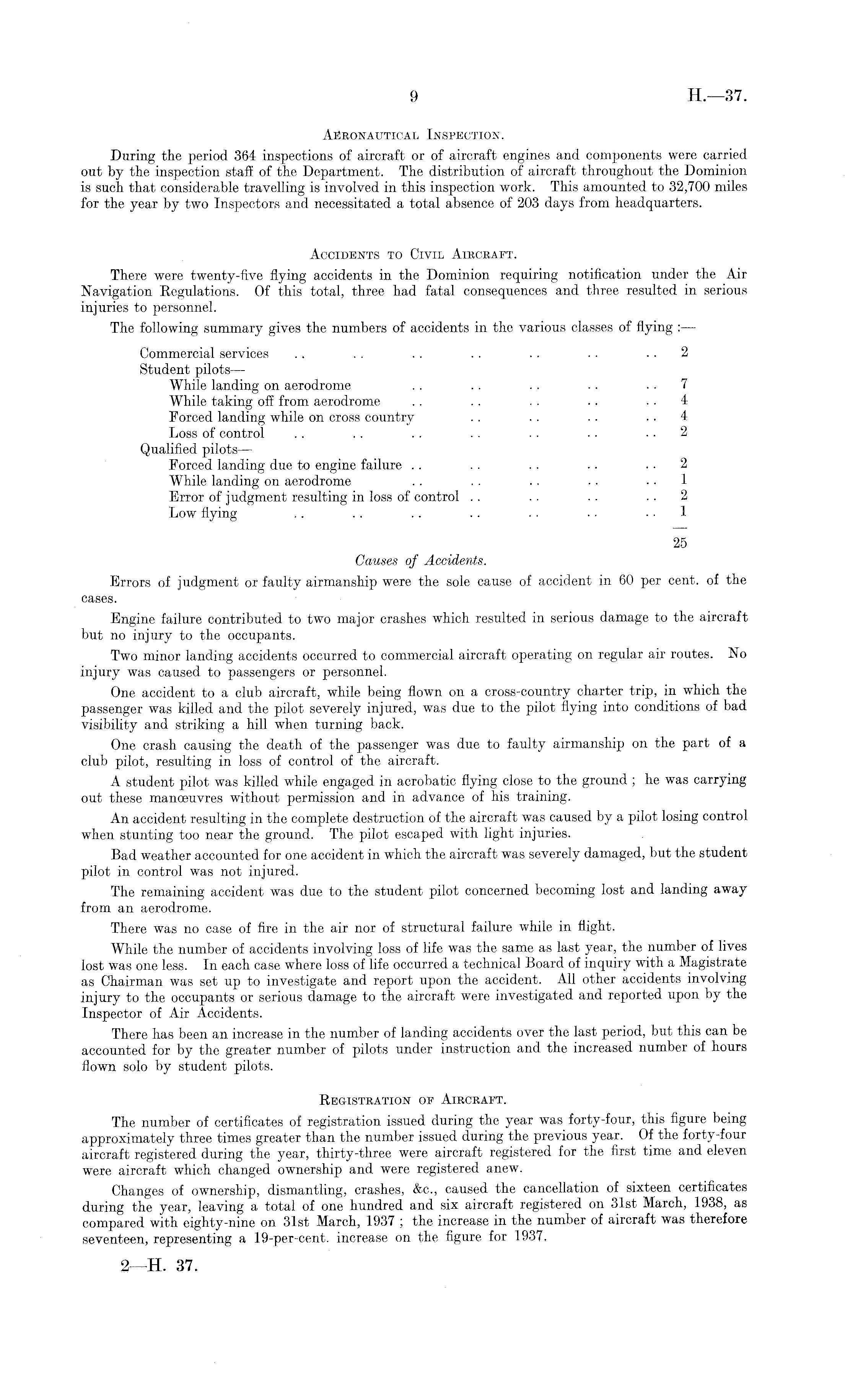 Aeronautical Inspection. During the period 364 inspections of aircraft or of aircraft engines and components were carried out by the inspection staff of the Department. The distribution of aircraft throughout the Dominion is such that considerable travelling is involved in this inspection work. This amounted to 32,700 miles for the year by two Inspectors and necessitated a total absence of 203 days from headquarters. Accidents to Civil Aircraft. There were twenty-five flying accidents in the Dominion requiring notification under the Air Navigation Regulations. Of this total, three had fatal consequences and three resulted in serious injuries to personnel. The following summary gives the numbers of accidents in the various classes of flying : — Commercial services .. . . . . . . . . •. 2 Student pilots — While landing on aerodrome . . .. . . .. .. 7 While taking off from aerodrome . . . . . . .. 4 Forced landing while on cross country . . . . .. 4 Loss of control .. .. .. . . ■ • • ■ . . 2 Qualified pilots— Forced landing due to engine failure . . . . .. .. 2 While landing on aerodrome . . . . .. . . .. 1 Error of judgment resulting in loss of control . . . . . . . . 2 Low flying .. .. .. .. .. •. 1 25 Causes of Accidents. Errors of judgment or faulty airmanship were the sole cause of accident in 60 per cent, of the cases. Engine failure contributed to two major crashes which resulted in serious damage to the aircraft but no injury to the occupants. Two minor landing accidents occurred to commercial aircraft operating on regular air routes. No injury was caused to passengers or personnel. One accident to a club aircraft, while being flown on a cross-country charter trip, in which the passenger was killed and the pilot severely injured, was due to the pilot flying into conditions of bad visibility and striking a hill when turning back. One crash causing the death of the passenger was due to faulty airmanship on the part of a club pilot, resulting in loss of control of the aircraft. A student pilot was killed while engaged in acrobatic flying close to the ground ; he was carrying out these manoeuvres without permission and in advance of his training. An accident resulting in the complete destruction of the aircraft was caused by a pilot losing control when stunting too near the ground. The pilot escaped with light injuries. Bad weather accounted for one accident in which the aircraft was severely damaged, but the student pilot in control was not injured. The remaining accident was due to the student pilot concerned becoming lost and landing away from an aerodrome. There was no case of fire in the air nor of structural failure while in flight. While the number of accidents involving loss of life was the same as last year, the number of lives lost was one less. In each case where loss of life occurred a technical Board of inquiry with a Magistrate as Chairman was set up to investigate and report upon the accident. All other accidents involving injury to the occupants or serious damage to the aircraft were investigated and reported upon by the Inspector of Air Accidents. There has been an increase in the number of landing accidents over the last period, but this can be accounted for by the greater number of pilots under instruction and the increased number of hours flown solo by student pilots. Registration oe Aircraft. The number of certificates of registration issued during the year was forty-four, this figure being approximately three times greater than the number issued during the previous year. Of the forty-four aircraft registered during the year, thirty-three were aircraft registered for the first time and eleven were aircraft which changed ownership and were registered anew. Changes of ownership, dismantling, crashes, &c., caused the cancellation of sixteen certificates during the year, leaving a total of one hundred and six aircraft registered on 31st March, 1938, as compared with eighty-nine on 31st March, 1937 ; the increase in the number of aircraft was therefore seventeen, representing a 19-per-cent. increase on the figure for 1937,