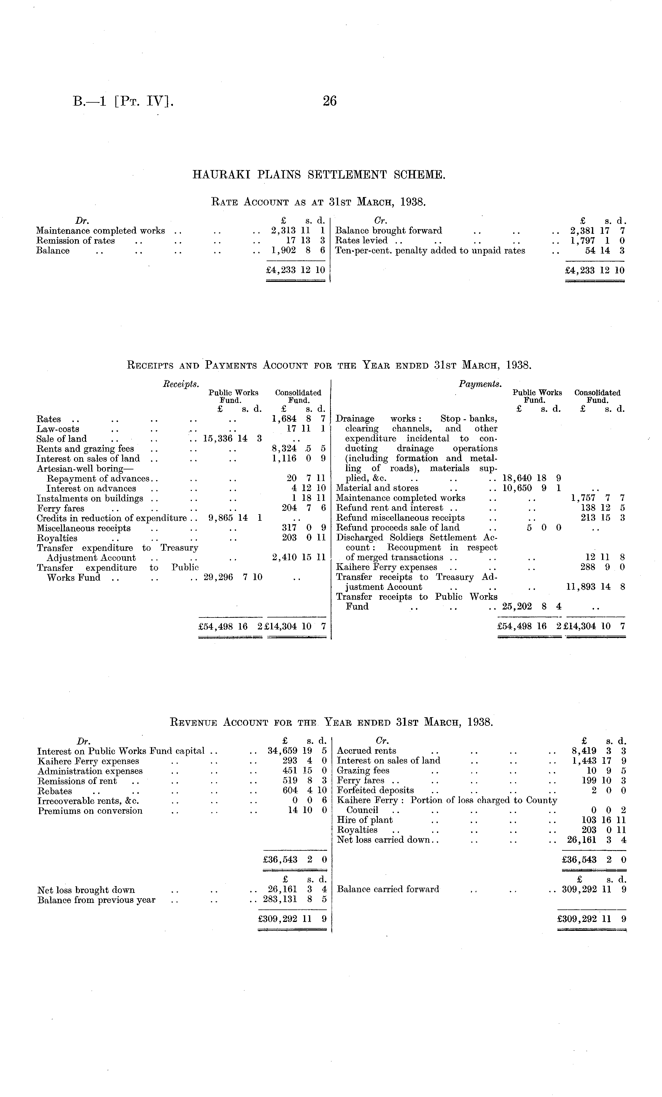 HAURAKI PLAINS SETTLEMENT SCHEME. Rate Account as at 31st March, 1938. Dr. £ s. d. Cr. £ s. d. Maintenance completed works .. .. .. 2,313 11 1 Balance brought forward .. .. .. 2,381 17 7 Remission of rates .. .. .. .. 17 13 3 Rates levied .. .. .. .. .. 1,797 1 0 Balance .. .. .. .. 1,902 8 6 Ten-per-cent. penalty added to unpaid rates .. 54 14 3 £4,233 12 10 £4,233 12 10 Receipts and Payments Account for the Year ended 31st March, 1938. Receipts. Payments. Public Works Consolidated Public Works Consolidated Fund. Fund. Fund. Fund. £ s. d. £ s. d. £ s. d. £ s. d. Rates .. .. .. .. .. 1,684 8 7 Drainage works: Stop - banks, Law-costs .. .. ... .. 17 11 1 clearing channels, and other Sale of land .. .. .. 15,336 14 3 .. expenditure incidental to conRents and grazing fees .. .. .. 8,324 .5 5 ducting drainage operations Interest on sales of land .. .. .. 1,11609 (including formation and metal-Artesian-well boring— ling of roads), materials supRepayment of advances.. .. .. 20 7 11 plied, &c. .. .. .. 18,640 18 9 Interest on advances .. .. .. 412 10 Material and stores .. .. 10,650 9 1 Instalments on buildings .. .. .. 1 18 11 Maintenance completed works .. .. 1,757 7 7 Ferry fares .. .. .. .. 204 7 6 Refund rent and interest .. .. .. 138 12 5 Credits in reduction of expenditure .. 9,865 14 1 .. Refund miscellaneous receipts .. .. 213 15 3 Miscellaneous receipts .. .. .. 317 0 9 Refund proceeds sale of land .. 5 0 0 Royalties .. .. .. .. 203 0 11 Discharged Soldiers Settlement AcTransfer expenditure to Treasury count: Recoupment in respect Adjustment Account .. .. .. 2,410 15 11 of merged transactions .. .. .. 12 11 8 Transfer expenditure to Public Kaihere Ferry expenses .. .. .. 288 9 0 Works Fund .. .. .. 29,296 7 10 .. Transfer receipts to Treasury Adjustment Account .. .. .. 11,893 14 8 Transfer receipts to Public Works Fund .. .. .. 25,202 8 4 £54,498 16 2£14,304 10 7 £54,498 16 2£14,304 10 7 Revenue Account for the Year ended 31st March, 1938. Dr. £ s. d. Cr. £ s. d. Interest on Public Works Fund capital .. .. 34,659 19 5 Accrued rents .. .. .. .. 8,419 3 3 Kaihere Ferry expenses .. .. .. 293 4 0 Interest on sales of land .. .. .. 1,443 17 9 Administration expenses .. .. .. 451 15 0 Grazing fees .. . . .. .. 10 9 5 Remissions of rent .. .. .. .. 519 8 3 Ferry lares .. .. .. .. .. 199 10 3 Rebates .. .. . • • • .. 604 410 Forfeited deposits .. .. .. .. 2 0 0 Irrecoverable rents, &c. .. .. .. 0 0 6 Kaihere Ferry : Portion of loss charged to County Premiums on conversion .. .. .. 14 10 0 Council .. .. .. .. .. 002 Hire of plant .. .. .. .. 103 16 11 Royalties .. .. .. .. .. 203 011 Net loss carried down.. .. .. .. 26,161 3 4 £36,543 2 0 £36,543 2 0 £ s. d. £ s. d. Net loss brought down .. .. .. 26,161 3 4 Balance carried forward ~ .. .. 309,292 11 9 Balance from previous year .. .. .. 283,131 8 5 £309,292 11 9 £309,292 11 9