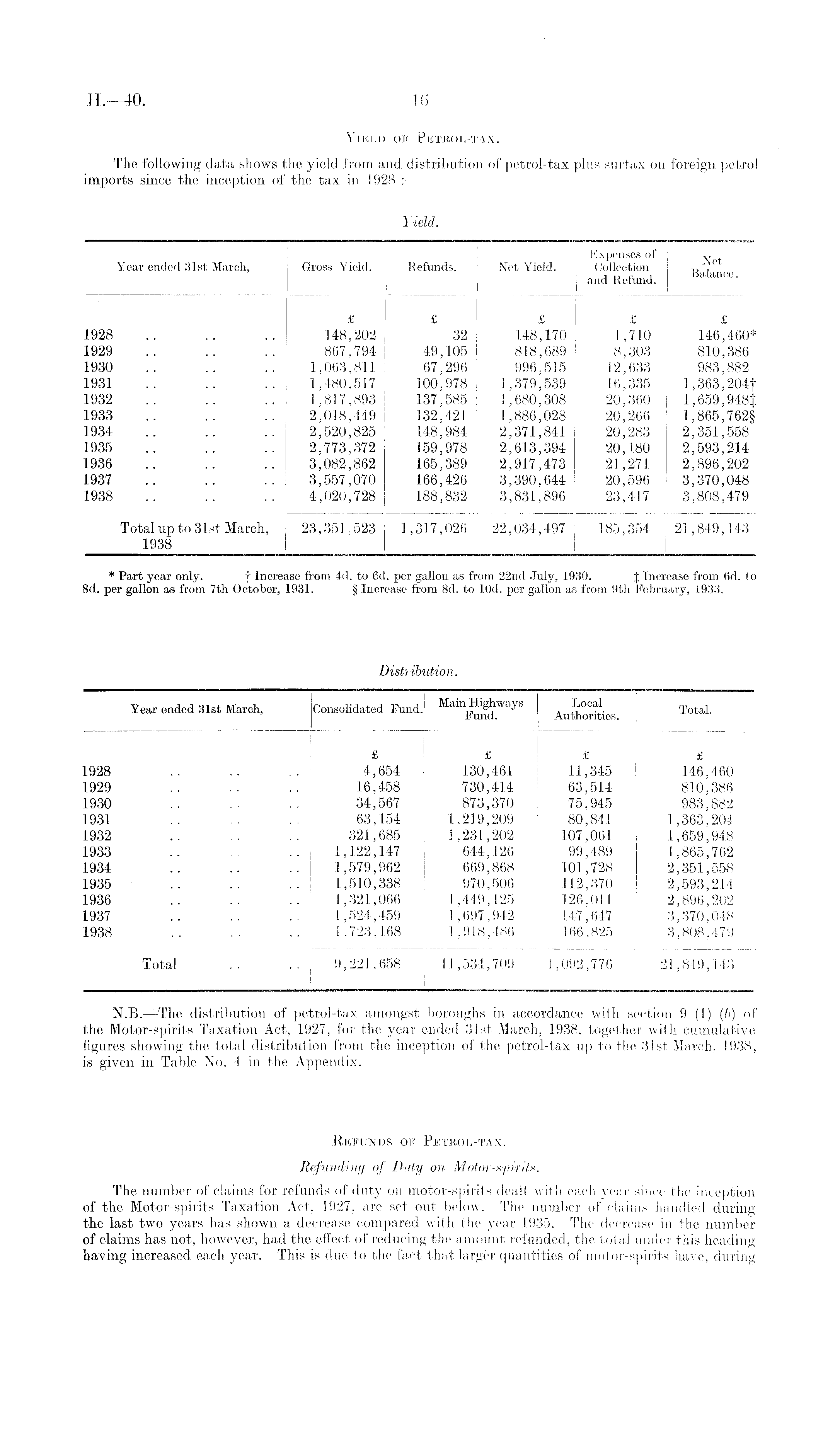 Expenses of « , Year ended 31st March, Gross Yield. Refunds. Net Yield. Collection -r. , 6 j r> r j -Balance, and Kelund. £ £ £ £ £ 1928 .. .. .. 148,202 32 148,170 1,710 146,460* 1929 .. .. .. 867,794 49,105 818,689 8,303 810,386 1930 .. .. .. 1,063,811 67,296 996,515 12,633 983,882 1931 .. .. .. 1,480,517 100,978 1,379,539 16,335 l,363,204f 1932 .. .. .. 1,817,893 137,585 1,680,308 20,360 1,659,948$ 1933 .. .. .. 2,018,449 132,421 1,886,028 20,266 1,865,762§ 1934 .. .. .. 2,520,825 148,984 2,371,841 20,283 2,351,558 1935 .. .. .. 2,773,372 159,978 2,613,394 20,180 2,593,214 1936 .. .. .. 3,082,862 165,389 2,917,473 21,271 2,896,202 1937 .. .. .. 3,557,070 166,426 3,390.644 20,596 3,370,048 1938 .. .. .. 4,020,728 188,832 3,831,896 23,417 3,808,479 Total up to 31 st March, 23,351.523 1,317,026 22,034,497 185,354 21,849,143 1938 _ * Part year only. f Increase from 4d. to 6d. per gallon as from 22nd July, 1930. J Increase from 6d. to 8d. per gallon as from 7th October, 1931. § Increase from 8d. to lOd. per gallon as from 9th February, 1933.