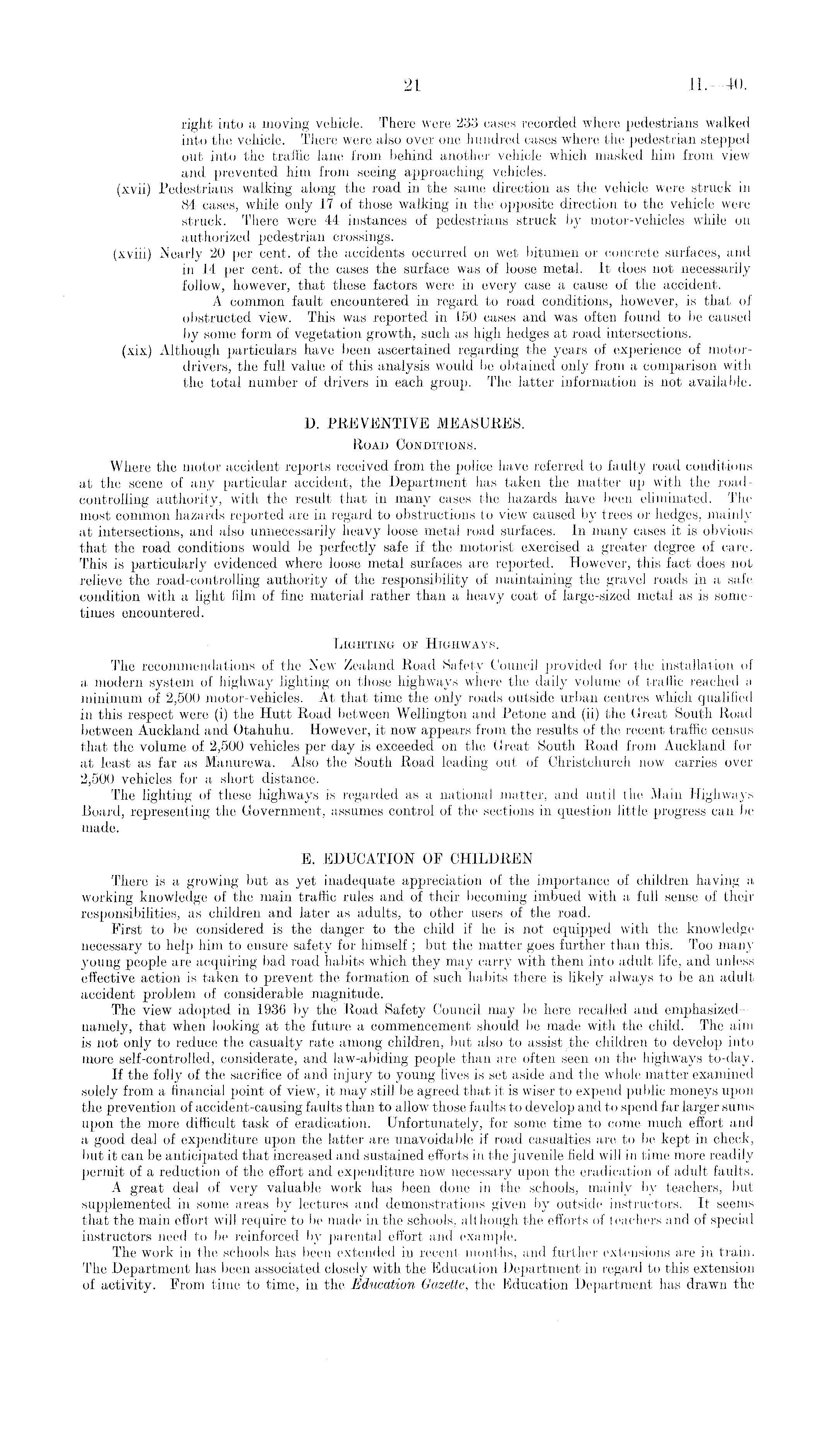 right into a moving vehicle. There were 233 cases recorded where pedestrians walked into the vehicle. There were also over one hundred cases where the pedestrian stepped out into the traffic lane from behind another vehicle which masked him from view and prevented him from seeing approaching vehicles. (xvii) Pedestrians walking along the road in the same direction as the vehicle were struck in 84 cases, while only 17 of those walking in the opposite direction to the vehicle were struck. There were 44 instances of pedestrians struck by motor-vehicles while on authorized pedestrian crossings. (xviii) Nearly 20 per cent, of the accidents occurred on wet bitumen or concrete surfaces, and in 14 per cent, of the cases the surface was of loose metal. It does not necessarily follow, however, that these factors were in every case a cause of the accident. A common fault encountered in regard to road conditions, however, is that of obstructed view. This was reported in .150 cases and was often found to be caused by some form of vegetation growth, such as high hedges at road intersections, (xix) Although particulars have been ascertained regarding the years of experience of motordrivers, the full value of this analysis would be obtained only from a comparison with the total number of drivers in each group. The latter information is not available. D. PREVENTIVE MEASURES. Road Conditions. Where the motor accident reports received from the police have referred to faulty road conditions at the scene of any particular accident, the Department has taken the matter up with the roadcontrolling authority, with the result that in many cases the hazards have been eliminated. The most common hazards reported are in regard to obstructions to view caused by trees or hedges, mainly at intersections, and also unnecessarily heavy loose metal road surfaces. In many cases it is obvious that the road conditions would be perfectly safe if the motorist exercised a greater degree of care. This is particularly evidenced where loose metal surfaces are reported. However, this fact does not relieve the road-controlling authority of the responsibility of maintaining the gravel roads in a safe condition with a light film of fine material rather than a heavy coat of large-sized metal as is sometimes encountered. Lighting of Highways. The recommendations of the New Zealand Road Safety Council provided for the installation of a modern system of highway lighting on those highways where the daily volume of traffic reached a minimum of 2,500 motor-vehicles. At that time the only roads outside urban centres which qualified iu this respect were (i) the Hutt Road between Wellington and Petone and (ii) the Great South Road between Auckland and Otahuhu. However, it now appears from the results of the recent traffic census that the volume of 2,500 vehicles per day is exceeded on the Great South Road from Auckland for at least as far as Manurewa. Also the South Road leading out of Christchurch now carries over 2,500 vehicles for a short distance. The lighting of these highways is regarded as a national matter, and until the Main Highways Board, representing the Government, assumes control of the sections in question little progress can be made. E. EDUCATION OF CHILDREN There is a growing but as yet inadequate appreciation of the importance of children having a working knowledge of the main traffic rules and of their becoming imbued with a full sense of their responsibilities, as children and later as adults, to other users of the road. First to be considered is the danger to the child if he is not equipped with the knowledge necessary to help him to ensure safety for himself ; but the matter goes further than this. Too many young people are acquiring bad road habits which they may carry with them into adult life, and unless effective action is taken to prevent the formation of such habits there is likely always to be an adult accident problem of considerable magnitude. The view adopted in 1936 by the Road Safety Council may be here recalled and emphasized — namely, that when looking at the future a commencement should be made with the child. The aim is not only to reduce the casualty rate among children, but also to assist .the children to develop into more self-controlled, considerate, and law-abiding people than are often seen on the highways to-day. If the folly of the sacrifice of and injury to young lives is set aside and the whole matter examined solely from a financial point of view, it may still be agreed that it is wiser to expend public moneys upon the prevention of accident-causing faults than to allow those faults to develop and to spend far larger sums upon the more difficult task of eradication. Unfortunately, for some time to come much effort and a good deal of expenditure upon the latter are unavoidable if road casualties are to be kept in check, but it can be anticipated that increased and sustained efforts in the juvenile field will in time more readily permit of a reduction of the effort and expenditure now necessary upon the eradication of adult faults. A great deal of very valuable work has been done in the schools, mainly by teachers, but supplemented in some areas by lectures and demonstrations given by outside instructors. It seems that the main effort will require to be made in the schools, although the efforts of teachers and of special instructors need to be reinforced by parental effort and example. The work in the schools has been extended in recent months, and further extensions are in train. The Department has been associated closely with the Education Department in regard to this extension of activity. From time to time, in the Education Gazette, the Education Department has drawn the