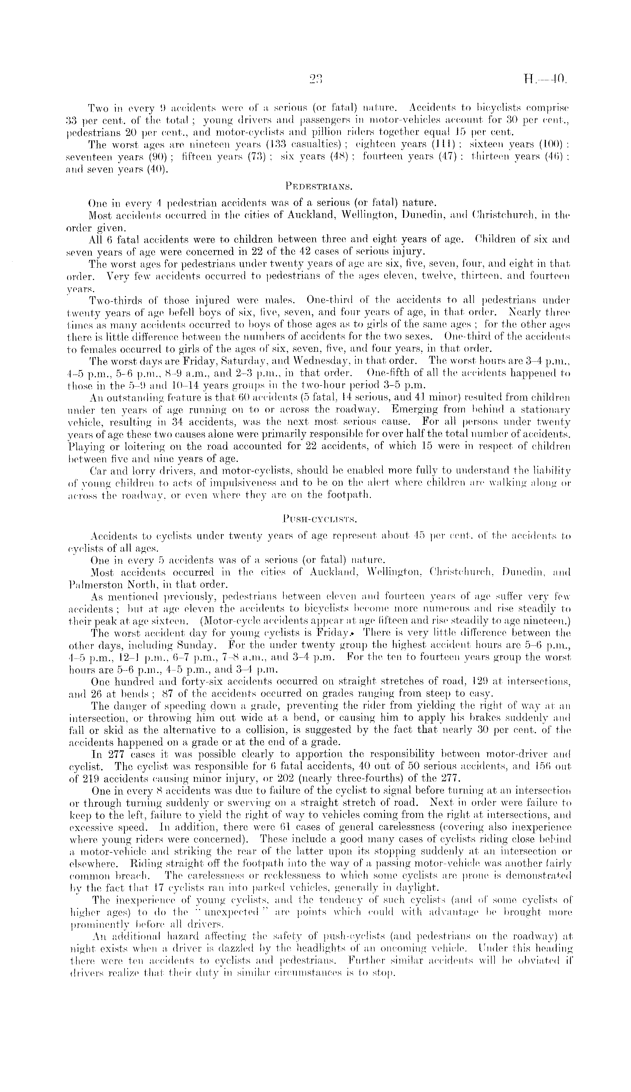 Two in every 9 accidents were of a serious (or fatal) nature. Accidents to bicyclists comprise 33 per cent, of the total ; young drivers and passengers in motor-vehicles account for 30 per cent., pedestrians 20 per cent., and motor-cyclists and pillion riders together equal 15 per cent. The worst ages are nineteen years (133 casualties) ; eighteen years (111) ; sixteen years (100) ; seventeen years (90) ; fifteen years (73) ; six years (48) ; fourteen years (47) ; thirteen years (46) ; and seven years (40). Pedestrians. One in every 4 pedestrian accidents was of a serious (or fatal) nature. Most accidents occurred in the cities of Auckland, Wellington, Dunedin, and Christchurch, in the order given. All 6 fatal accidents were to children between three and eight years of age. Children of six and seven years of age were concerned in 22 of the 42 cases of serious injury. The worst ages for pedestrians under twenty years of age are six, five, seven, four, and eight in that order. Very few accidents occurred to pedestrians of the ages eleven, twelve, thirteen, and fourteen years. Two-thirds of those injured were males. One-third of the accidents to all pedestrians under twenty years of age befell boys of six, five, seven, and four years of age, in that order. Nearly three times as many accidents occurred to boys of those ages as to girls of the same ages ; for the other ages there is little difference between the numbers of accidents for the two sexes. One-third of the accidents to females occurred to girls of the ages of six, seven, five, and four years, in that order. The worst days are Friday, Saturday, and Wednesday, in that order. The worst hours are 3-4 p.m., 4-5 p.m., 5-6 p.m., 8-9 a.m., and 2-3 p.m., in that order. One-fifth of all the accidents happened to those in the 5-9 and 10-14 years groups in the two-hour period 3-5 p.m. An outstanding feature is that 60 accidents (5 fatal, 14 serious, and 41 minor) resulted from children under ten years of age running on to or across the roadway. Emerging from behind a stationary vehicle, resulting in 34 accidents, was the next most serious cause. For all persons under twenty years of age these two causes alone were primarily responsible for over half the total number of accidents. Playing or loitering on the road accounted for 22 accidents, of which 15 were in respect of children between five and nine years of age. Car and lorry drivers, and motor-cyclists, should be enabled more fully to understand the liability of young children to acts of impulsiveness and to be on the alert where children are walking along or across the roadway, or even where they are on the footpath. Push-cyclists. Accidents to cyclists under twenty years of age represent about 45 per cent, of the accidents to cyclists of all ages. One in every 5 accidents was of a serious (or fatal) nature. Most accidents occurred in the cities of Auckland, Wellington, Christchurch, Dunedin, and Palmerston North, in that order. As mentioned previously, pedestrians between eleven and fourteen years of age suffer very few accidents ; but at age eleven the accidents to bicyclists become more numerous and rise steadily to their peak at age sixteen. (Motor-cycle accidents appear at age fifteen and rise steadily to age nineteen.) The worst accident day for young cyclists is Friday.. There is very little difference between the other days, including Sunday. For the under twenty group the highest accident hours are 5-6 p.m., 4-5 p.m., 12-1 p.m., 6-7 p.m., 7-8 a.m., and 3-4 p.m. For the ten to fourteen years group the worst hours are 5-6 p.m., 4-5 p.m., and 3-4 p.m. One hundred and forty-six accidents occurred on straight stretches of road, 129 at intersections, and 26 at bends ; 87 of the accidents occurred on grades ranging from steep to easy. The danger of speeding down a grade, preventing the rider from yielding the right of way at an intersection, or throwing him out wide at a bend, or causing him to apply his brakes suddenly and fall or skid as the alternative to a collision, is suggested by the fact that nearly 30 per cent, of the accidents happened on a grade or at the end of a grade. In 277 cases it was possible clearly to apportion the responsibility between motor-driver and cyclist. The cyclist was responsible for 6 fatal accidents, 40 out of 50 serious accidents, and 156 out of 219 accidents causing minor injury, or 202 (nearly three-fourths) of the 277. One in every 8 accidents was due to failure of the cyclist to signal before turning at an intersection or through turning suddenly or swerving on a straight stretch of road. Next in order were failure to keep to the left, failure to yield the right of way to vehicles coming from the right at intersections, and excessive speed. In addition, there were 61 cases of general carelessness (covering also inexperience where young riders were concerned). These include a good many cases of cyclists riding close behind a motor-vehicle and striking the rear of the latter upon its stopping suddenly at an intersection or elsewhere. Riding straight off the footpath into the way of a passing motor-vehicle was another fairly common breach. The carelessness or recklessness to which some cyclists are prone is demonstrated by the fact that 17 cyclists ran into parked vehicles, generally in daylight. The inexperience of young cyclists, and the tendency of such cyclists (and of some cyclists of higher ages) to do the " unexpected " are points which could with advantage be brought more prominently before all drivers. An additional hazard affecting the safety of push-cyclists (and pedestrians on the roadway) at night exists when a driver is dazzled by the headlights of an oncoming vehicle. Under this heading there were ten accidents to cyclists and pedestrians. Further similar accidents will be obviated if drivers realize that their duty in similar circumstances is to stop.