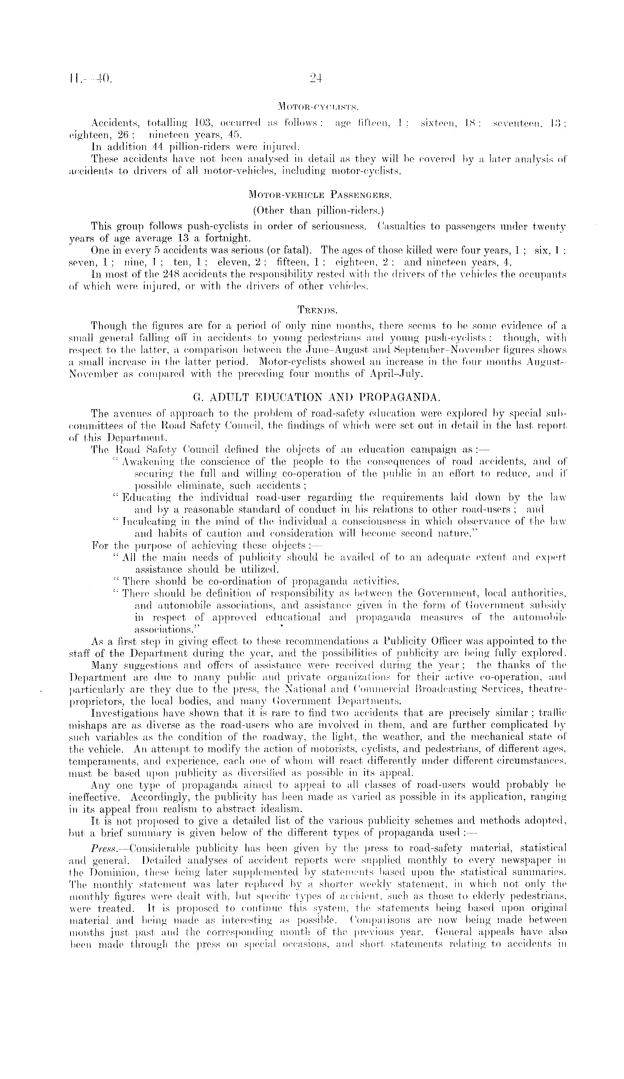 Motor-cyclists. Accidents, totalling 103, occurred as follows : age fifteen, 1 ; sixteen, 18 ; seventeen, 13 ; eighteen, 26 ; nineteen years, 45. In addition 44 pillion-riders were injured. These accidents have not been analysed in detail as they will be covered by a later analysis of accidents to drivers of all motor-vehicles, including motor-cyclists. Motor-vehicle Passengers. (Other than pillion-riders.) This group follows push-cyclists in order of seriousness. Casualties to passengers under twenty years of age average 13 a fortnight. One in every 5 accidents was serious (or fatal). The ages of those killed were four years, 1 ; six, 1 ; seven, 1 ; nine, 1 ; ten, 1 ; eleven, 2 ; fifteen, 1 ; eighteen, 2 ; and nineteen years, 4. In most of the 248 accidents the responsibility rested with the drivers of the vehicles the occupants of which were injured, or with the drivers of other vehicles. Trends. Though the figures are for a period of only nine months, there seems to be some evidence of a small general falling off in accidents to young pedestrians and young push-cyclists ; though, with respect to the latter, a comparison between the June-August and September-November figures shows a small increase in the latter period. Motor-cyclists showed an increase in the four months AugustNovember as compared with the preceding four months of April-July. G. ADULT EDUCATION AND PROPAGANDA. The avenues of approach to the problem of road-safety education were explored by special subcommittees of the Road Safety Council, the findings of which were set out in detail in the last report of this Department. The Road Safety Council defined the objects of an education campaign as: — " Awakening the conscience of the people to the consequences of road accidents, and of securing the full and willing co-operation of the public in an effort to reduce, and if possible eliminate, such accidents ; " Educating the individual road-user regarding the requirements laid down by the law and by a reasonable standard of conduct in his relations to other road-users ; and " Inculcating in the mind of the individual a consciousness in which observance of the law and habits of caution and consideration will become second nature." For the purpose of achieving these objects : — " All the main needs of publicity should be availed of to an adequate extent and expert assistance should be utilized. " There should be co-ordination of propaganda activities. " There should be definition of responsibility as between the Government, local authorities, and automobile associations, and assistance given in the form of Government subsidy in respect of approved educational and propaganda measures of the automobile associations." As a first step in giving effect to these recommendations a Publicity Officer was appointed to the staff of the Department during the year, and the possibilities of publicity are being fully explored. Many suggestions and offers of assistance were received during the year ; the thanks of the Department are due to many public and private organizations for their active co-operation, and particularly are they due to the press, the National and Commercial Broadcasting Services, theatreproprietors, the local bodies, and many Government Departments. Investigations have shown that it is rare to find two accidents that are precisely similar ; traffic mishaps are as diverse as the road-users who are involved in them, and are further complicated by such variables as the condition of the roadway, the light, the weather, and the mechanical state of the vehicle. An attempt to modify the action of motorists, cyclists, and pedestrians, of different ages, temperaments, and experience, each one of whom will react differently under different circumstances, must be based upon publicity as diversified as possible in its appeal. Any one type of propaganda aimed to appeal to all classes of road-users would probably be ineffective. Accordingly, the publicity has been made as varied as possible in its application, ranging in its appeal from realism to abstract idealism. It is not proposed to give a detailed list of the various publicity schemes and methods adopted, but a brief summary is given below of the different types of propaganda used : — Press. —Considerable publicity has been given by the press to road-safety material, statistical and general. Detailed analyses of accident reports were supplied monthly to every newspaper in the Dominion, these being later supplemented by statements based upon the statistical summaries. The monthly statement was later replaced by a shorter weekly statement, in which not only the monthly figures were dealt with, but specific types of accident, such as those to elderly pedestrians, were treated. It is proposed to continue this system, the statements being based upon original material and being made as interesting as possible. Comparisons are now being made between months just past and the corresponding month of the previous year. General appeals have also been made through the press on special occasions, and short statements relating to accidents in