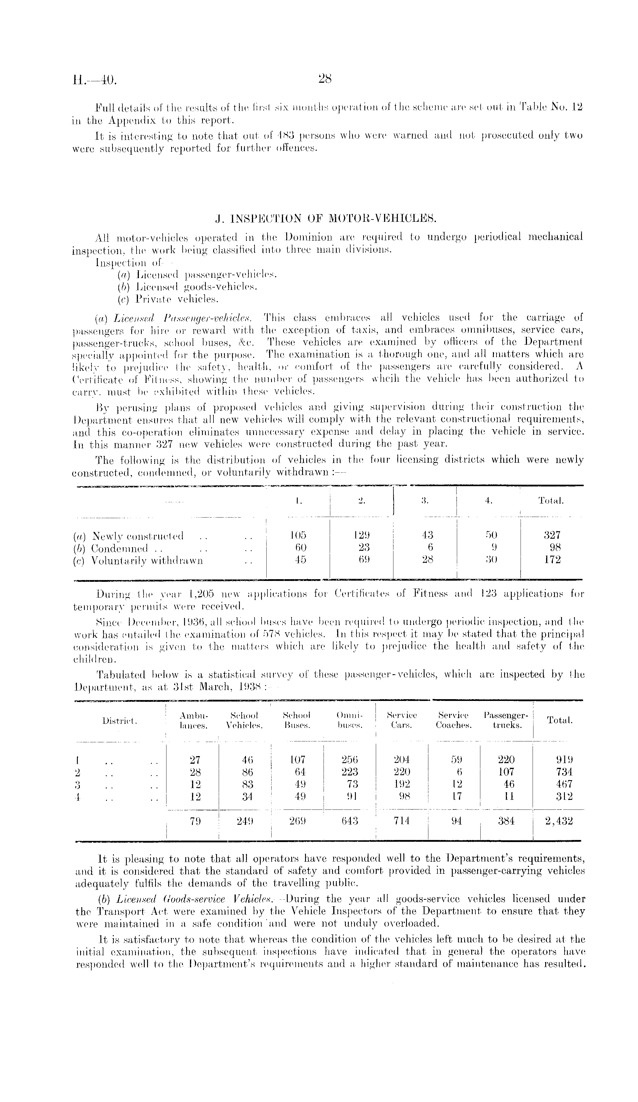 Full details of the results of the first six months operation of the scheme are set out in Table No. 12 in the Appendix to this report. It is interesting to note that out of 483 persons who were warned and not prosecuted only two were subsequently reported for further offences. J. INSPECTION OF MOTOR-VEHICLES. All motor-vehicles operated in the Dominion are required to undergo periodical mechanical inspection, the work being classified into three main divisions. Inspection of— (а) Licensed passenger-vehicles. (б) Licensed goods-vehicles. (c) Private vehicles. (a) Licensed Passenger-vehicles.—This class embraces all vehicles used for the carriage of passengers for hire or reward with the exception of taxis, and embraces omnibuses, service cars, passenger-trucks, school buses, &c. These vehicles are examined by officers of the Department specially appointed for the purpose. The examination is a thorough one, and all matters which are likely to prejudice the safety, health, or comfort of the passengers are carefully considered. A Certificate of Fitness, showing the number of passengers wheih the vehicle has been authorized to carry, must be exhibited within these vehicles. By perusing plans of proposed vehicles and giving supervision during their construction the Department ensures that all new vehicles will comply with, the relevant constructional requirements, and this co-operation eliminates unnecessary expense and delay in placing the vehicle in service. In this manner 327 new vehicles were constructed during the past year. The following is the distribution of vehicles in the four licensing districts which were newly constructed, condemned, or voluntarily withdrawn : —