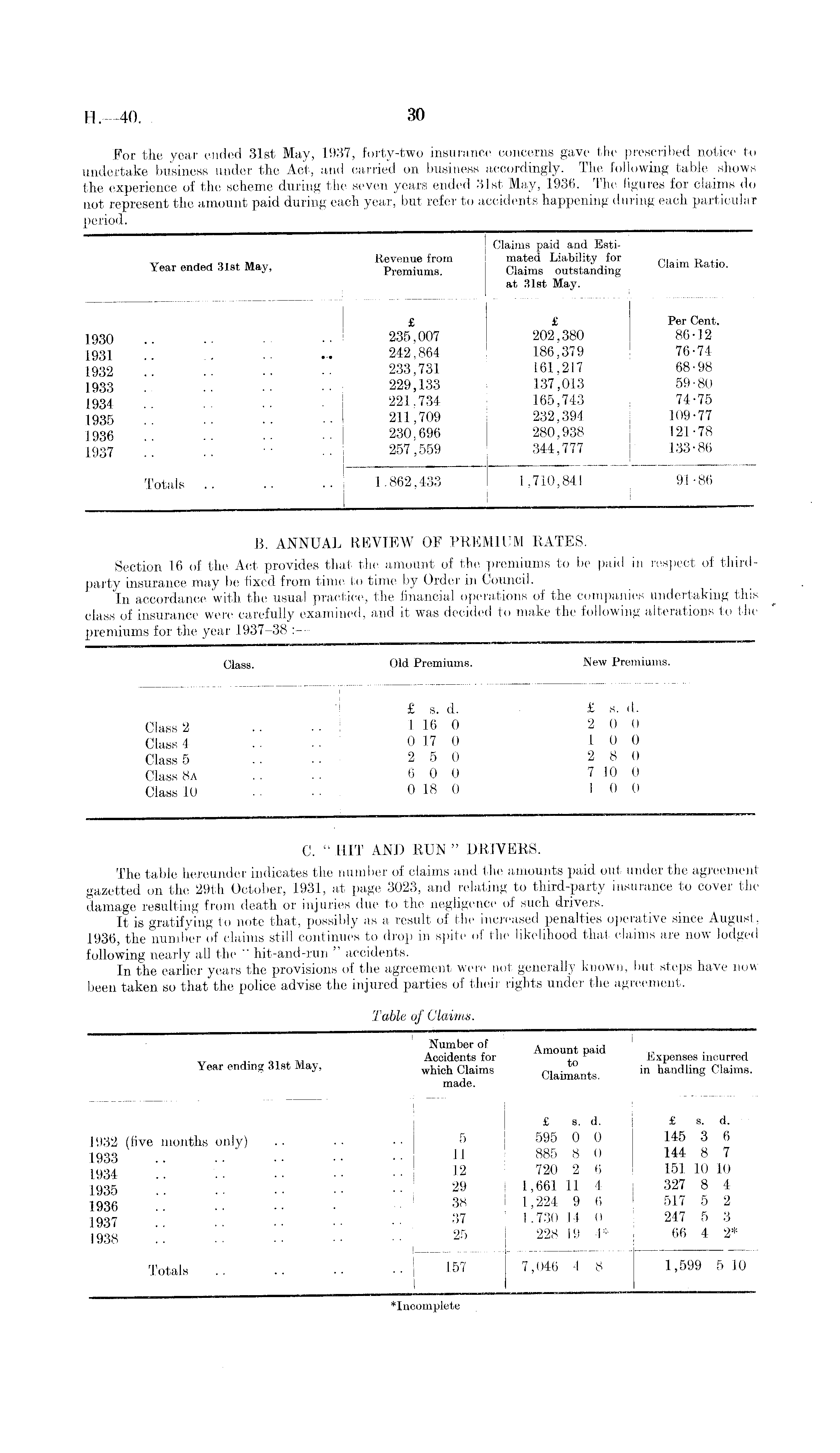 C. " HIT AND RUN " DRIVERS. The table hereunder indicates the number of claims and the amounts paid out under the agreement gazetted on the 29th October, 1931, at page 3023, and relating to third-party insurance to cover the damage resulting from death or injuries due to the negligence of such drivers. It is gratifying to note that, possibly as a result of the increased penalties operative since August, 1936, the number of claims still continues to drop in spite of the likelihood that claims are now lodged following nearly all the " hit-and-run " accidents. In the earlier years the provisions of the agreement were not generally known, but steps have now been taken so that the police advise the injured parties of their rights under the agreement.
