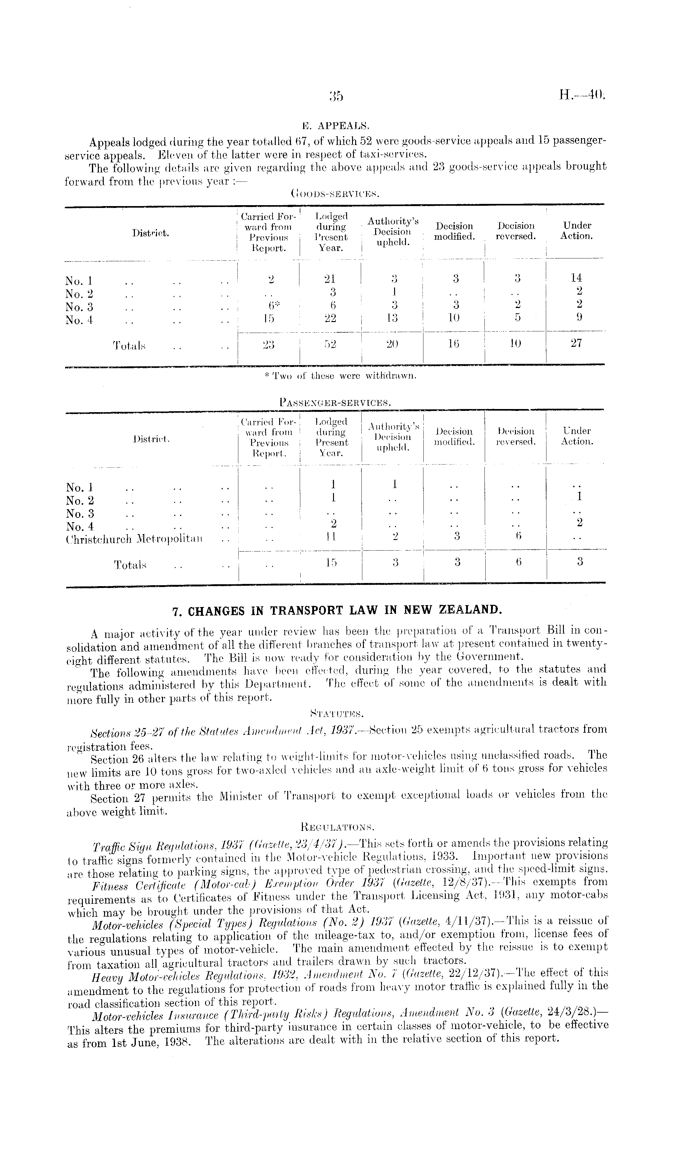 E. APPEALS. Appeals lodged during the year totalled 67, of which 52 were goods-service appeals and 15 passengerservice appeals. Eleven of the latter were in respect of taxi-services. The following details are given regarding the above appeals and 23 goods-service appeals brought forward from the previous year : —
