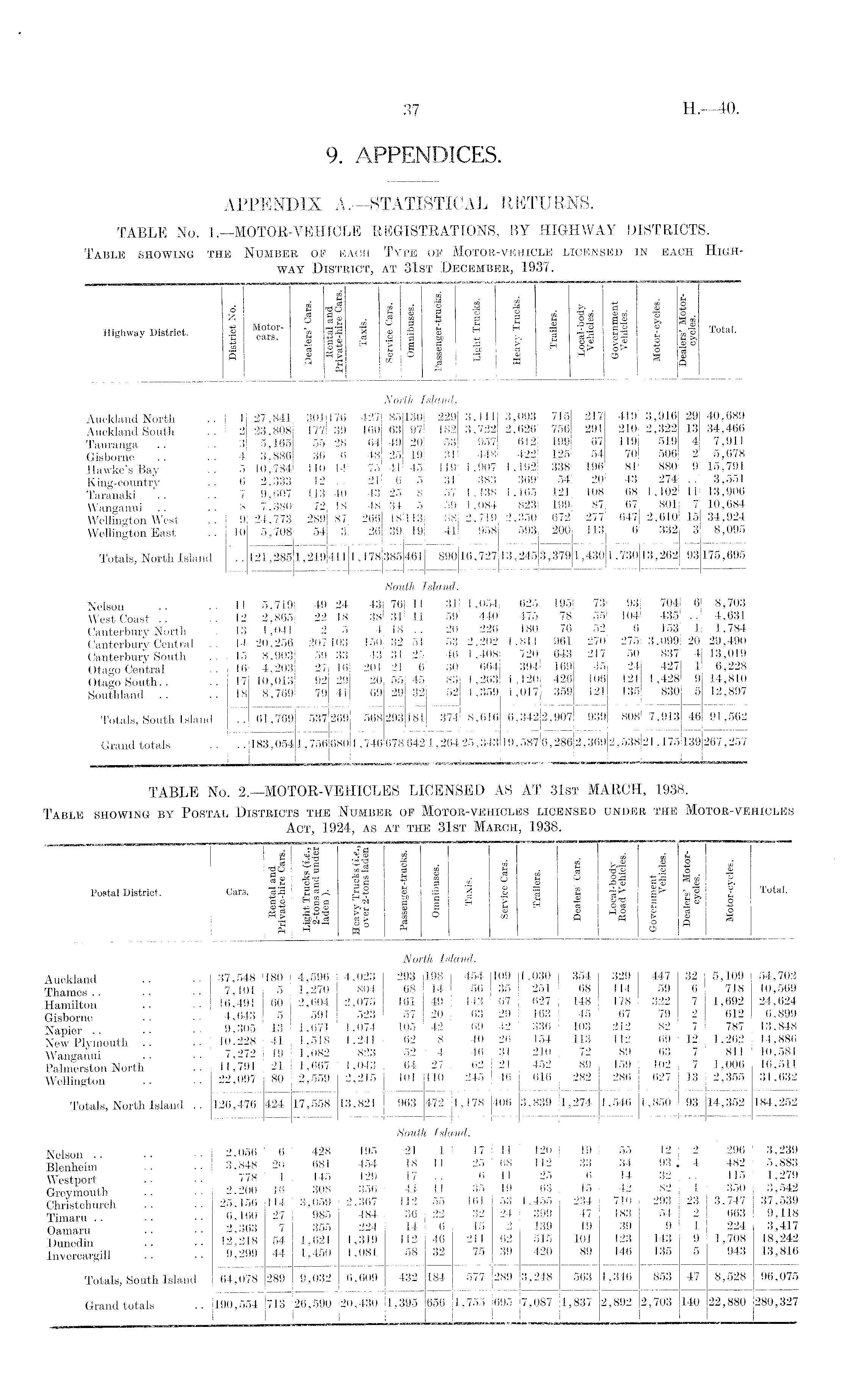 APPENDIX A.—STATISTICAL RETURNS. TABLE No. 1.—MOTOR-VEHICLE REGISTRATIONS, BY HIGHWAY DISTRICTS. Table showing the Number of each Type of Motor-vehicle licensed in each Highway District, at 31st December, 1937.