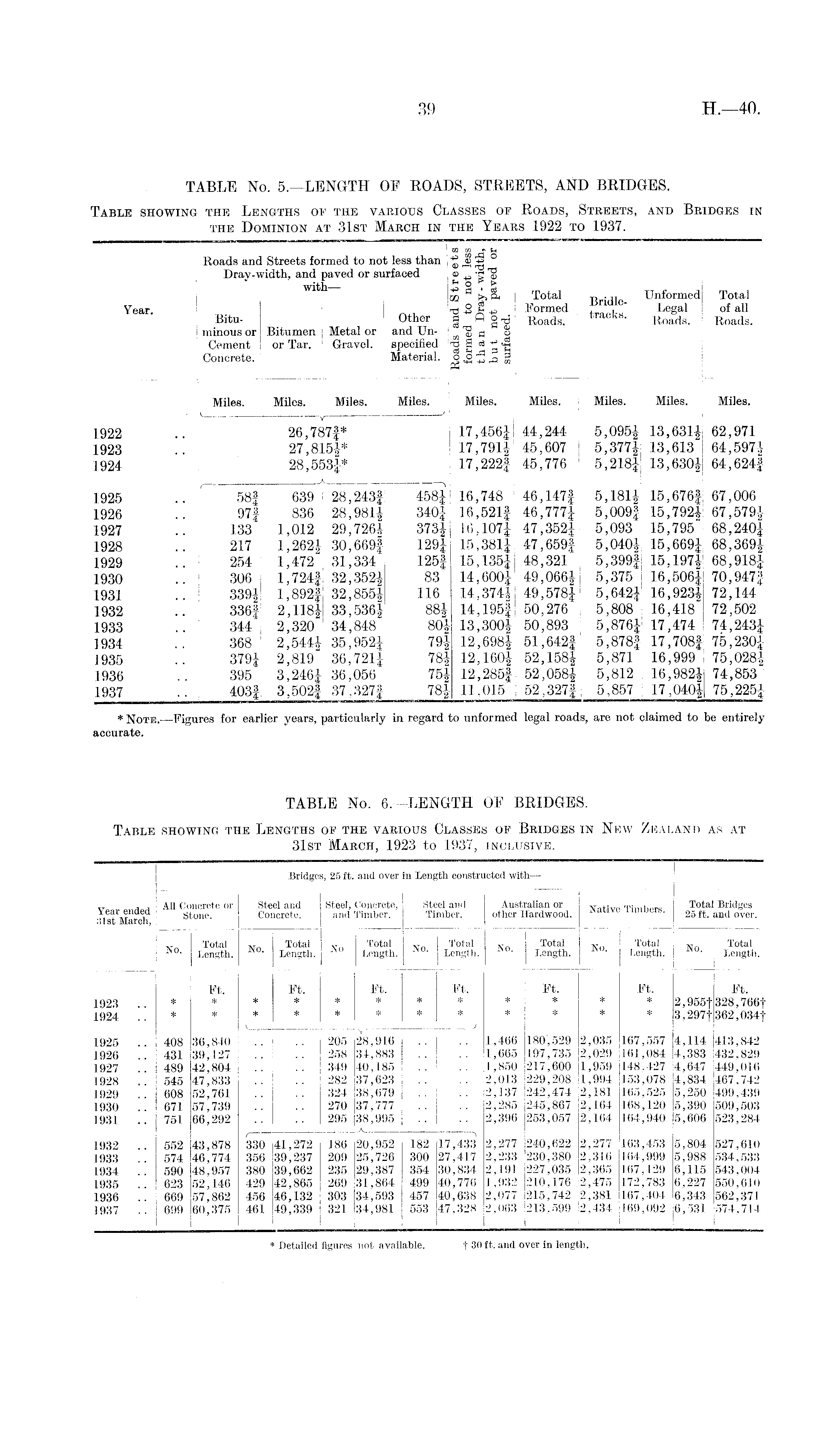 TABLE No. 5.—LENGTH OF ROADS, STREETS, AND BRIDGES. Table showing the Lengths of the various Classes of Roads, Streets, and Bridges in the Dominion at 31st March in the Years 1922 to 1937.