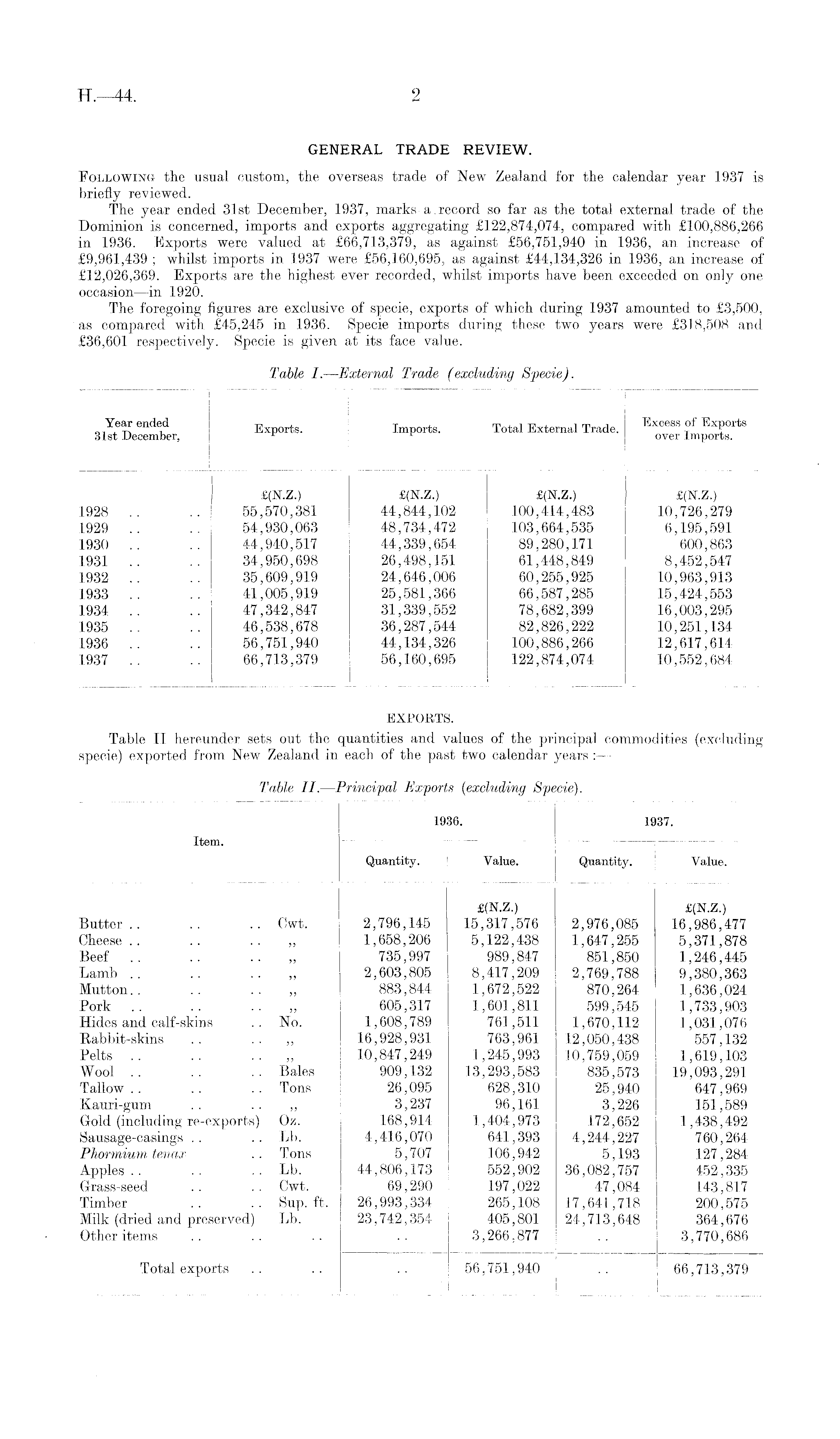 GENERAL TRADE REVIEW. Following the usual custom, the overseas trade of New Zealand for the calendar year 1937 is briefly reviewed. The year ended 31st December, 1937, marks a.record so far as the total external trade of the Dominion is concerned, imports and exports aggregating £122,874,074, compared with £100,886,266 in 1936. Exports were valued at £66,713,379, as against £56,751,940 in 1936, an increase of £9,961,439 ; whilst imports in 1937 were £56,160,695, as against £44,134,326 in 1936, an increase of £12,026,369. Exports are the highest ever recorded, whilst imports have been exceeded on only one occasion—in 1920. The foregoing figures are exclusive of specie, exports of which during 1937 amounted to £3,500, as compared with £45,245 in 1936. Specie imports during these two years were £318,508 and £36,601 respectively. Specie is given at its face value.
