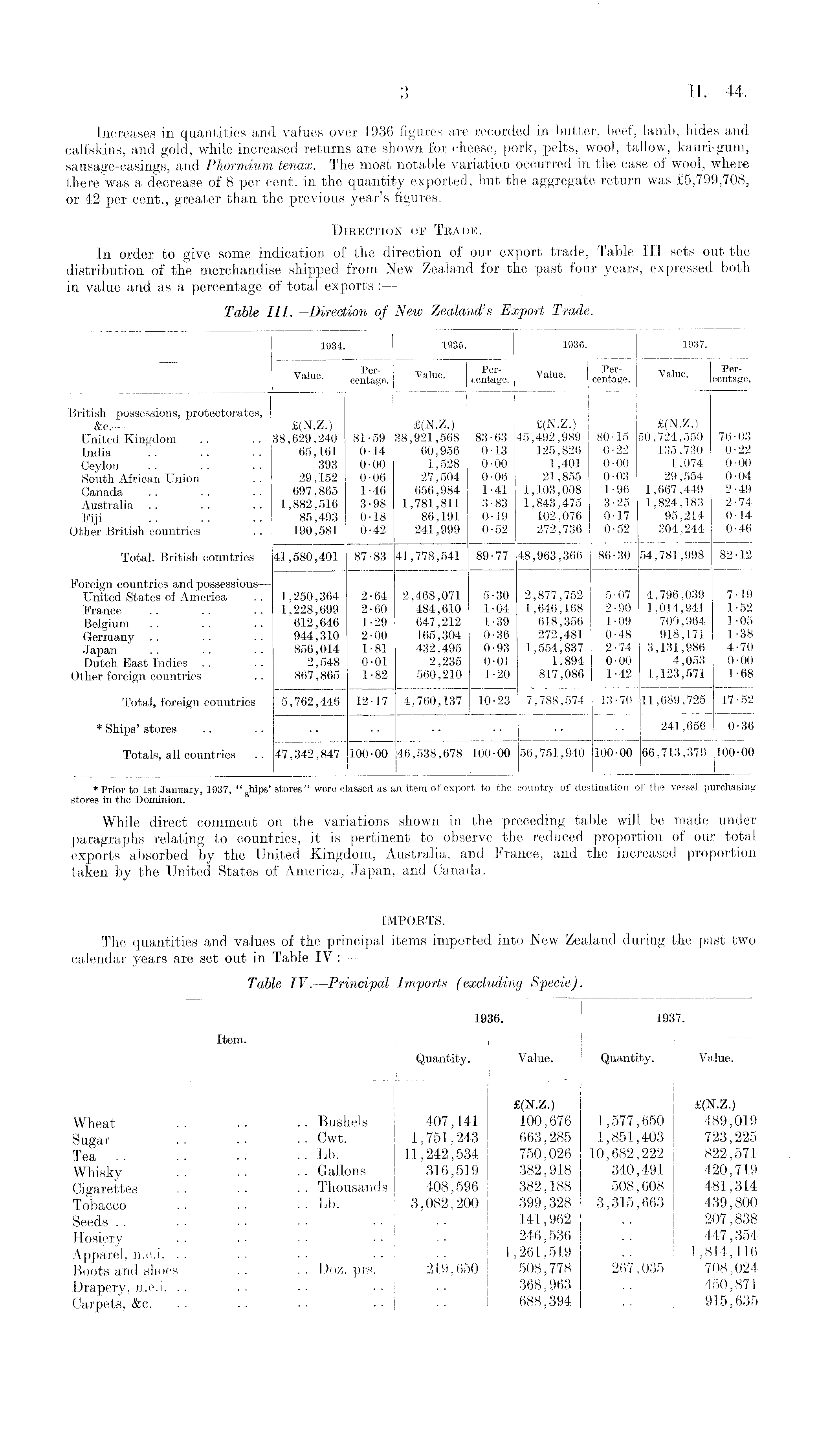 Increases in quantities and values over 1936 figures are recorded in butter, beef, lamb, hides and calfskins, and gold, while increased returns are shown for cheese, pork, pelts, wool, tallow, kauri-gum, sausage-casings, and Phormium tenax. The most notable variation occurred in the case of wool, where there was a decrease of 8 per cent, in the quantity exported, but the aggregate return was £5,799,708, or 42 per cent., greater than the previous year's figures. Direction of Trade. In order to give some indication of the direction of our export trade, Table 111 sets out the distribution of the merchandise shipped from New Zealand for the past four years, expressed both in value and as a percentage of total exports : —