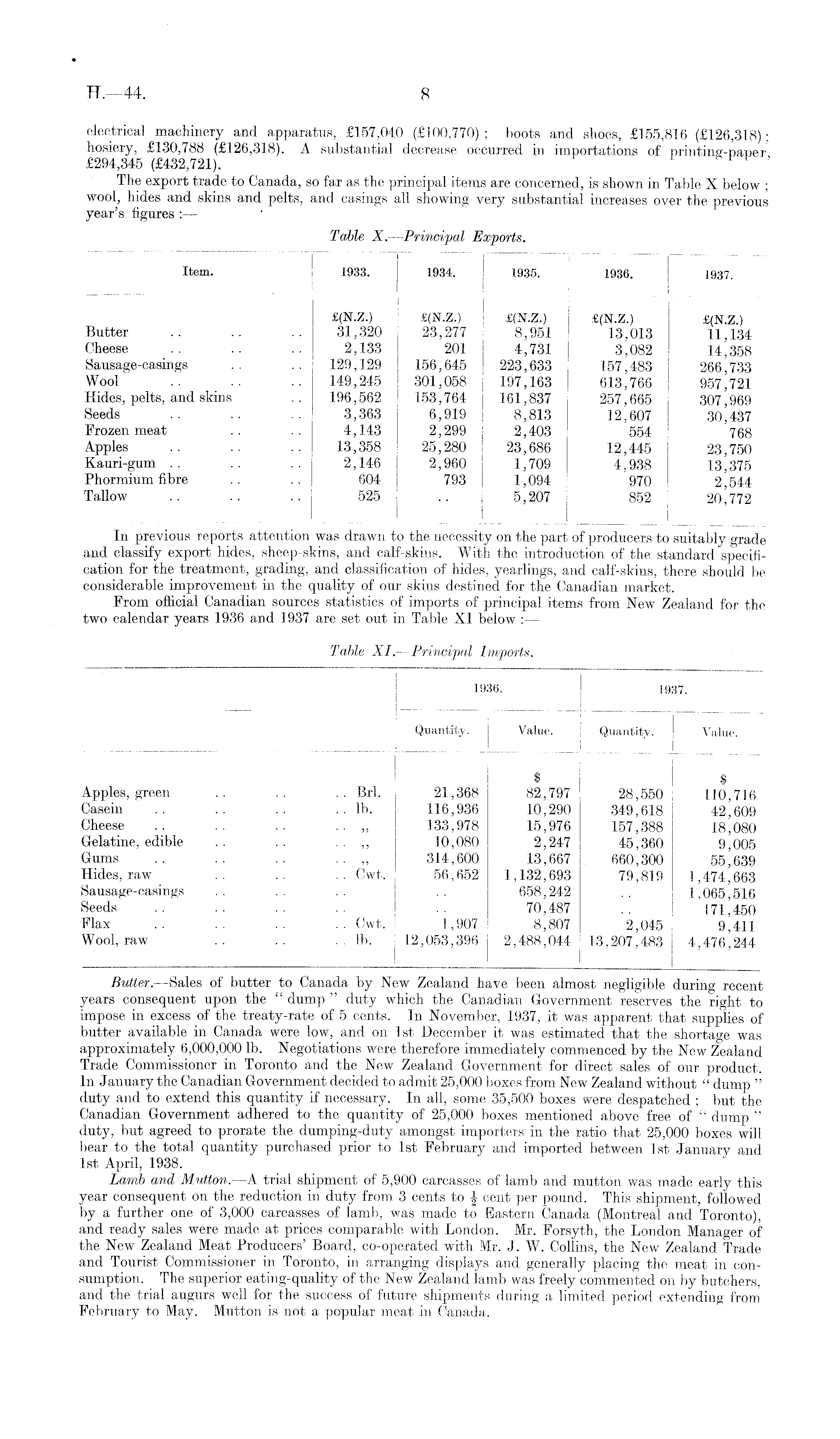 In previous reports attention was drawn to the necessity on the part of producers to suitably grade and classify export hides, sheep-skins, and calf-skins. With the introduction of the standard specification for the treatment, grading, and classification of hides, yearlings, and calf-skins, there should be considerable improvement in the quality of our skins destined for the Canadian market. From official Canadian sources statistics of imports of principal items from New Zealand for the two calendar years 1936 and 1937 are set out in Table XI below :—