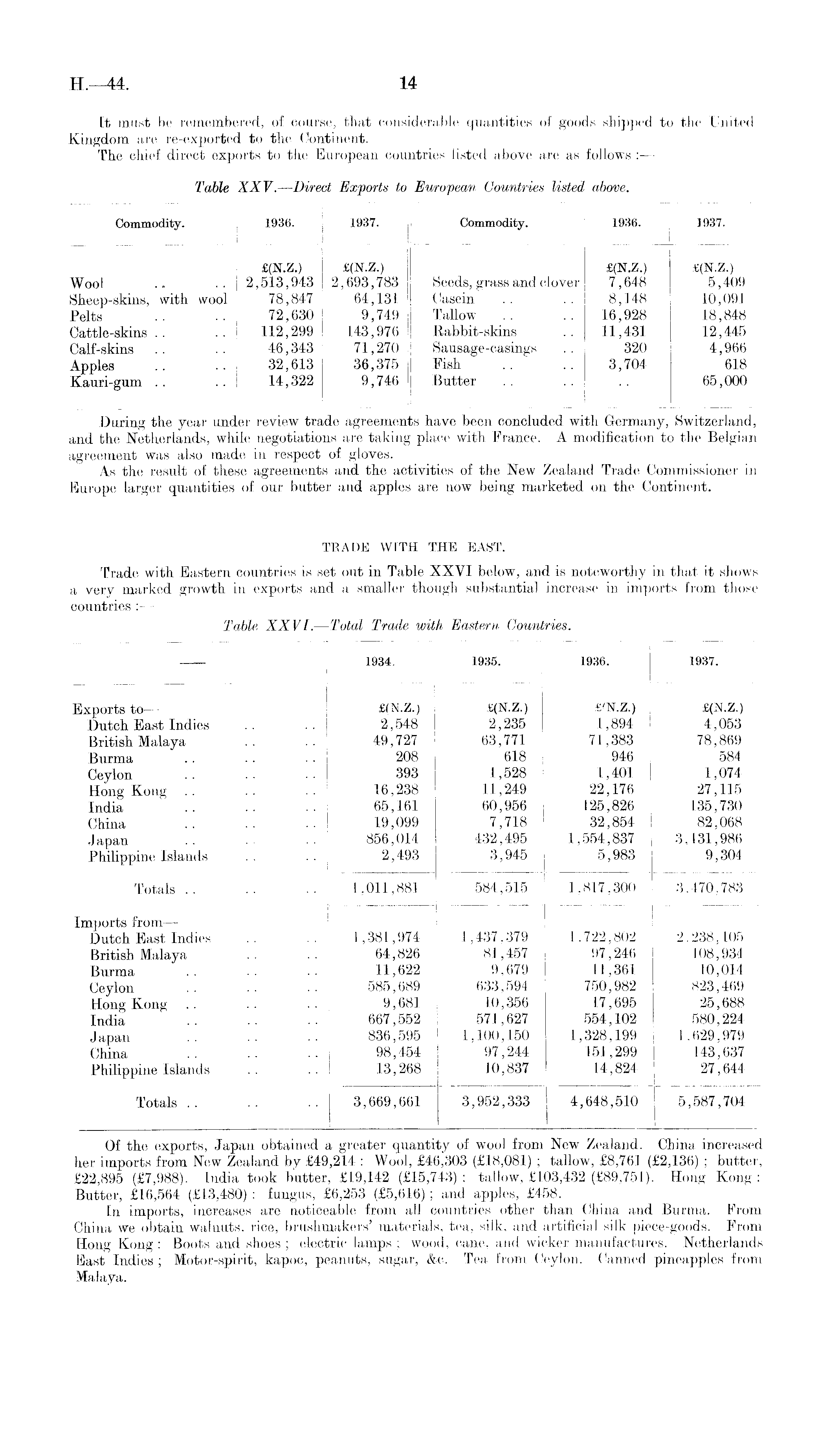 During the year under review trade agreements have been concluded with Germany, Switzerland, and the Netherlands, while negotiations are taking place with France. A modification to the Belgian agreement was also made in respect of gloves. As the result of these agreements and the activities of the New Zealand Trade Commissioner in Europe larger quantities of our butter and apples are now being marketed on the Continent. TRADE WITH THE EAST. Trade with Eastern countries is set out in Table XXVI below, and is noteworthy in that it shows a very marked growth in exports and a smaller though substantial increase in imports from those countries :—