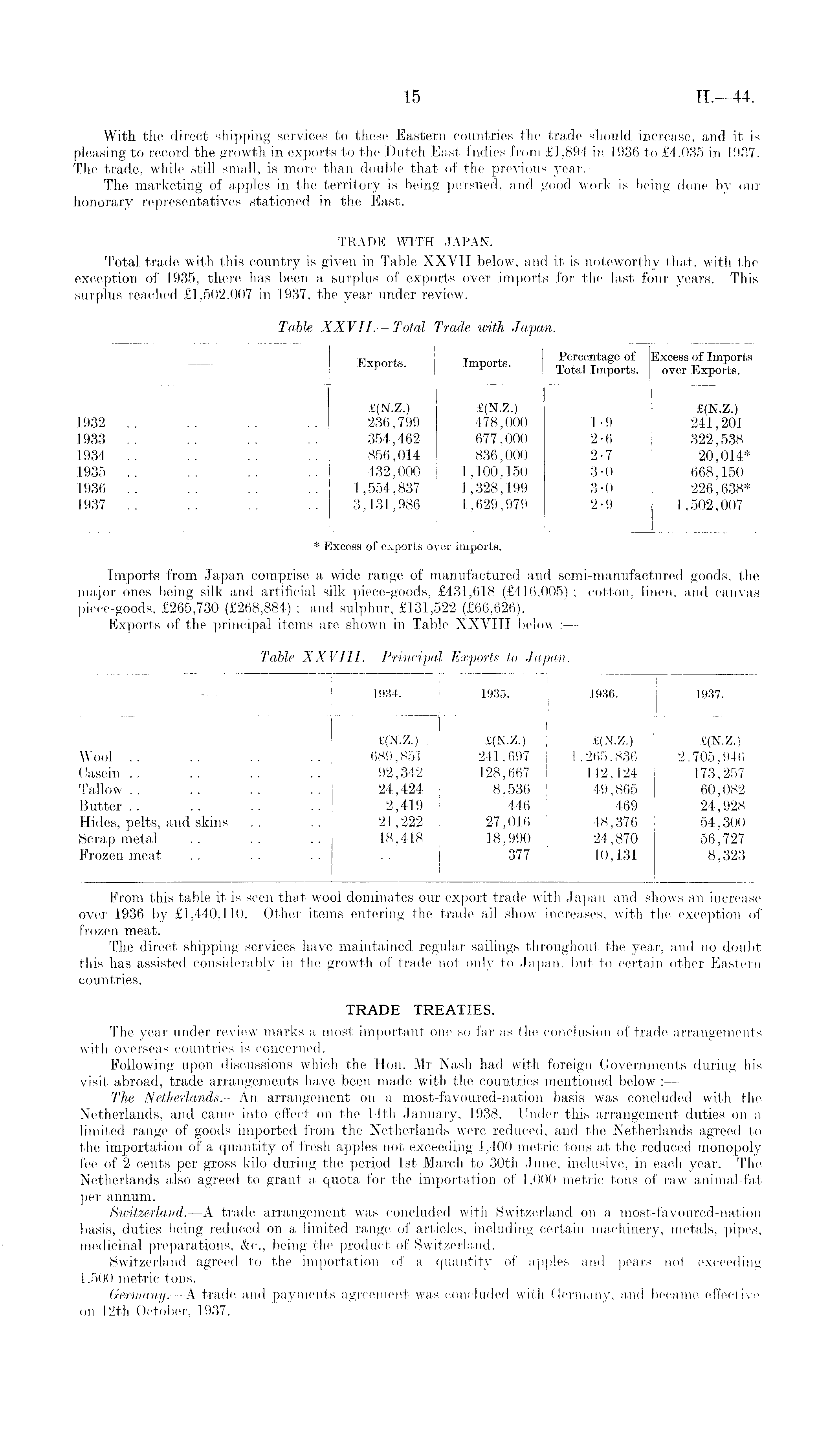 From this table it is seen that wool dominates our export trade with Japan and shows an increase over 1936 by £1,440,110. Other items entering the trade all show increases, with the exception of frozen meat. The direct shipping services have maintained regular sailings throughout the year, and no doubt this has assisted considerably in the growth of trade not only to Japan, but to certain other Eastern countries. TRADE TREATIES. The year under review marks a most important one so far ds the conclusion of trade arrangements with overseas countries is concerned. Following upon discussions which the Hon. Mr Nash had with foreign Governments during his visit abroad, trade arrangements have been made with the countries mentioned below :— The Netherlands. —An arrangement on a most-favoured-nation basis was concluded with the Netherlands, and came into effect on the 14th January, 1938. Under this arrangement duties on a limited range of goods imported from the Netherlands were reduced, and the Netherlands agreed to the importation of a quantity of fresh apples not exceeding 1,400 metric tons at the reduced monopoly fee of 2 cents per gross kilo during the period Ist March to 30th June, inclusive, in each year. The Netherlands also agreed to grant a quota for the importation of 1,000 metric tons of raw animal-fat per annum. Switzerland. —A trade arrangement was concluded with Switzerland on a most-favoured-nation basis, duties being reduced on a limited range of articles, including certain machinery, metals, pipes, medicinal preparations, &c., being the product of Switzerland. Switzerland agreed to the importation of a quantity of apples and pears not exceeding 1,500 metric tons. Germany. —A trade and payments agreement was concluded with Germany, and became effective on 12th October, 1937.