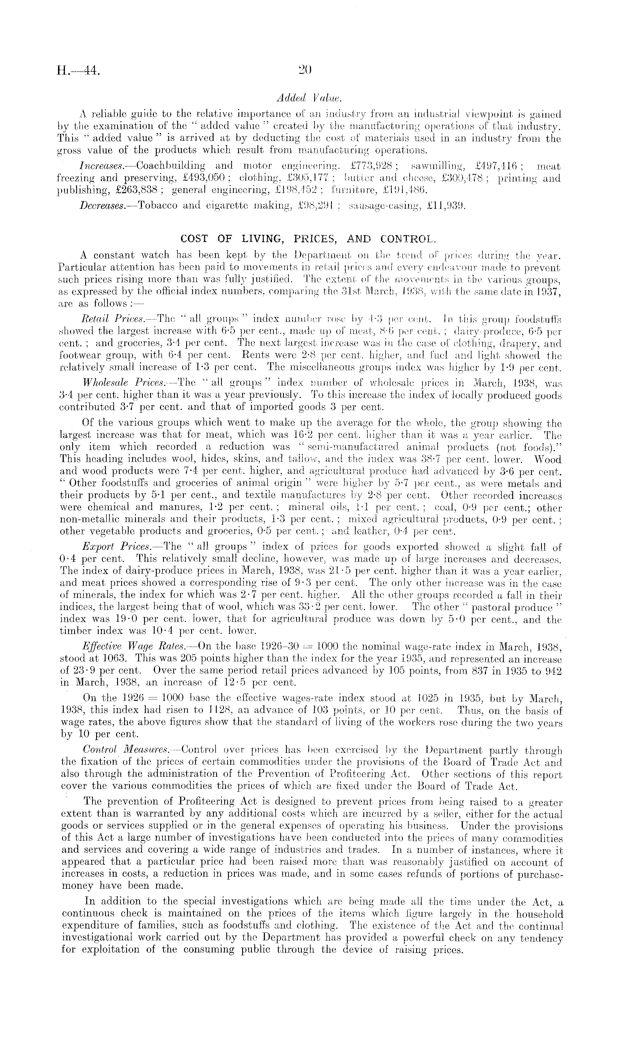 Added Value. A reliable guide to the relative importance of an industry from an industrial viewpoint is gained by the examination of the " added value " created by the manufacturing operations of that industry. This " added value " is arrived at by deducting the cost of materials used in an industry from the gross value of the products which result from manufacturing operations. Increases. —Coachbuilding and motor engineering, £773,928; sawmilling, £497,416 ; meat freezing and preserving, £493,050 ; clothing, £305,177 ; butter and cheese, £300,478 ; printing and publishing, £263,838 ; general engineering, £198,452 ; furniture, £191,486. Decreases. —Tobacco and cigarette making, £98,291 ; sausage-casing, £11,939. COST OF LIVING, PRICES, AND CONTROL. A constant watch has been kept by the Department on the trend of prices daring the year. Particular attention has been paid to movements in retail prices and every endeavour made to prevent such prices rising more than was fully justified. The extent of the movements in the various groups, as expressed by the, official index numbers, comparing the 31st March, 1938, with the same date in 1937, are as follows : — Retail Prices. —The " all groups " index number rose by 4-3 per cent. In this group foodstuffs showed the largest increase with 6-5 per cent., made up of meat, 8-6 per cent. ; dairy-produce, 6-5 per cent. ; and groceries, 3-4 per cent. The next largest increase was in the case of clothing, drapery, and footwear group, with 6-4 per cent. Rents were 2-8 per cent, higher, and fuel and light showed the relatively small increase of 1-3 per cent. The miscellaneous groups index was higher by 1-9 per cent. Wholesale Prices. —The " all groups " index number of wholesale prices in March, 1938, was 3-4 per cent, higher than it was a year previously. To this increase the index of locally produced goods contributed 3'7 per cent, and that of imported goods 3 per cent. Of the various groups which went to make up the average for the whole, the group showing the largest increase was that for meat, which was 16-2 per cent, higher than it was a year earlier. The only item which recorded a reduction was " semi-manufactured animal products (not foods)." This heading includes wool, hides, skins, and tallow, and the index was 38-7 per cent, lower. Wood and wood products were 7-4 per cent, higher, and agricultural produce had advanced by 3-6 per cent. " Other foodstuffs and groceries of animal origin " were higher by 5-7 per cent., as were metals and their products by 5-1 per cent., and textile manufactures by 2-8 per cent. Other recorded increases Were chemical and manures, 1-2 per cent. ; mineral oils, 1-1 per cent. ; coal, 0-9 per cent.; other non-metallic minerals and their products, 1-3 per cent. ; mixed agricultural products, 0-9 per cent. ; other vegetable products and groceries, 0-5 per cent.; and leather, 0-4 per cent. Export Prices. —The " all groups " index of prices for goods exported showed a slight fall of 0-4 per cent. This relatively small decline, however, was made up of large increases and decreases. The index of dairy-produce prices in March, 1938, was 21-5 per cent, higher than it was a year earlier, and meat prices showed a corresponding rise of 9-3 per cent. The only other increase was in the case of minerals, the index for which was 2-7 per cent, higher. All the other groups recorded a fall in their indices, the largest being that of wool, which was 33-2 per cent, lower. The other " pastoral produce " index was 19-0 per cent, lower, that for agricultural produce was down by 5-0 per cent., and the timber index was 10-4 per cent, lower. Effective Wage Rates. —On the base 1926-30 = 1000 the nominal wage-rate index in March, 1938, stood at 1063. This was 205 points higher than the index for the year 1935, and represented an increase of 23-9 per cent. Over the same period retail prices advanced by 105 points, from 837 in 1935 to 942 in March, 1938, an increase of 12-5 per cent. On the 1926 = 1000 base the effective wages-rate index stood at 1025 in 1935, but by March, 1938, this index had risen to 1128, an advance of 103 points, or 10 per cent. Thus, on the basis of wage rates, the above figures show that the standard of living of the workers rose during the two years by 10 per cent. Control Measures. —Control over prices has been exercised by the Department partly through the fixation of the prices of certain commodities under the provisions of the Board of Trade Act and also through the administration of the Prevention of Profiteering Act. Other sections of this report cover the various commodities the prices of which are fixed under the Board of Trade Act. The prevention of Profiteering Act is designed to prevent prices from being raised to a greater extent than is warranted by any additional costs which are incurred by a seller, either for the actual goods or services supplied or in the general expenses of operating his business. Under the provisions of this Act a large number of investigations have been conducted into the prices of many commodities and services and covering a wide range of industries and trades. In a number of instances, where it appeared that a particular price had been raised more than was reasonably justified on account of increases in costs, a reduction in prices was made, and in some cases refunds of portions of purchasemoney have been made. In addition to the special investigations which are being made all the time under the Act, a continuous check is maintained on the prices of the items which figure largely in the household expenditure of families, such as foodstuffs and clothing. The existence of the Act and the continual investigational work carried out by the Department has provided a powerful check on any tendency for exploitation of the consuming public through the device of raising prices.
