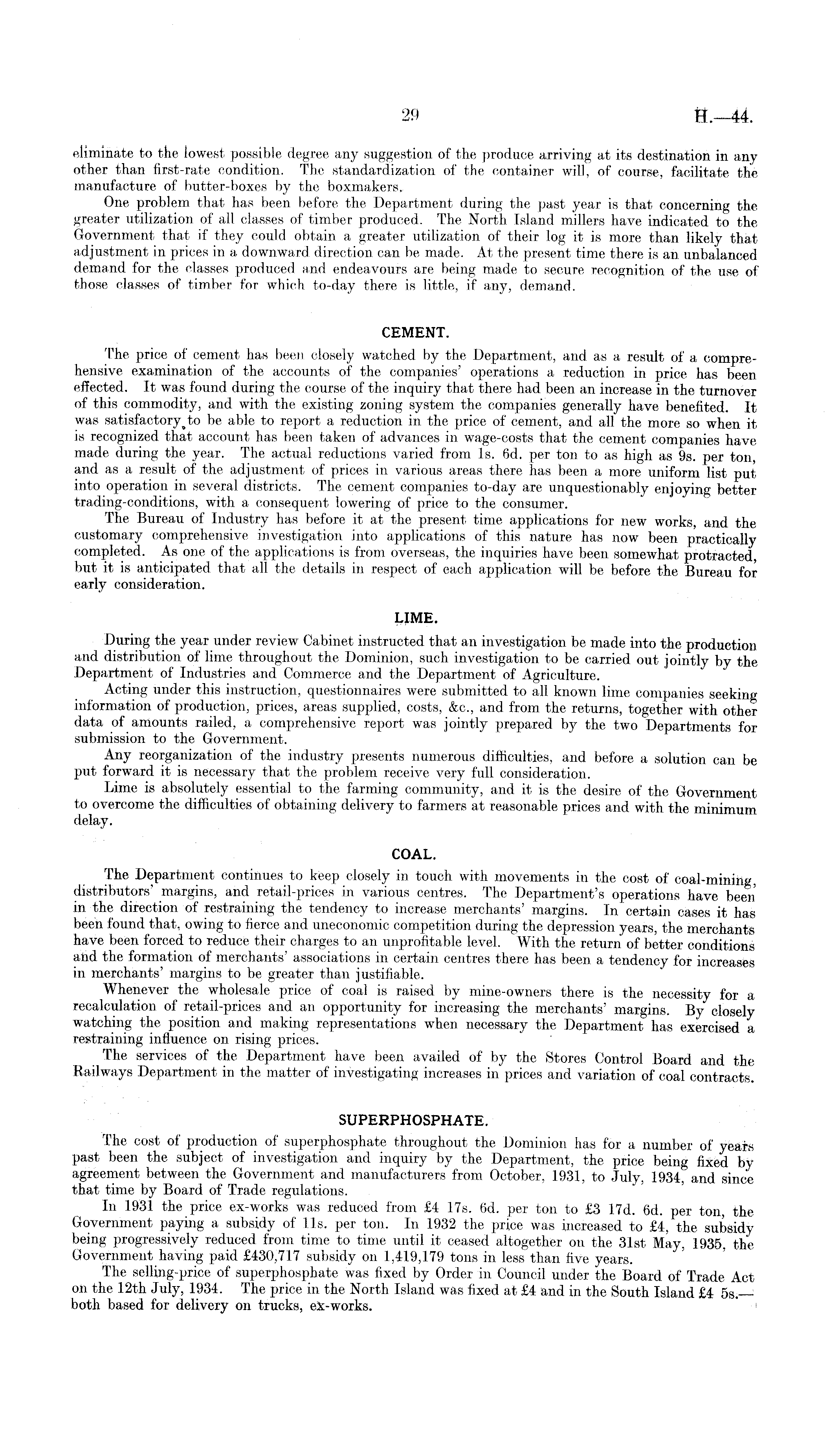 eliminate to the lowest, possible degree any suggestion of the produce arriving at its destination in any other than first-rate condition. The standardization of the container will, of course, facilitate the manufacture of butter-boxes by the boxmakers. One problem that has been before the Department during the past year is that concerning the greater utilization of all classes of timber produced. The North Island millers have indicated to the Government that if they could obtain a greater utilization of their log it is more than likely that adjustment in prices in a downward direction can be made. At the present time there is an unbalanced demand for the classes produced and endeavours are being made to secure recognition of the use of those classes of timber for which to-day there is little, if any, demand. CEMENT. The price of cement has been closely watched by the Department, and as a result of a comprehensive examination of the accounts of the companies' operations a reduction in price has been effected. It was found during the course of the inquiry that there had been an increase in the turnover of this commodity, and with the existing zoning system the companies generally have benefited. It was be able to report a reduction in the price of cement, and all the more so when it is recognized that account has been taken of advances in wage-costs that the cement companies have made during the year. The actual reductions varied from Is. 6d. per ton to as high as 9s. per ton, and as a result of the adjustment of prices in various areas there has been a more uniform list put into operation in several districts. The cement companies to-day are unquestionably enjoying better trading-conditions, with a consequent lowering of price to the consumer. The Bureau of Industry has before it at the present time applications for new works, and the customary comprehensive investigation into applications of this nature has now been practically completed. As one of the applications is from overseas, the inquiries have been somewhat protracted, but it is anticipated that all the details in respect of each application will be before the Bureau for early consideration. LIME. During the year under review Cabinet instructed that an investigation be made into the production and distribution of lime throughout the Dominion, such investigation to be carried out jointly by the Department of Industries and Commerce and the Department of Agriculture. Acting under this instruction, questionnaires were submitted to all known lime companies seeking information of production, prices, areas supplied, costs, &c., and from the returns, together with other data of amounts railed, a comprehensive report was jointly prepared by the two Departments for submission to the Government. Any reorganization of the industry presents numerous difficulties, and before a solution can be put forward it is necessary that the problem receive very full consideration. Lime is absolutely essential to the farming community, and it is the desire, of the Government to overcome the difficulties of obtaining delivery to farmers at reasonable prices and with the minimum delay. COAL. The Department continues to keep closely in touch with movements in the cost of coal-miniiig, distributors' margins, and retail-prices in various centres. The Department's operations have been' in the direction of restraining the tendency to increase merchants' margins. In certain cases it has been found that, owing to fierce and uneconomic competition during the depression years, the merchants have been forced to reduce their charges to an unprofitable level. With the return of better conditions and the formation of merchants' associations in certain centres there has been a tendency for increases in merchants' margins to be greater than justifiable. Whenever the wholesale price of coal is raised by mine-owners there is the necessity for a recalculation of retail-prices and an opportunity for increasing the merchants' margins. By closely watching the position and making representations when necessary the Department has exercised a restraining influence on rising prices. The services of the Department have been availed of by the Stores Control Board and the Railways Department in the matter of investigating increases in prices and variation of coal contracts. SUPERPHOSPHATE. The cost of production of superphosphate throughout the Dominion has for a number of years past been the subject of investigation and inquiry by the Department, the price being fixed by agreement between the Government and manufacturers from October, 1931, to July, 1934, and since that time by Board of Trade regulations. In 1931 the price ex-works was reduced from £4 17s. 6d. per ton to £3 17d. 6d. per ton, the Government paying a subsidy of lis. per ton. In 1932 the price was increased to £4, the subsidybeing progressively reduced from time to time until it ceased altogether on the 31st May, 1935, the Government having paid £430,717 subsidy on 1,419,179 tons in less than five years. The selling-price of superphosphate was fixed by Order in Council under the Board of Trade Act on the 12t.h July, 1934. The price in the North Island was fixed at £4 and in the South Island £4 ss.— both based for delivery on trucks, ex-works.