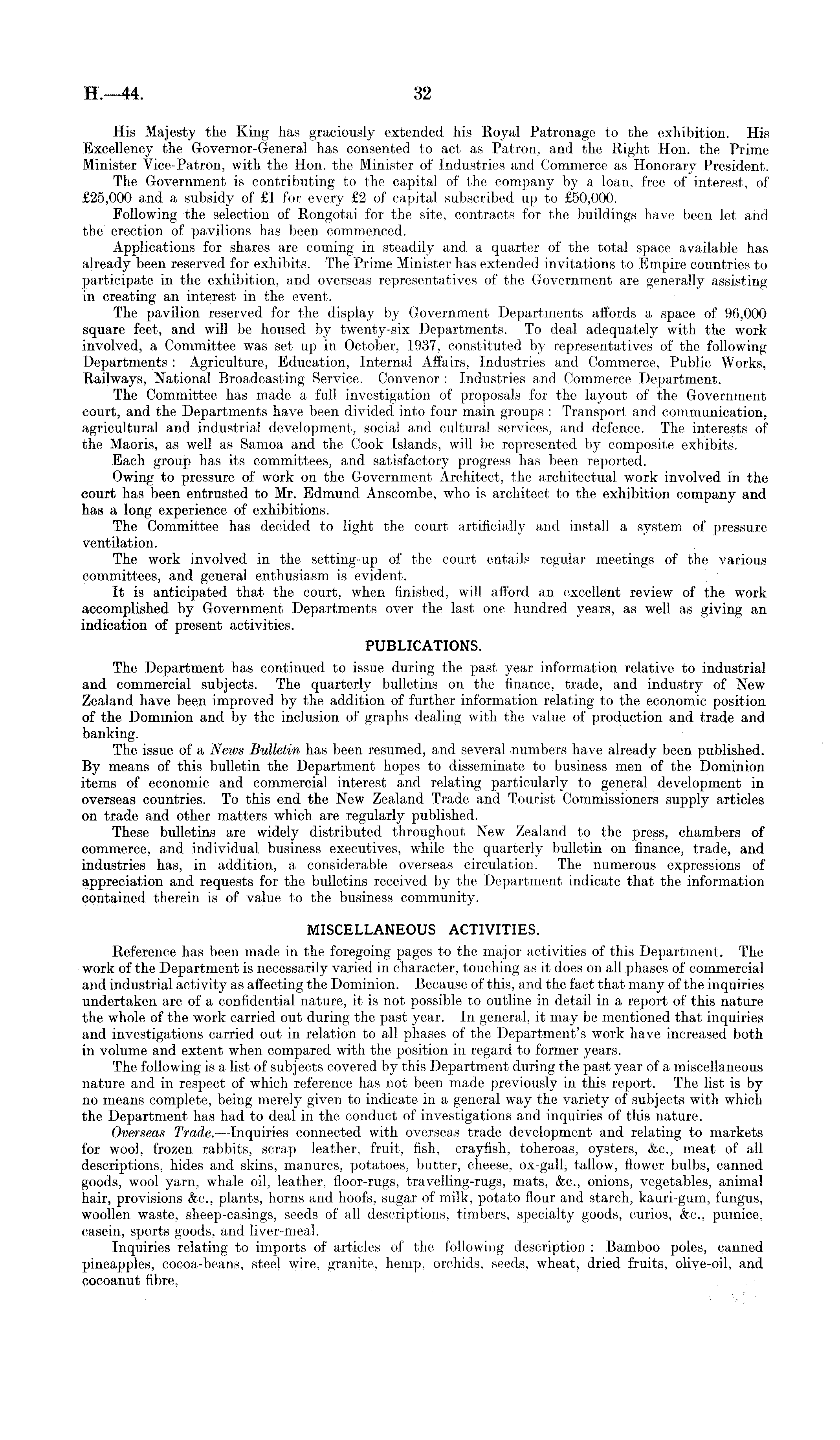 His Majesty the King lias graciously extended his Royal Patronage to the exhibition. His Excellency the Governor-General has consented to act as Patron, and the Right Hon. the Prime Minister Vice-Patron, with the Hon. the Minister of Industries and Commerce as Honorary President. The Government is contributing to the capital of the company by a loan, free.of interest, of £25,000 and a subsidy of £1 for every £2 of capital subscribed up to £50,000. Following the selection of Rongotai for the site, contracts for the buildings have been let and the erection of pavilions has been commenced. Applications for shares are coming in steadily and a quarter of the total space available has already been reserved for exhibits. The Prime Minister has extended invitations to Empire countries to participate in the exhibition, and overseas representatives of the Government are generally assisting in creating an interest in the event. The pavilion reserved for the display by Government Departments affords a space of 96,000 square feet, and will be housed by twenty-six Departments. To deal adequately with the work involved, a Committee was set up in October, 1937, constituted by representatives of the following Departments : Agriculture, Education, Internal Affairs, Industries and Commerce, Public Works, Railways, National Broadcasting Service. Convenor : Industries and Commerce Department. The Committee has made a full investigation of proposals for the layout of the Government court, and the Departments have been divided into four main groups : Transport and communication, agricultural and industrial development, social and cultural services, and defence. The interests of the Maoris, as well as Samoa and the Cook Islands, will be represented by composite exhibits. Each group has its committees, and satisfactory progress has been reported. Owing to pressure of work on the Government Architect, the architectual work involved in the court has been entrusted to Mr. Edmund Anscom.be, who is architect to the exhibition company and has a long experience of exhibitions. The Committee has decided to light the court artificially and install a system of pressure ventilation. The work involved in the setting-up of the court entails regular meetings of the various committees, and general enthusiasm is evident. It is anticipated that the court, when finished, will afford an excellent review of the work accomplished by Government Departments over the last one hundred years, as well as giving an indication of present activities. PUBLICATIONS. The Department has continued to issue during the past year information relative to industrial and commercial subjects. The quarterly bulletins on the finance, trade, and industry of New Zealand have been improved by the addition of further information relating to the economic position of the Dominion and by the inclusion of graphs dealing with the value of production and trade and banking. The issue of a News Bulletin has been resumed, and several numbers have already been published. By means of this bulletin the Department hopes to disseminate to business men of the Dominion items of economic and commercial interest and relating particularly to general development in overseas countries. To this end the New Zealand Trade and Tourist Commissioners supply articles on trade and other matters which are regularly published. These bulletins are widely distributed throughout New Zealand to the press, chambers of commerce, and individual business executives, while the quarterly bulletin on finance, trade, and industries has, in addition, a considerable overseas circulation. The numerous expressions of appreciation and requests for the bulletins received by the Department indicate that the information contained therein is of value to the business community. MISCELLANEOUS ACTIVITIES. Reference has been made in the foregoing pages to the major activities of this Department. The work of the Department is necessarily varied in character, touching as it does on all phases of commercial and industrial activity as affecting the Dominion. Because of this, and the fact that many of the inquiries undertaken are of a confidential nature, it is not possible to outline in detail in a report of this nature the whole of the work carried out during the past year. In general, it may be mentioned that inquiries and investigations carried out in relation to all phases of the Department's work have increased both in volume and extent when compared with the position in regard to former years. The following is a list of subjects covered by this Department during the past year of a miscellaneous nature and in respect of which reference has not been made previously in this report. The list is by no means complete, being merely given to indicate in a general way the variety of subjects with which the Department has had to deal in the conduct of investigations and inquiries of this nature. Overseas Trade. —Inquiries connected with overseas trade development and relating to markets for wool, frozen rabbits, scrap leather, fruit, fish, crayfish, toheroas, oysters, &c., meat of all descriptions, hides and skins, manures, potatoes, butter, cheese, ox-gall, tallow, flower bulbs, canned goods, wool yarn, whale oil, leather, floor-rugs, travelling-rugs, mats, &c., onions, vegetables, animal hair, provisions &c., plants, horns and hoofs, sugar of milk, potato flour and starch, kauri-gum, fungus, woollen waste, sheep-casings, seeds of all descriptions, timbers, specialty goods, curios, &c., pumice, casein, sports goods, and liver-meal. Inquiries relating to imports of articles of the following description : Bamboo poles, canned pineapples, cocoa-beans, stee] wire, granite, hemp, orchids, seeds, wheat, dried fruits, olive-oil, and cocoanut fibre,