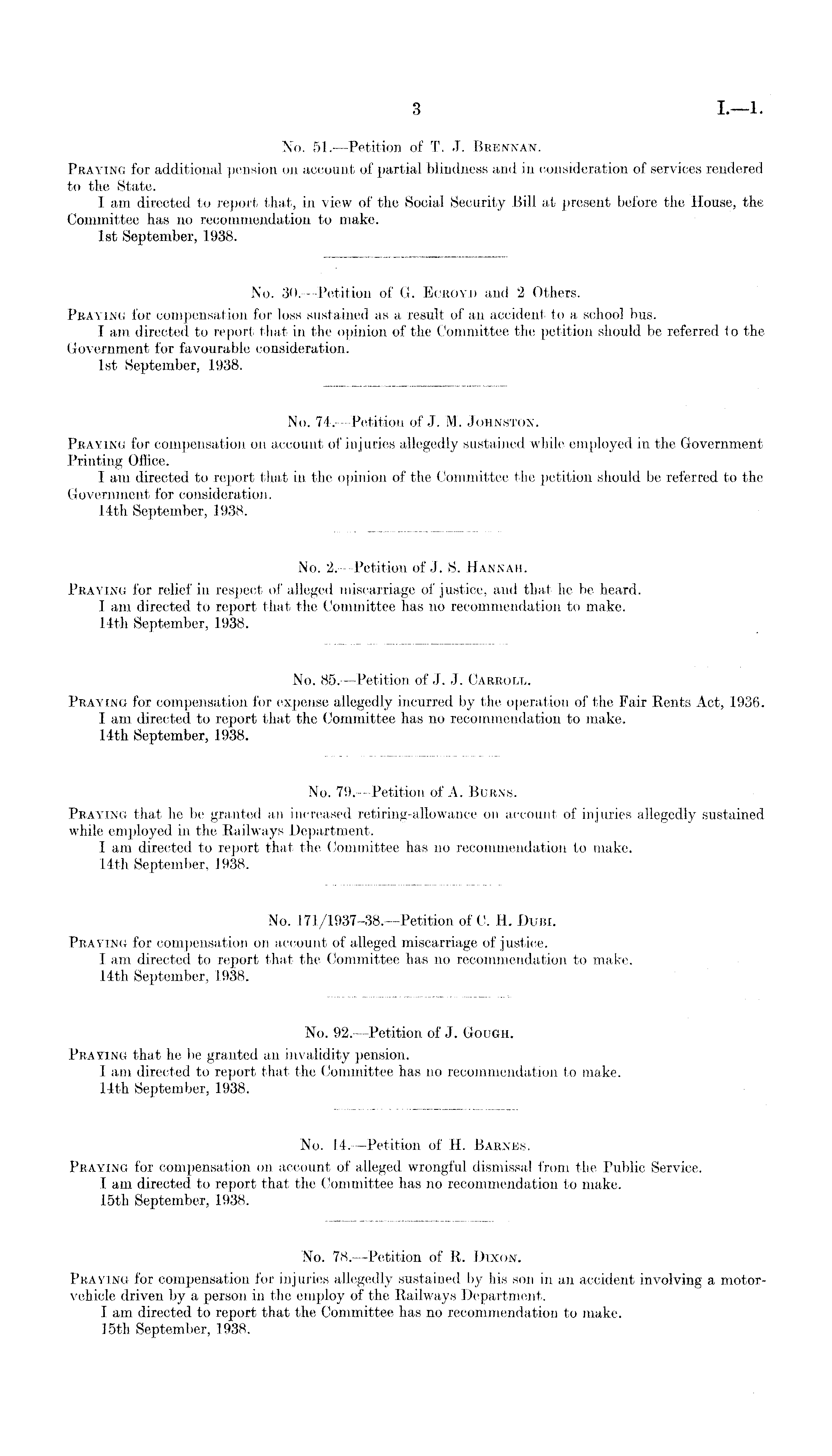 No. 51. —Petition of T. J. Brennan. Praying for additional pension on account of partial blindness and in consideration of services rendered to the State. I am directed to report that, in view of the Social Security Bill at present before the House, the Committee has no recommendation to make. Ist September, 1938.