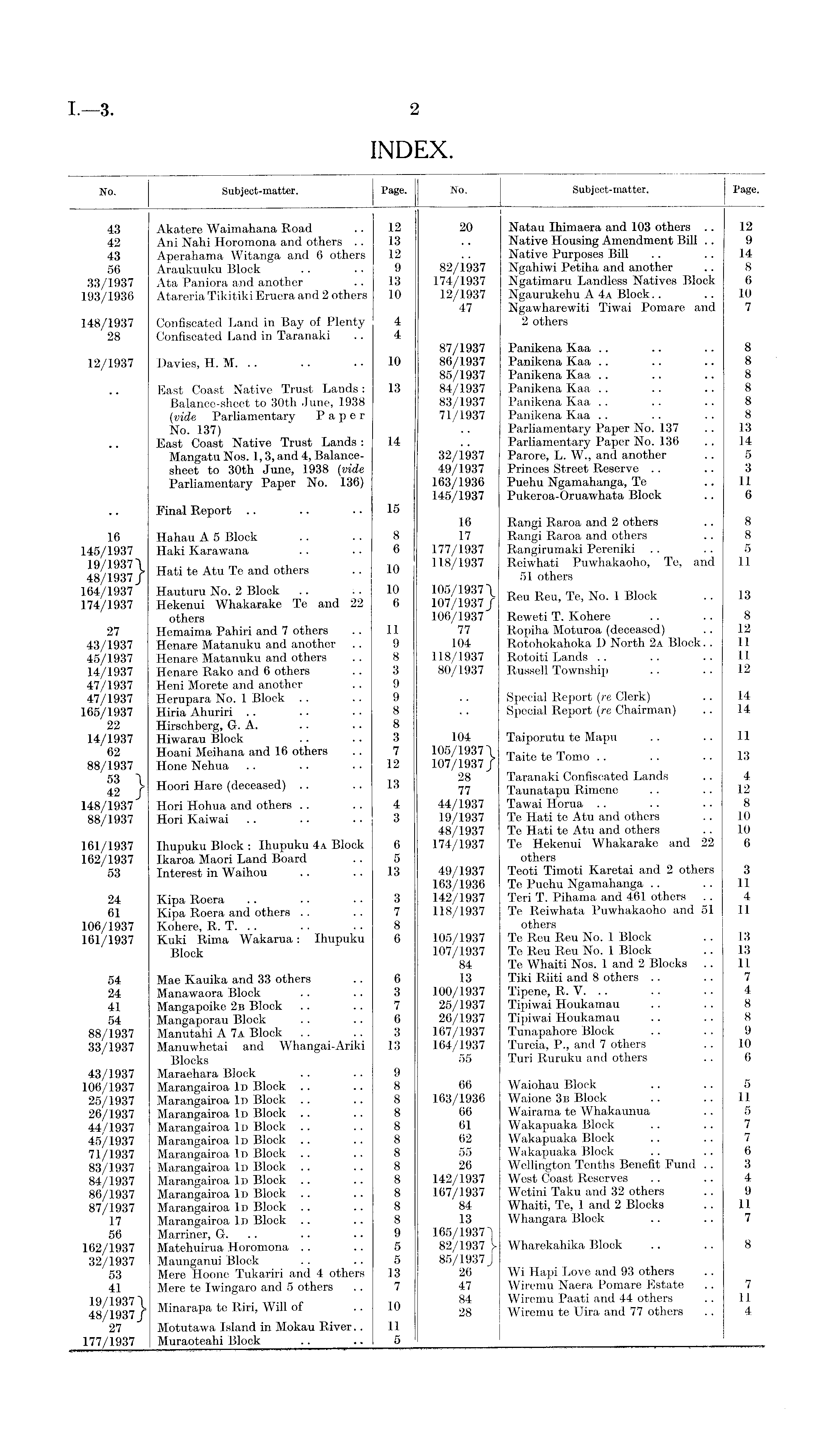 Ko, Subject-matter. Page. 43 Akatere Waimahana Road .. 12 42 Ani Nahi Horomona and others .. 13 43 Aperahama Witanga and 6 others 12 56 Araukunku Block .. .. 9 33/1937 Ata Paniora and another .. 13 193/1936 AtareriaTikitikiEruera and 2 others 10 148/1937 Confiscated Land in Bay of Plenty 4 28 Confiscated Land in Taranaki .. 4 12/1937 Davies, H. M. .. .. . • 10 East Coast Native Trust Lands : 13 Balance-sheet to 30th June, 1938 (vide Parliamentary Paper No. 137) East Coast Native Trust Lands : 14 Mangatu Nos. 1,3, and 4, Balancesheet to 30th June, 1938 (vide Parliamentary Paper No. 136) Einal Report .. .. • • 15 16 Hahau A 5 Block .. .. 8 145/1937 Haki Karawana .. • • 6 48/1937 }* Hati te Atu Te and others .. 10 164/1937 Hauturu No. 2 Block .. .. 10 174/1937 Hekenui Whakarake Te and 22 6 others 27 Hemaima Pahiri and 7 others .. 11 43/1937 Henare Matanuku and another .. 9 45/1937 Henare Matanuku and others .. 8 14/1937 Henare Rako and 6 others .. 3 47/1937 Heni Morete and another .. 9 47/1937 Herupara No. 1 Block .. .. 9 165/1937 HiriaAhuriri .. .. .. 8 22 Hirschberg, G. A. .. .. 8 14/1937 Hiwarau Block . • .. 3 62 Hoani Meihana and 16 others .. 7 88/1937 Hone Nehua .. .. .. 12 42 Hoori Hare (deceased) .. .. 13 148/1937 Hori Hohua and others .. . . 4 88/1937 Hori Kaiwai .. .. .. 3 161/1937 Ihupuku Block : Ihupuku 4a Block 6 162/1937 Ikaroa Maori Land Board .. 5 53 Interest in Waihou .. .. 13 24 Kipa Roera .. .. .. 3 61 Kipa Roera and others .. . . 7 106/1937 Kohere, R. T. .. .. . . 8 161/1937 Kuki Rima Wakarua: Ihupuku 6 Block 54 Mae Kauika and 33 others .. 6 24 Manawaora Block .. .. 3 41 Mangapoike 2b Block .. .. 7 54 Mangaporau Block .. .. 6 88/1937 Manutahi A 7a Block . . .. 3 33/1937 Manuwhetai and Whangai-Ariki 13 Blocks 43/1937 Maraehara Block .. .. 9 106/1937 Marangairoa Id Block .. .. 8 25/1937 Marangairoa Id Block .. .. 8 26/1937 Marangairoa Id Block .. .. 8 44/1937 Marangairoa Id Block .. .. 8 45/1937 Marangairoa Id Block .. .. 8 71/1937 Marangairoa Id Block .. .. 8 83/1937 Marangairoa Id Block .. .. 8 84/1937 Marangairoa Id Block .. .. 8 86/1937 Marangairoa Id Block .. .. 8 87/1937 Marangairoa Id Block .. .. 8 17 Marangairoa Id Block .. .. 8 56 Marriner, G. .. • • 9 162/1937 Matehuirua Horomona .. .. 5 32/1937 Maunganui Block . . .. 5 53 Mere Hoone Tukariri and 4 others 13 41 Mere te Iwingaro and 5 others .. 7 48/1937/ Minarapa te Riri, Will of 10 27 Motutawa Island in Mokau River.. II 177/1937 Muraoteahi Block ■ ■ .. 5
