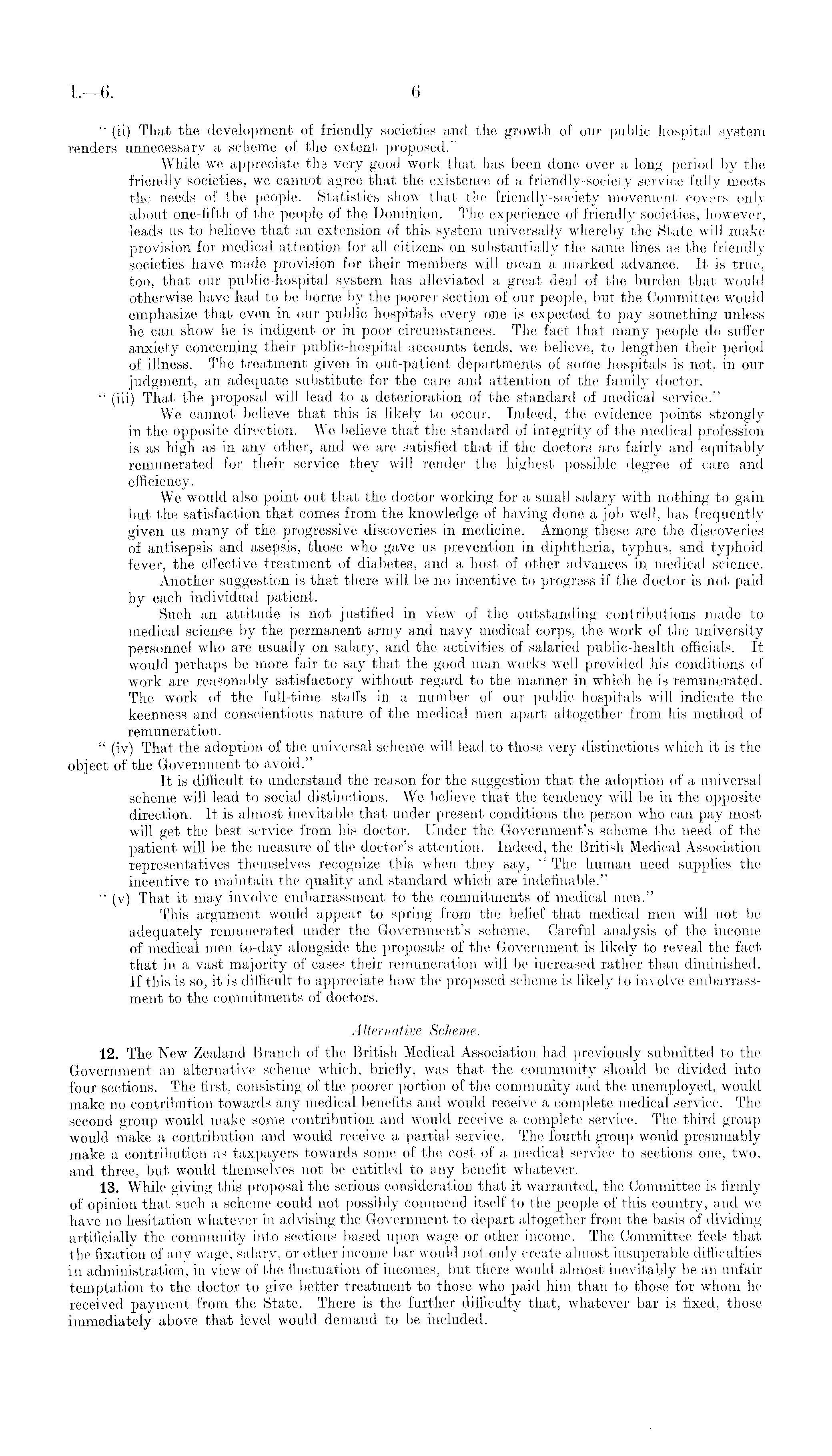 " (ii) That the development of friendly societies and the growth of our public hospital system renders unnecessary a scheme of the extent proposed." While we appreciate the very good work that has been done over a long period by the friendly societies, we cannot agree that the existence of a friendly-society service fully meets the needs of the people. Statistics show that the friendly-society movement covers only about one-fifth of the people of the Dominion. The experience of friendly societies, however, leads us to believe that an extension of this system universally whereby the State will make provision for medical attention for all citizens on substantially the same lines as the friendly societies have made provision for their members will mean a marked advance. It is true, too, that our public-hospital system has alleviated a great deal of the burden that would otherwise have had to be borne by the poorer section of our people, but the Committee would emphasize that even in our public hospitals every one is expected to pay something unless he can show he is indigent or in poor circumstances. The fact that many people do suffer anxiety concerning their public-hospital accounts tends, we believe, to lengthen their period of illness. The treatment given in out-patient departments of some hospitals is not, in our judgment, an adequate substitute for the care and attention of the family doctor. " (iii) That the proposal will lead to a deterioration of the standard of medical service." We cannot believe that this is likely to occur. Indeed, the evidence points strongly in the opposite direction. We believe that the standard, of integrity of the medical profession is as high as in any other, and we are satisfied that if the doctors are fairly and equitably remunerated for their service they will render the highest possible degree of care and efficiency. We would also point out that the doctor working for a small salary with nothing to gain but the satisfaction that comes from the knowledge of having done a job well, has frequently given us many of the progressive discoveries in medicine. Among these are the discoveries of antisepsis and asepsis, those who gave us prevention in diphtheria, typhus, and typhoid fever, the effective treatment of diabetes, and a host of other advances in medical science. Another suggestion is that there will be no incentive to progress if the doctor is not paid by each individual patient. Such an attitude is not justified in view of the outstanding contributions made to medical science by the permanent army and navy medical corps, the work of the university personnel who are usually on salary, and the activities of salaried public-health officials. It would perhaps be more fair to say that the good man works well provided his conditions of work are reasonably satisfactory without regard to the manner in which he is remunerated. The work of the full-time staffs in a number of our public hospitals will indicate the keenness and conscientious nature of the medical men apart altogether from his method of remuneration. " (iv) That the adoption of the universal scheme will lead to those very distinctions which it is the object of the Government to avoid." It is difficult to understand the reason for the suggestion that the adoption of a universal scheme will lead to social distinctions. We believe that the tendency will be in the opposite direction. It is almost inevitable that under present conditions the person who can pay most will get the best service from his doctor. Under the Government's scheme the need of the patient will be the measure of the doctor's attention. Indeed, the British Medical Association representatives themselves recognize this when they say, " The human need supplies the incentive to maintain the quality and standard which are indefinable." " (v) That it may involve embarrassment to the commitments of medical men." This argument would appear to spring from the belief that medical men will not be adequately remunerated under the Government's scheme. Careful analysis of the income of medical men to-day alongside the proposals of the Government is likely to reveal the fact that in a vast majority of cases their remuneration will be increased rather than diminished. If this is so, it is difficult to appreciate how the proposed scheme is likely to involve embarrassment to the commitments of doctors. Alternative Scheme. 12. The New Zealand Branch of the British Medical Association had previously submitted to the Government an alternative scheme which, briefly, was that the community should be divided into four sections. The first, consisting of the poorer portion of the community and the unemployed, would make no contribution towards any medical benefits and would receive a complete medical service. The second group would make some contribution and would receive a complete service. The third group would make a contribution and would receive a partial service. The fourth group would presumably make a contribution as taxpayers towards some of the cost of a medical service to sections one, two, and three, but would themselves not be entitled to any benefit whatever. 13. While giving this proposal the serious consideration that it warranted, the Committee is firmly of opinion that such a scheme could not possibly commend itself to the people of this country, and we have no hesitation whatever in advising the Government to depart altogether from the basis of dividing artificially the community into sections based upon wage or other income. The Committee feels that the fixation of any wage, salary, or other income bar would not only create almost insuperable difficulties in administration, in view of the fluctuation of incomes, but there would almost inevitably be an unfair temptation to the doctor to give better treatment to those who paid him than to those for whom he received payment from the State. There is the further difficulty that, whatever bar 
