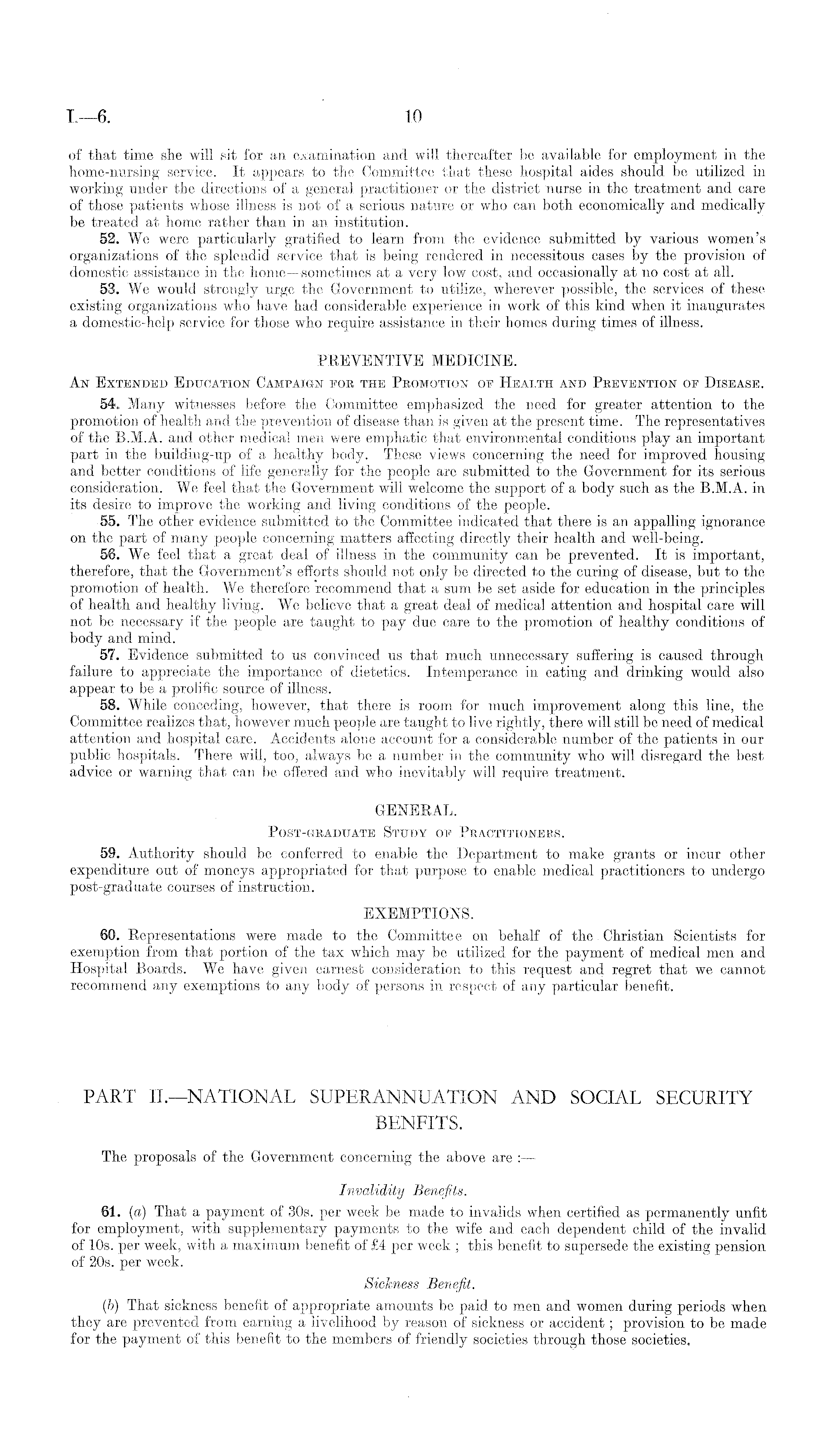 of that time she will sit for an examination and will thereafter be available for employment in the home-nursing service. It appears to the Committee that these hospital aides should be utilized in working under the directions of a general practitioner or the district nurse in the treatment and care of those patients whose illness is not of a serious nature or who can both economically and medically be treated at home rather than in an institution. 52. We were particularly gratified to learn from the evidence submitted by various women's organizations of the splendid service that is being rendered in necessitous cases by the provision of domestic assistance in the home—sometimes at a very low cost, and occasionally at no cost at all. 53. We would strongly urge the Government to utilize, wherever possible, the services of these existing organizations who have had considerable experience in work of this kind when it inaugurates a domestic-help service for those who require assistance in their homes during times of illness. PREVENTIVE MEDICINE. An Extended Education Campaign fob the Promotion op Health and Prevention op Disease. 54. Many witnesses before the Committee emphasized the need for greater attention to the promotion of health and the prevention of disease than is given at the present time. The representatives of the B.M.A. and other medical men were emphatic that environmental conditions play an important part in the building-up of a healthy body. These views concerning the need for improved housing and better conditions of life generally for the people are submitted to the Government for its serious consideration. We feel that the Government will welcome the support of a body such as the B.M.A. in its desire to improve the working and living conditions of the people. 55. The other evidence submitted to the Committee indicated that there is an appalling ignorance on the part of many people concerning matters affecting directly their health and well-being. 56. We feel that a great deal of illness in the community can be prevented. It is important, therefore, that the Government's efforts should not only be directed to the curing of disease, but to the promotion of health. We therefore recommend that a sum be set aside for education in the principles of health and healthy living. We believe that a great deal of medical attention and hospital care will not be necessary if the people are taught to pay due care to the promotion of healthy conditions of body and mind. 57. Evidence submitted to us convinced us that much unnecessary suffering is caused through failure to appreciate the importance of dietetics. Intemperance in eating and drinking would also appear to be a prolific source of illness. 58. While conceding, however, that there is room for much improvement along this line, the Committee realizes that, however much people are taught to live rightly, there will still be need of medical attention and hospital care. Accidents alone account for a considerable number of the patients in our public hospitals. There will, too, always be a number in the community who will disregard the best advice or warning that can be offered and who inevitably will require treatment. GENERAL. Post-graduate Study op Practitioners. 59. Authority should be conferred to enable the Department to make grants or incur other expenditure out of moneys appropriated for that purpose to enable medical practitioners to undergo post-graduate courses of instruction. EXEMPTIONS. 60. Representations were made to the Committee on behalf of the. Christian Scientists for exemption from that portion of the tax which may be utilized for the payment of medical men and Hospital Boards. We have given earnest consideration to this request and regret that we cannot recommend any exemptions to any body of persons in respect of any particular benefit. PART lI.—NATIONAL SUPERANNUATION AND SOCIAL SECURITY BENFITS. The proposals of the Government concerning the above are : — Invalidity Benefits. 61. (a) That a payment of 30s. per week be made to invalids when certified as permanently unfit for employment, with supplementary payments to the wife and each dependent child of the invalid of 10s. per week, with a maximum benefit of £4 per week ; this benefit to supersede the existing pension of 20s. per week. Sickness Benefit. (b) That sickness benefit of appropriate amounts be paid to men and women during periods when they are prevented from earning a livelihood by reason of sickness or accident; provision to be made for the payment of this benefit to the members of friendly societies through those societies.