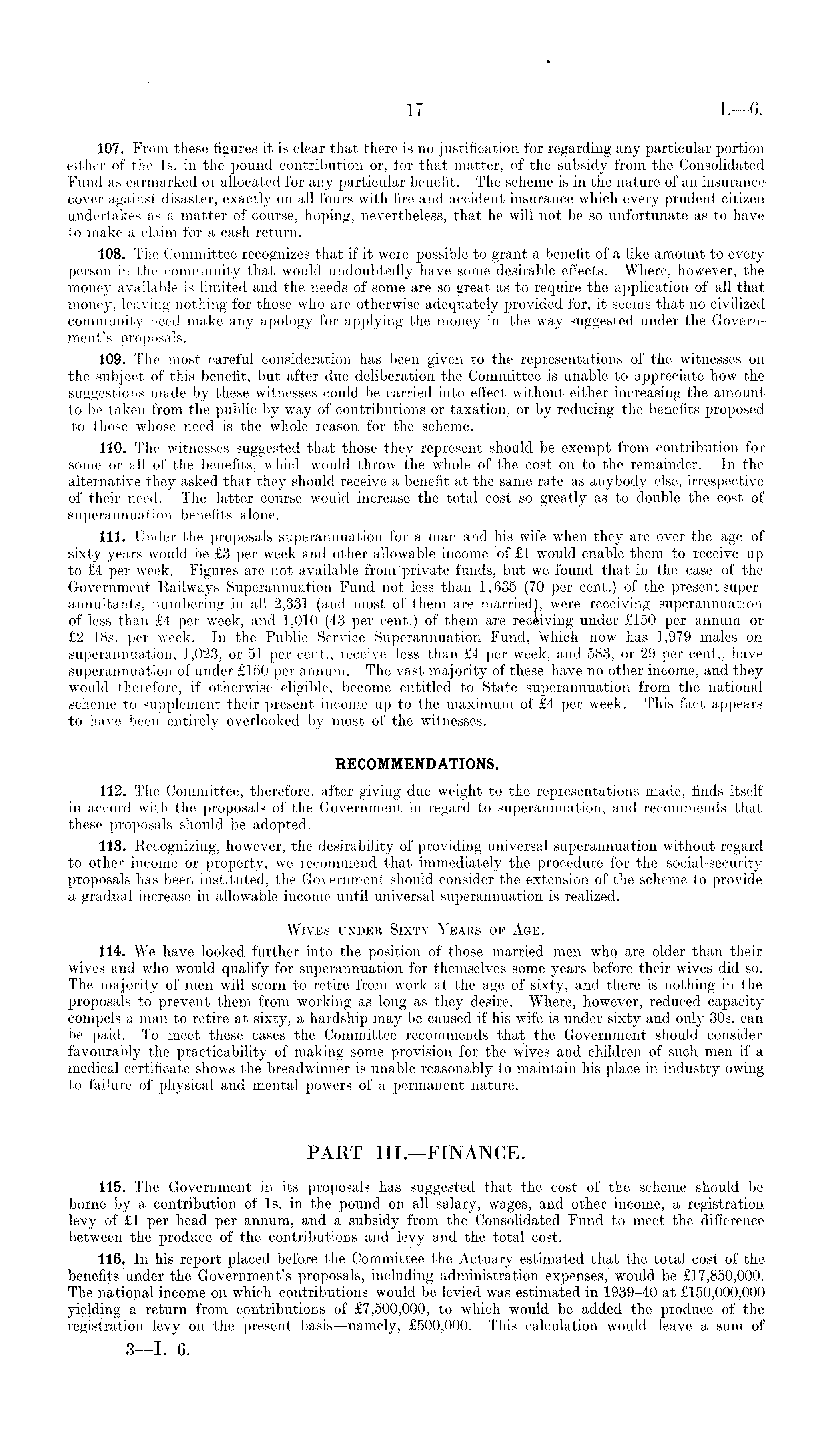 107. From these figures it is clear that there is no justification for regarding any particular portion either of the Is. in the pound contribution or, for that matter, of the subsidy from the Consolidated Fund as earmarked or allocated for any particular benefit. The scheme is in the nature of an insurance cover against disaster, exactly on all fours with fire and accident insurance which every prudent citizen undertakes as a matter of course, hoping, nevertheless, that he will not be so unfortunate as to have to make a claim for a cash return. 108. The Committee recognizes that if it were possible to grant a benefit of a like amount to every person in the community that would undoubtedly have some desirable effects. Where, however, the money available is limited and the needs of some are so great as to require the application of all that money, leaving nothing for those who are otherwise adequately provided for, it seems that no civilized community need make any apology for applying the money in the way suggested under the Government's proposals. 109. The most careful consideration has been given to the representations of the witnesses on the subject of this benefit, but after due deliberation the Committee is unable to appreciate how the suggestions made by these witnesses could be carried into effect without either increasing the amount to be taken from the public by way of contributions or taxation, or by reducing the benefits proposed to those whose need is the whole reason for the scheme. 110. The witnesses suggested that those they represent should be exempt from contribution for some or all of the benefits, which would throw the whole of the cost on to the remainder. In the alternative they asked that they should receive a benefit at the same rate as anybody else, irrespective of their need. The latter course would increase the total cost so greatly as to double the cost of superannuation benefits alone. 111. Under the proposals superannuation for a man and his wife when they are over the ago of sixty years would be £3 per week and other allowable income of £1 would enable them to receive up to £4 per week. Figures are not available from private funds, but we found that in the case of the Government Railways Superannuation Fund not less than 1,635 (70 per cent.) of the present superannuitants, numbering in all 2,331 (and most of them are married), were receiving superannuation of less than £4 per week, and 1,010 (43 per cent.) of them are receiving under £150 per annum or £2 18s. per week. In the Public Service Superannuation Fund, Which now has 1,979 males on superannuation, 1,023, or 51 per cent., receive less than £4 per week, and 583, or 29 per cent., have superannuation of under £150 per annum. The vast majority of these have no other income, and they would therefore, if otherwise eligible, become entitled to State superannuation from the national scheme to their present income up to the maximum of £4 per week. This fact appears to have been entirely overlooked by most of the witnesses. RECOMMENDATIONS. 112. The Committee, therefore, after giving due weight to the representations made, finds itself in accord with the proposals of the Government in regard to superannuation, and recommends that these proposals should be adopted. 113. Recognizing, however, the desirability of providing universal superannuation without regard to other income or property, we recommend that immediately the procedure for the social-security proposals has been instituted, the Government should consider the extension of the scheme to provide a gradual increase in allowable income until universal superannuation is realized. Wives under Sixty Years of Age. 114. We have looked further into the position of those married men who are older than their wives and who would qualify for superannuation for themselves some years before their wives did so. The majority of men will scorn to retire from work at the age of sixty, and there is nothing in the proposals to prevent them from working as long as they desire. Where, however, reduced capacity compels a man to retire at sixty, a hardship may be caused if his wife is under sixty and only 30s. can be paid. To meet these cases the Committee recommends that the Government should consider favourably the practicability of making some provision for the wives and children of such men if a medical certificate shows the breadwinner is unable reasonably to maintain his place in industry owing to failure of physical and mental powers of a permanent nature. PART lII.—FINANCE. 115. The Government in its proposals has suggested that the cost of the scheme should be borne by a contribution of Is. in the pound on all salary, wages, and other income, a registration levy of £1 per head per annum, and a subsidy from the Consolidated Fund to meet the difference between the produce of the contributions and levy and the total cost. 116. In his report placed before the Committee the Actuary estimated that the total cost of the benefits under the Government's proposals, including administration expenses, would be £17,850,000. The national income on which contributions would be levied was estimated in 1939-40 at £150,000,000 yielding a return from contributions of £7,500,000, to which would be added the produce of the registration levy on the present basis —namely, £500,000. This calculation would leave a sum of