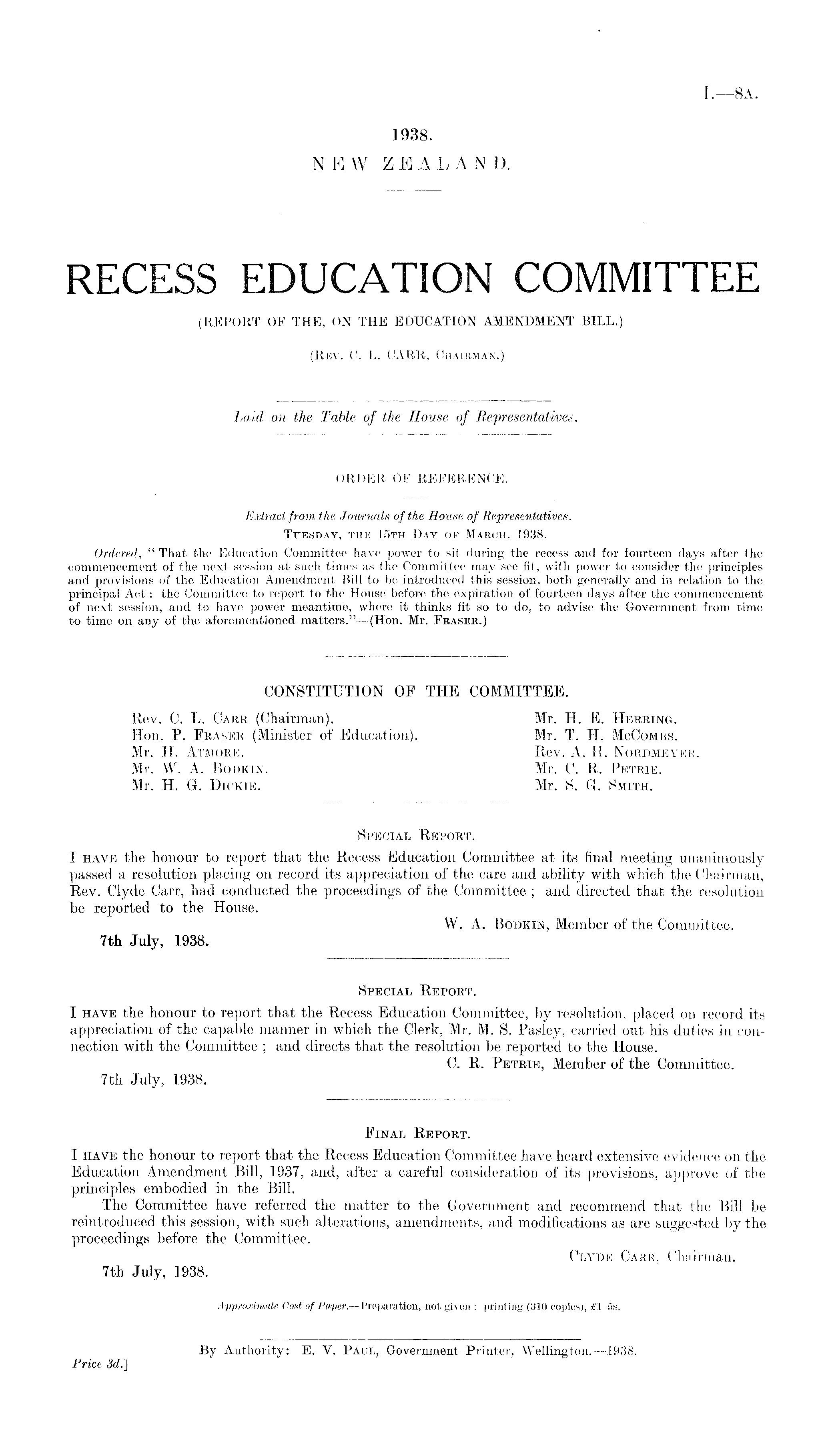 Special Report. I have the honour to report that the Recess Education Committee at its final meeting unanimously passed a resolution placing on record its appreciation of the care and ability with which the Chairman, Rev. Clyde Carr, had conducted the proceedings of the Committee ; and directed that the resolution be reported to the House. W. A. Bodkin, Member of the Committee. 7th July, 1938.
