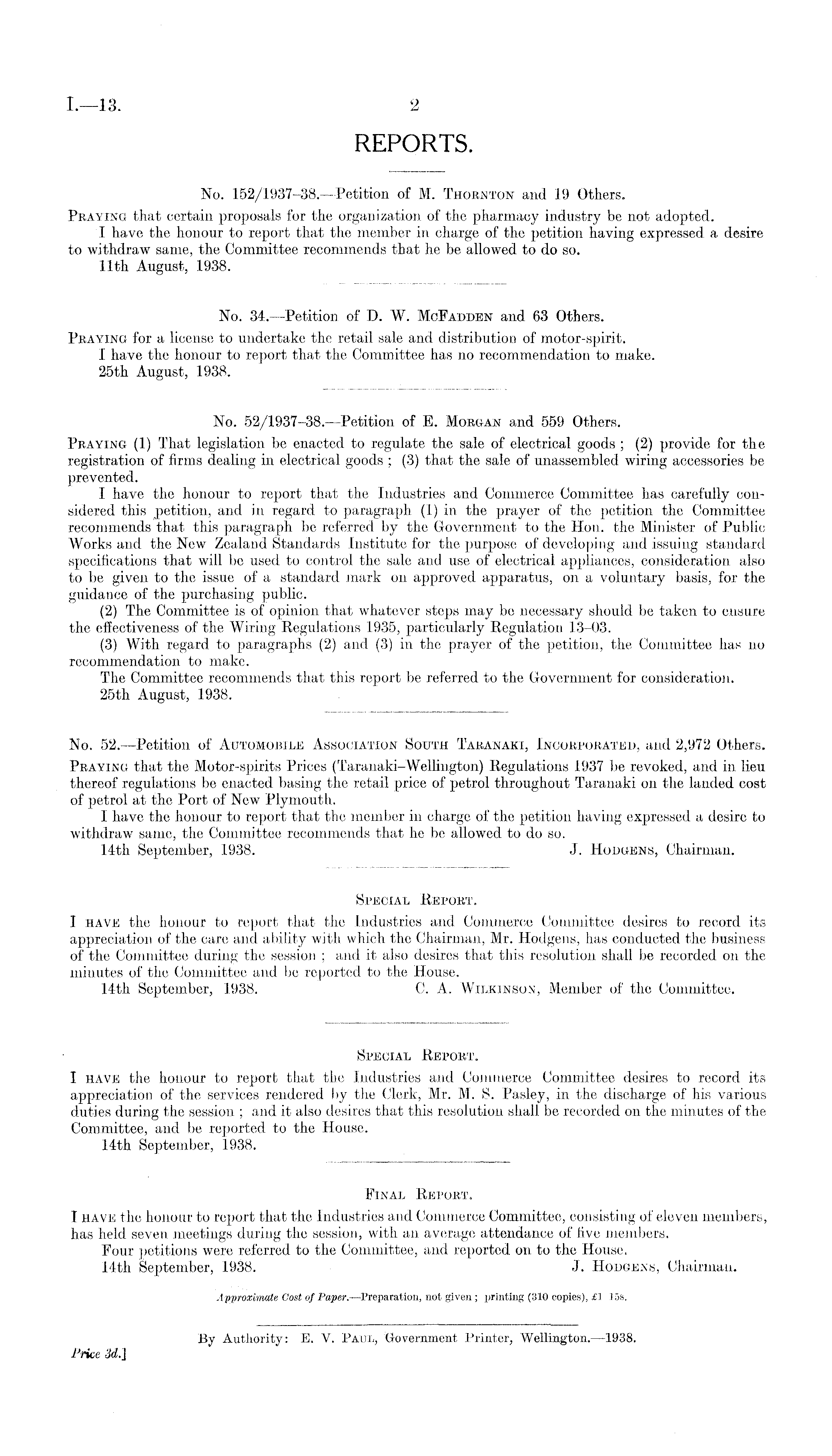 Final Report. I have the honour to report that the Industries and Commerce Committee, consisting of eleven members, has held seven meetings during the session, with an average attendance of live members. Four petitions were referred to the Committee, and reported on to the House. 14th September, 1938. J. Hodgens, Chairman.