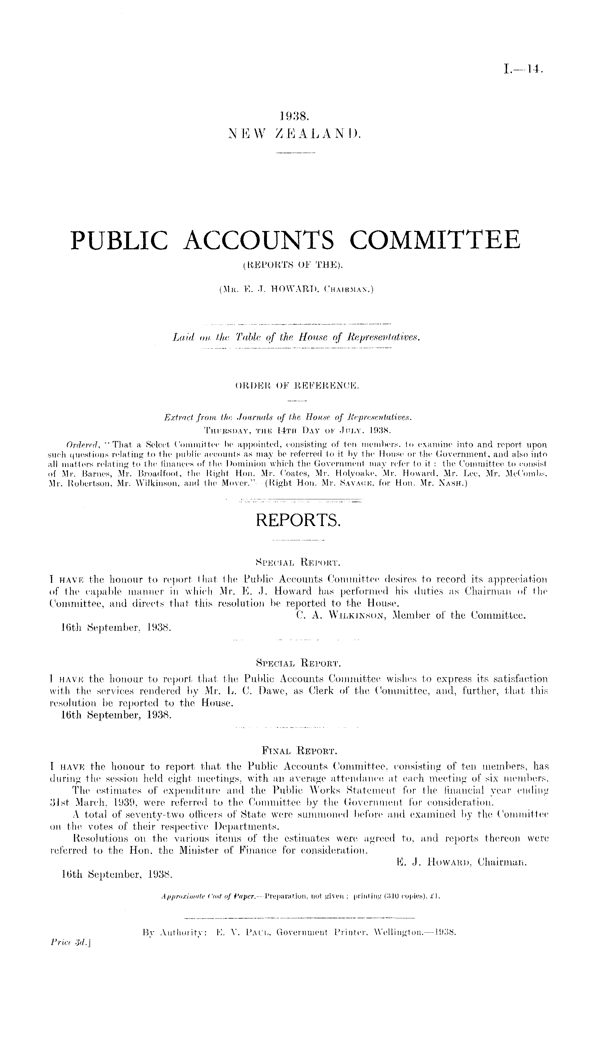 ORDER OF REFERENCE. Extract from the, Journals of the House of Representatives. Thursday, the 14th Day of July, 1938. Ordered, " That a Select Committee be appointed, consisting of ten members, to examine into and report upon such questions relating to the public accounts as may be referred to it by the House or the Government, and also into all matters relating to the finances of the Dominion which the Government may refer to it: the Committee to consist of Mr. Barnes, Mr. Broadfoot, the Right Hon. Mr. Coates, Mr. Holyoake, Mr. Howard, Mr. Lee, Mr. McCombs, Mr. Robertson, Mr. Wilkinson, and the Mover." —(Right Hon. Mr. Savage, for Hon. Mr. Nash.) REPORTS. Special Report. I have the honour to report that the Public Accounts Committee desires to record its appreciation of the capable manner in which Mr. E. J. Howard has performed his duties as Chairman of the Committee, and directs that this resolution be reported to the House. C. A. Wilkinson, Member of the Committee. 16th September, 1938. Special Report. I have the honour to report that the Public Accounts Committee wishes to express its satisfaction with the services rendered by Mr. L. C. Dawe, as Clerk of the Committee, and, further, that this resolution be reported to the House. 16th September, 1938. Final Report. I have the honour to report that the Public Accounts Committee, consisting of ten members, has during the session held eight meetings, with an average attendance at each meeting of six members. The estimates of expenditure and the Public Works Statement for the financial year ending 31st March, 1939, were referred to the Committee by the Government for consideration. A total of seventy-two officers of State were summoned before and examined by the Committee on the votes of their respective Departments. Resolutions on the various items of the estimates were agreed to, and reports thereon were referred to the Hon. the Minister of Finance for consideration. E. J. Howard, Chairman. 16th September, 1938.
