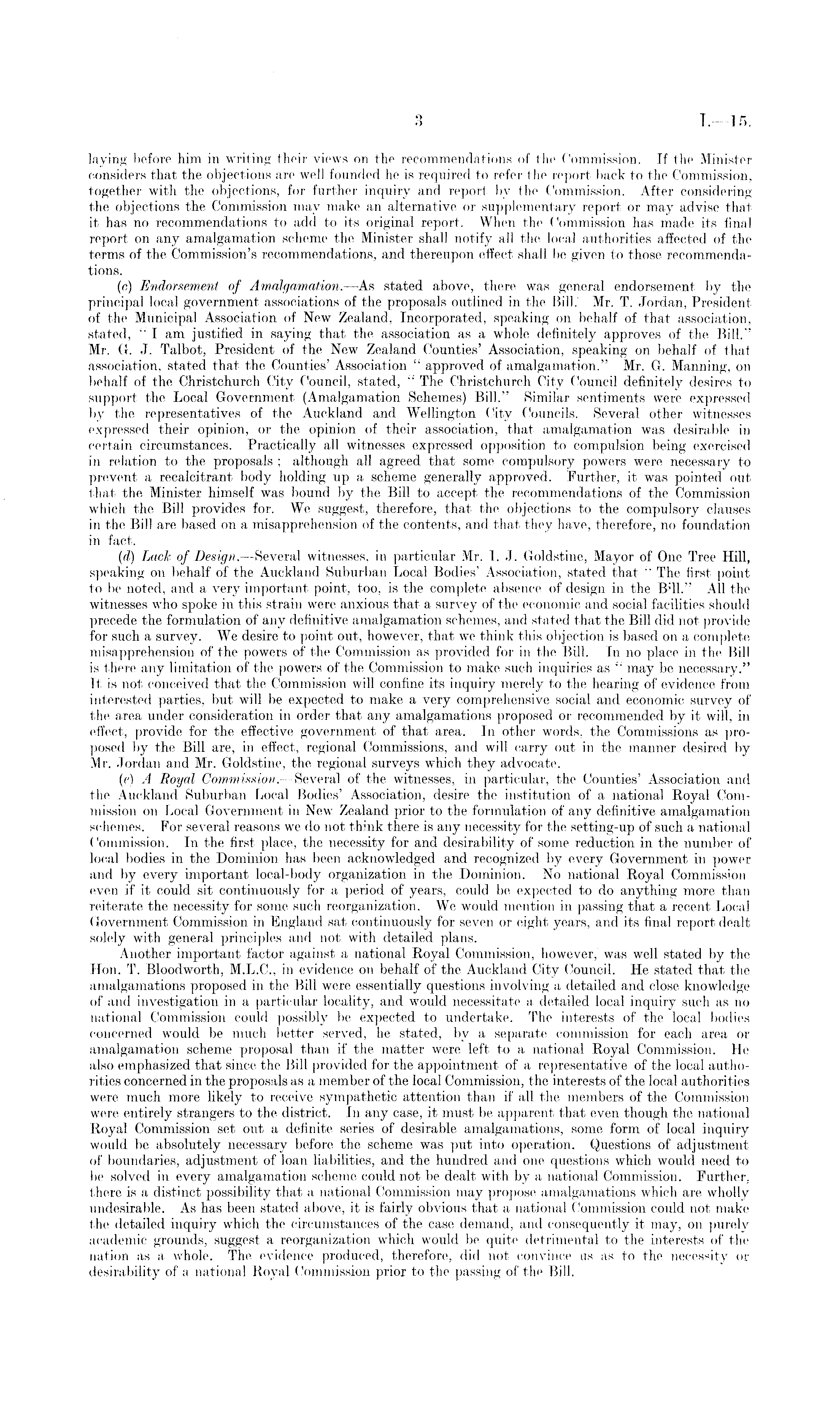 laying before him in writing their views on the recommendations of the Commission. If the Minister considers that the objections are well founded he is required to refer the report back to the Commission, together with the objections, for further inquiry and report by the Commission. After considering the objections the Commission may make an alternative or supplementary report or may advise that it has no recommendations to add to its original report. When the Commission has made its final report on any amalgamation scheme the Minister shall notify all the local authorities affected of the terms of the Commission's recommendations, and thereupon effect shall be given to those recommendations. (c) Endorsement of Amalgamation.—As stated above, there was general endorsement by the principal local government associations of the proposals outlined in the Bill.' Mr. T. Jordan, President of the Municipal Association of New Zealand, Incorporated, speaking on behalf of that association, stated, " I am justified in saying that the association as a whole definitely approves of the Bill." Mr. G. J. Talbot, President of the New Zealand Counties' Association, speaking on behalf of that association, stated that the Counties' Association " approved of amalgamation." Mr. 6. Manning, on behalf of the Christchurch City Council, stated, " The Christchurch City Council definitely desires to support the Local Government (Amalgamation Schemes) Bill." Similar sentiments were expressed by the representatives of the Auckland and Wellington City Councils. Several other witnesses expressed their opinion, or the opinion of their association, that amalgamation was desirable in certain circumstances. Practically all witnesses expressed opposition to compulsion being exercised in relation to the proposals; although all agreed that some compulsory powers were necessary to prevent a recalcitrant body holding up a scheme generally approved. Further, it was pointed out that the Minister himself was bound by the Bill to accept the recommendations of the Commission which the Bill provides for. We suggest, therefore, that the objections to the compulsory clauses in the Bill are based on a misapprehension of the contents, and that they have, therefore, no foundation in fact. (d) Lack of Design.—Several witnesses, in particular Mr. T. J. Goldstine, Mayor of One Tree Hill, speaking 011 behalf of the Auckland Suburban Local Bodies' Association, stated that " The first point to lie noted, and a very important point, too, is the complete absence of design in the B'll." All the witnesses who spoke in this strain were anxious that a survey of the economic and social facilities should precede the formulation of any definitive amalgamation schemes, and stated that the Bill did not provide for such a survey. We desire to point out, however, that we think this objection is based on a complete misapprehension of the powers of the Commission as provided for in the Bill. In no place in the Bill is there any limitation of the powers of the Commission to make such inquiries as " may be necessary." It is not conceived that the Commission will confine its inquiry merely to the hearing of evidence from interested parties, but will be expected to make a very comprehensive social and economic survey of the area under consideration in order that any amalgamations proposed or recommended by it will, in effect, provide for the effective government of that area. In other words, the Commissions as proposed by the Bill are, in effect, regional Commissions, and will carry out in the manner desired by Mr. Jordan and Mr. Goldstine, the regional surveys which they advocate. (e) A Royal Commission. —Several of the witnesses, in particular, the Counties' Association and the Auckland Suburban Local Bodies' Association, desire the institution of a national Royal Commission on Local Government in New Zealand prior to the formulation of any definitive amalgamation schemes. For several reasons we do not think there is any necessity for the setting-up of such a national Commission. In the first place, the necessity for and desirability of some reduction in the number of local bodies in the Dominion has been acknowledged and recognized by every Government in power and by every important local-body organization in the Dominion. No national Royal Commission even if it could sit continuously for a period of years, could be expected to do anything more than reiterate the necessity for some such reorganization. We would mention in passing that a recent Local Government Commission in England sat continuously for seven or eight years, and its final report dealt solely with general principles and not with detailed plans. Another important factor against a national Royal Commission, however, was well stated by the Hon. T. Bloodworth, M.L.C., in evidence on behalf of the Auckland City Council. He stated that the amalgamations proposed in the Bill were essentially questions involving a detailed and close knowledge of and investigation in a particular locality, and would necessitate a detailed local inquiry such as no national Commission could possibly be expected to undertake. The interests of the local bodies concerned would be much better served, he stated, by a separate commission for each area or amalgamation scheme proposal than if the matter were left to a national Royal Commission. He also emphasized that since the Bill provided for the appointment of a representative of the local authorities concerned in the proposals as a member of the local Commission, the interests of the local authorities were much more likely to receive sympathetic attention than if all the members of the Commission were entirely strangers to the district. In any case, it must be apparent that even though the national Royal Commission set out a definite series of desirable amalgamations, some form of local inquiry would be absolutely necessary before the scheme was put into operation. Quest