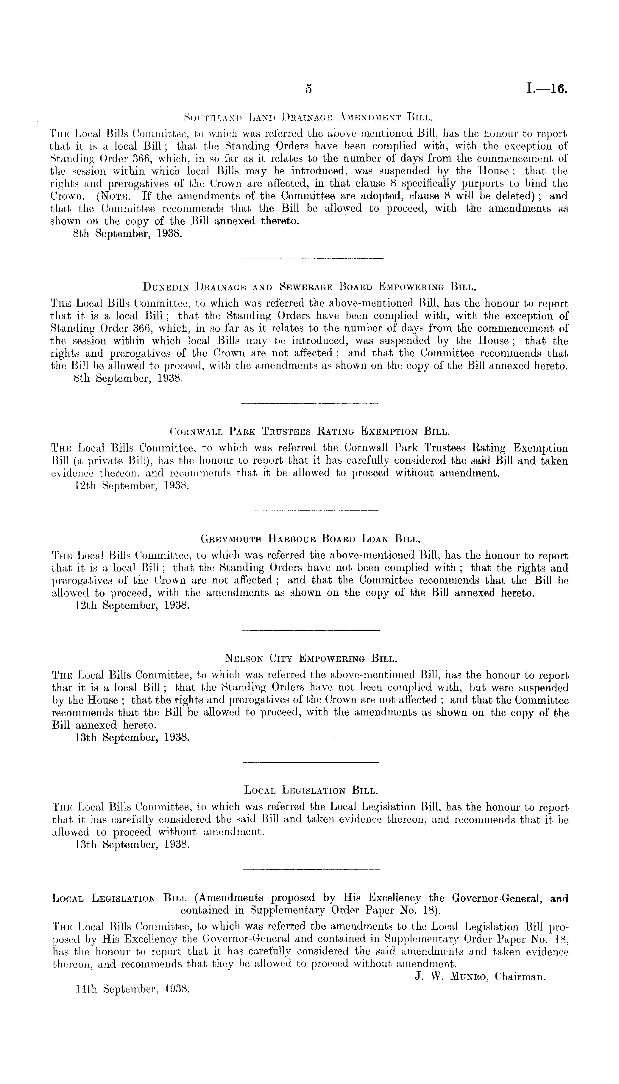 Local Legislation Bill (Amendments proposed by His Excellency the Governor-General, and contained in Supplementary Order Paper No. 18). The Local Bills Committee, to which was referred the amendments to the Local Legislation Bill proposed by His Excellency the Governor-General and contained in Supplementary Order Paper No. 18, has the honour to report that it has carefully considered the said amendments and taken evidence thereon, and recommends that they be allowed to proceed without amendment. J. W. Munro, Chairman. 14th September, 1938.