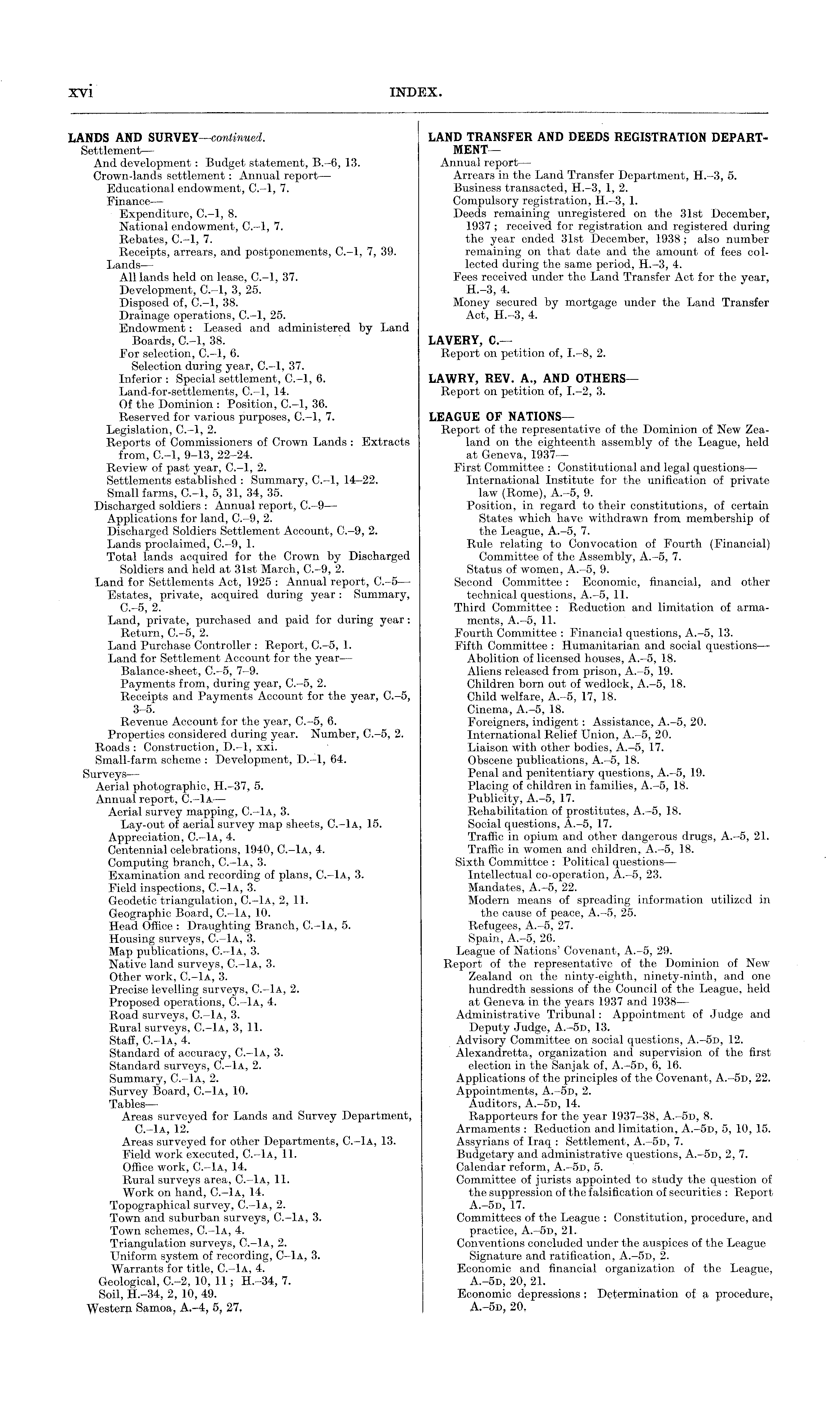 LAND TRANSFER AND DEEDS REGISTRATION DEPARTMENT— Annual report— Arrears in the Land Transfer Department, H.-3, 5. Business transacted, H.-3, 1, 2. Compulsory registration, H.-3, 1. Deeds remaining unregistered on the 31st December, 1937; received for registration and registered during the year ended 31st December, 1938; also number remaining on that date and the amount of fees collected during the same period, H.-3, 4. Fees received under the Land Transfer Act for the year, H.-3, 4. Money secured by mortgage under the Land Transfer Act, H.-3, 4. LAVERY, C.— Report on petition of, 1.-8, 2. LAWRY, REV. A., AND OTHERS— Report on petition of, 1.-2, 3. LEAGUE OF NATIONS— Report of the representative of the Dominion of New Zealand on the eighteenth assembly of the League, held at Geneva, 1937— First Committee : Constitutional and legal questions— International Institute for the unification of private law (Rome), A.-5, 9. Position, in regard to their constitutions, of certain States which have withdrawn from membership of the League, A.-5, 7. Rule relating to Convocation of Fourth (Financial) Committee of the Assembly, A.-5, 7. Status of women, A.-5, 9. Second Committee: Economic, financial, and other technical questions, A.-5, 11. Third Committee : Reduction and limitation of armaments, A.-5, 11. Fourth Committee : Financial questions, A.-5, 13. Fifth Committee : Humanitarian and social questions— Abolition of licensed houses, A.-5, 18. Aliens released from prison, A.-5, 19. Children born out of wedlock, A.-5, 18. Child welfare, A.-5, 17, 18. Cinema, A.-5, 18. Foreigners, indigent: Assistance, A.-5, 20. International Relief Union, A.-5, 20. Liaison with other bodies, A.-5, 17. Obscene publications, A.-5, 18. Penal and penitentiary questions, A.-5, 19. Placing of children in families, A.-5, 18. Publicity, A.-5, 17. Rehabilitation of prostitutes, A.-5, 18. Social questions, A.-5, 17. Traffic in opium and other dangerous drugs, A.-5, 21. Traffic in women and children, A.-5, 18. Sixth Committee : Political questions— Intellectual co-operation, A.-5, 23. Mandates, A.-5, 22. Modern means of spreading information utilized in the cause of peace, A.-5, 25. Refugees, A.-5, 27. Spain, A.-5, 26. League of Nations' Covenant, A.-5, 29. Report of the representative of the Dominion of New Zealand on the ninty-eighth, ninety-ninth, and one hundredth sessions of the Council of the League, held at Geneva in the years 1937 and 1938 — Administrative Tribunal: Appointment of Judge and Deputy Judge, A.-sd, 13. Advisory Committee on social questions, A.-sd, 12. Alexandretta, organization and supervision of the first election in the Sanjak of, A.-sd, 6, 16. Applications of the principles of the Covenant, A.-sd, 22. Appointments, A.-sd, 2. Auditors, A.-sd, 14. Rapporteurs for the year 1937-38, A.-sd, 8. Armaments : Reduction and limitation, A.-sd, 5, 10, 15. Assyrians of Iraq : Settlement, A.-sd, 7. Budgetary and administrative questions, A.-sd, 2, 7. Calendar reform, A.-sd, 5. Committee of jurists appointed to study the question of the suppression of the falsification of securities : Report A.-sd, 17. Committees of the League : Constitution, procedure, and practice, A.-sd, 21. Conventions concluded under the auspices of the League Signature and ratification, A.-sd, 2. Economic and financial organization of the League, A.-sd, 20, 21. Economic depressions ; Determination of a procedure, A.-SD, 20.