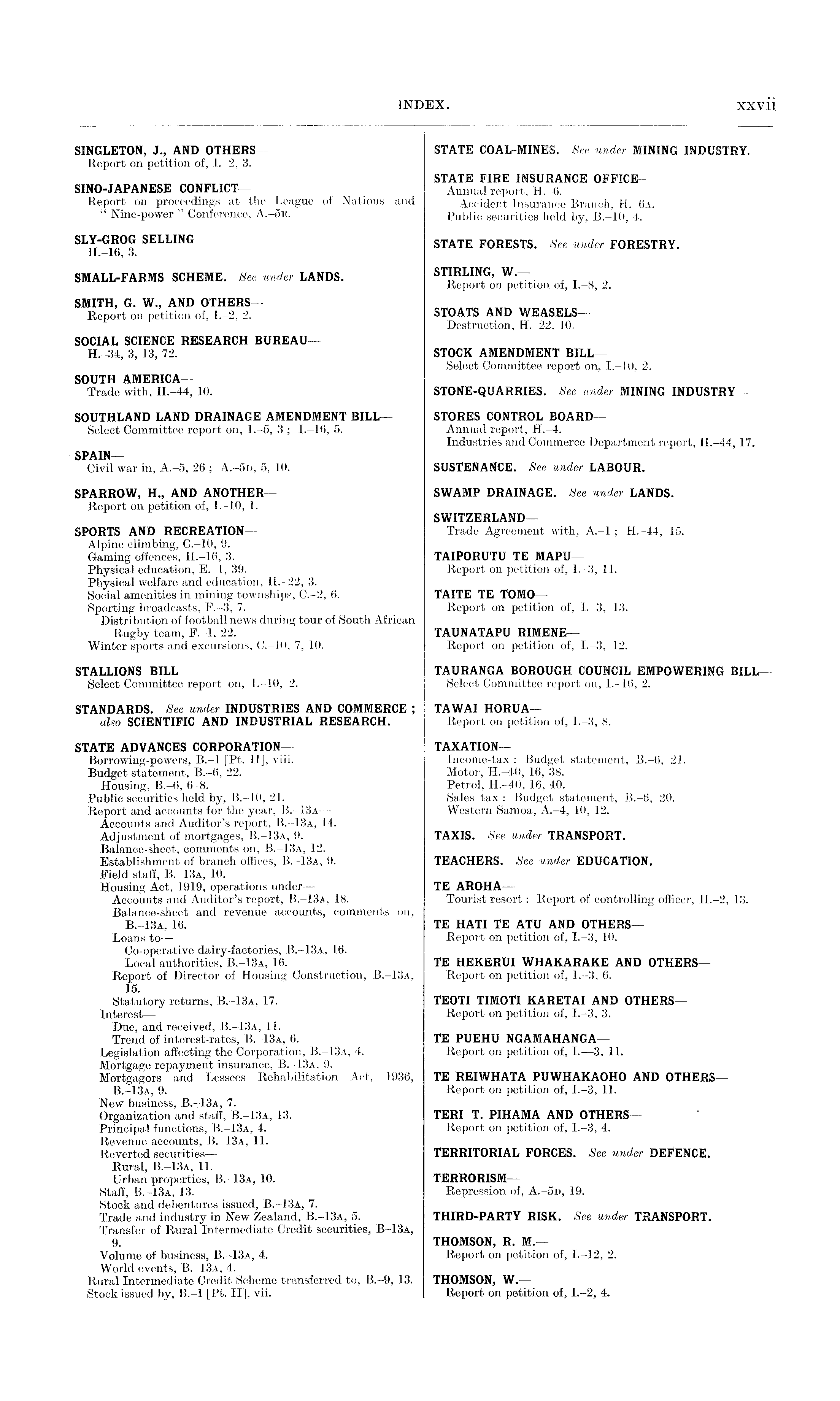 SINGLETON, J., AND OTHERS Report on petition of, 1.-2, 3. SINO-JAPANESE CONFLICT— Report on proceedings at the League of Nations and " Nine-power " Conference, A.-se. SLY-GROG SELLING— H.-16, 3. SMALL-FARMS SCHEME. See under LANDS. SMITH, G. W., AND OTHERS— Report on petition of, 1.-2, 2. SOCIAL SCIENCE RESEARCH BUREAU— H.-34, 3, 13, 72. SOUTH AMERICA— Trade with, H.-44, 10. SOUTHLAND LAND DRAINAGE AMENDMENT BILL— Select Committee report on, 1.-5, 3 ; 1.-16, 5. SPAIN— Civil war in, A.-5, 26 ; A.-sd, 5, 10. SPARROW, H., AND ANOTHER— Report on petition of, 1.-10, 1. SPORTS AND RECREATION— Alpine climbing, C.-10, 9. Gaming offences, H. 16, 3. Physical education, E.-l, 39. Physical welfare and education, H.-22, 3. Social amenities in mining townships, C.-2, 6. Sporting broadcasts, F.-3, 7. Distribution of football news during tour of South African Rugby team, F.-l, 22. Winter sports and excursions, C.-10, 7, 10. STALLIONS BILL— Select Committee report on, 1.-10, 2. STANDARDS. See under INDUSTRIES AND COMMERCE ; also SCIENTIFIC AND INDUSTRIAL RESEARCH. STATE ADVANCES CORPORATION— Borrowing-powers, 8.-l [Pt. ll], viii. Budget statement, 8.-6, 22. Housing, 8.-6, 6-8. Public securities held by, 8.-10, 21. Report and accounts for the year, 8.-13a — Accounts and Auditor's report, 8.-13 a, 14. Adjustment of mortgages, 8.-13 a, 9. Balance-sheet, comments on, 8.-l 3a, 12. Establishment of branch offices, B. -13a, 9. Field staff, 8.-13 a, 10. Housing Act, 1919, operations under — Accounts and Auditor's report, 8.-13 a, 18. Balance-sheet and revenue accounts, comments on, 8.-13 A, 16. Loans to— Co-operative dairy-factories, 8.-13 a, 16. Local authorities, 8.-13 A, 16. Report of Director of Housing Construction, 8.-13 a, 15. Statutory returns, 8.-13 a, 17. Interest — Due, and received, 8.-13 A, 11. Trend of interest-rates, 8.-13 a, 6. Legislation affecting the Corporation, 8.-13 a, 4. Mortgage repayment insurance, 8.-13 a, 9. Mortgagors and Lessees Rehabilitation Act, 1936, 8.-13 a, 9. New business, 8.-13 a, 7. Organization and staff, 8.-13 a, 13. Principal functions, 8.-13 A, 4. Revenue accounts, 8.-13 a, 11. Reverted securities — Rural, 8.-13 a, 11. Urban properties, 8.-13 a, 10. Staff, 8.-13 a, 13. Stock and debentures issued, 8.-13 a, 7. Trade and industry in New Zealand, 8.-13 a, 5. Transfer of Rural Intermediate Credit securities, B-13a, 9. Volume of business, 8.-13 a, 4. World events, 8.—13 a, 4. Rural Intermediate Credit Scheme transferred to, 8.-9, 13. Stock issued by, 8.-l [Pt. ll], vii.