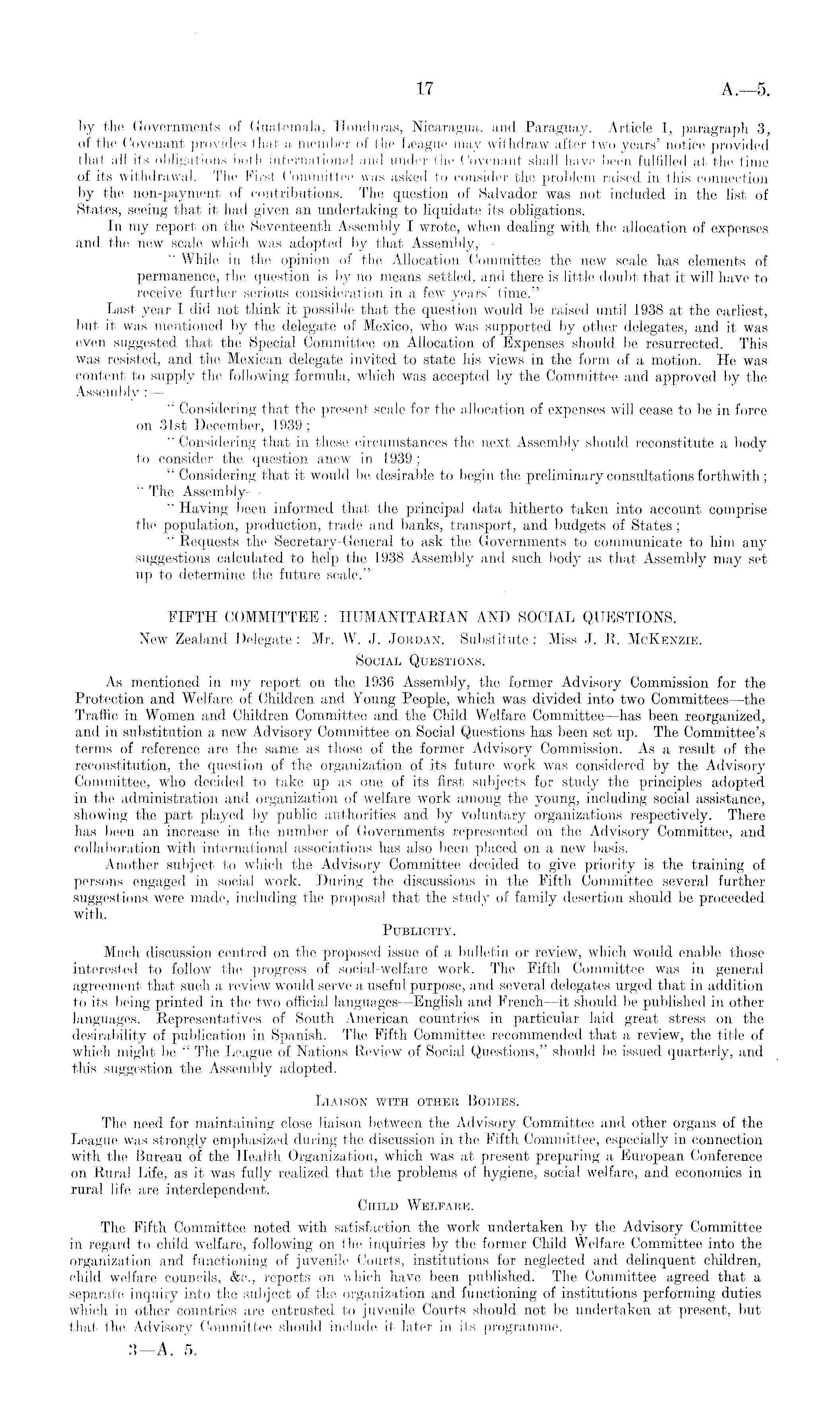 by the Governments of Guatemala, Honduras, Nicaragua, and Paraguay. Article 1, paragraph 3, of the Covenant provides that a member of the League may withdraw after two years' notice provided that all its obligations both international and under the Covenant shall have been fulfilled at the time of its withdrawal. The First Committee was asked to consider the problem raised in this connection by the non-payment of contributions. The question of Salvador was not included in the list of States, seeing that it had given an undertaking to liquidate its obligations. In my report on the Seventeenth Assembly I wrote, when dealing with, the allocation of expenses and the new scale which, was adopted by that Assembly,— " While in the opinion of the Allocation Committee the new scale has elements of permanence, the question is by no means settled, and there is little doubt that it will have to receive further serious consideration in a few years' time." Last year I did not think it possible that the question would be raised until 1938 at the earliest, but it was mentioned by the delegate of Mexico, who was supported by other delegates, and it was even suggested that the Special Committee on Allocation of Expenses should be resurrected. This was resisted, and the Mexican delegate invited to state his views in the form of a motion. He was content to supply the following formula, which was accepted by the Committee and approved by the Assembly : — Considering that the present scale for the allocation of expenses will cease to be in force on 31st December, 1939 ; " Considering that in these circumstances the next Assembly should reconstitute a body to consider the question anew in 1939 ; " Considering that it would be desirable to begin the preliminary consultations forthwith; " The Assembly— " Having been informed that the principal data hitherto taken into account comprise the population, production, trade and banks, transport, and budgets of States ; " Requests the Secretary-General to ask the Governments to communicate to him any suggestions calculated to help the 1938 Assembly and such body as that Assembly may set up to determine the future scale." FIFTH COMMITTEE : HUMANITARIAN AND SOCIAL QUESTIONS. New Zealand Delegate: Mr. W. J. Jordan. Substitute: Miss J. R. McKenzie. Social Questions. As mentioned in my report on the 1936 Assembly, the former Advisory Commission for the Protection and Welfare of Children and Young People, which was divided into two Committees—the Traffic in Women and Children Committee and the Child Welfare Committee—has been reorganized, and in substitution a new Advisory Committee on Social Questions has been set up. The Committee's terms of reference are the same as those of the former Advisory Commission. As a result of the reconstitution, the question of the organization of its future work was considered by the Advisory Committee, who decided to take up as one of its first subjects for study the principles adopted in the administration and organization of welfare work among the young, including social assistance, showing the part played by public authorities and by voluntary organizations respectively. There has been an increase in the number of Governments represented on the Advisory Committee, and collaboration with international associations has also been placed on a new basis. Another subject to which the Advisory Committee decided to give priority is the training of persons engaged in social work. During the discussions in the Fifth Committee several further suggestions were made, including the proposal that the study of family desertion should be proceeded with. Publicity. Much discussion centred on the proposed issue of a bulletin or review, which would enable those interested to follow the progress of social-welfare work. The Fifth Committee was in general agreement that such a review would serve a useful purpose, and several delegates urged that in addition to its being printed in the two official languages —English and French —it should be published in other languages. Representatives of South American countries in particular laid great stress on the desirability of publication in Spanish. The Fifth Committee recommended that a review, the title of which might be " The League of Nations Review of Social Questions," should be issued quarterly, and this suggestion the Assembly adopted. Liaison with other Bodies. The need for maintaining close liaison between the Advisory Committee and other organs of the League was strongly emphasized during the discussion in the Fifth Committee, especially in connection with the Bureau of the Health Organization, which was at present preparing a European Conference on Rural Life, as it was fully realized that the problems of hygiene, social welfare, and economics in rural life are interdependent. Child Welfare. The Fifth Committee noted with satisfaction the work undertaken by the Advisory Committee in regard to child welfare, following on the inquiries by the former Child Welfare Committee into the organization and functioning of juvenile Courts, institutions for neglected and delinquent children, child welfare councils, &c., reports on which have been published. The Committee agreed that a separate inquiry into the subject of the organization and functioning of institutions performing duties which in other countries are entrusted to juvenile Courts should not be undertaken at present, but that the Advisory Committee should include it later in its programme.