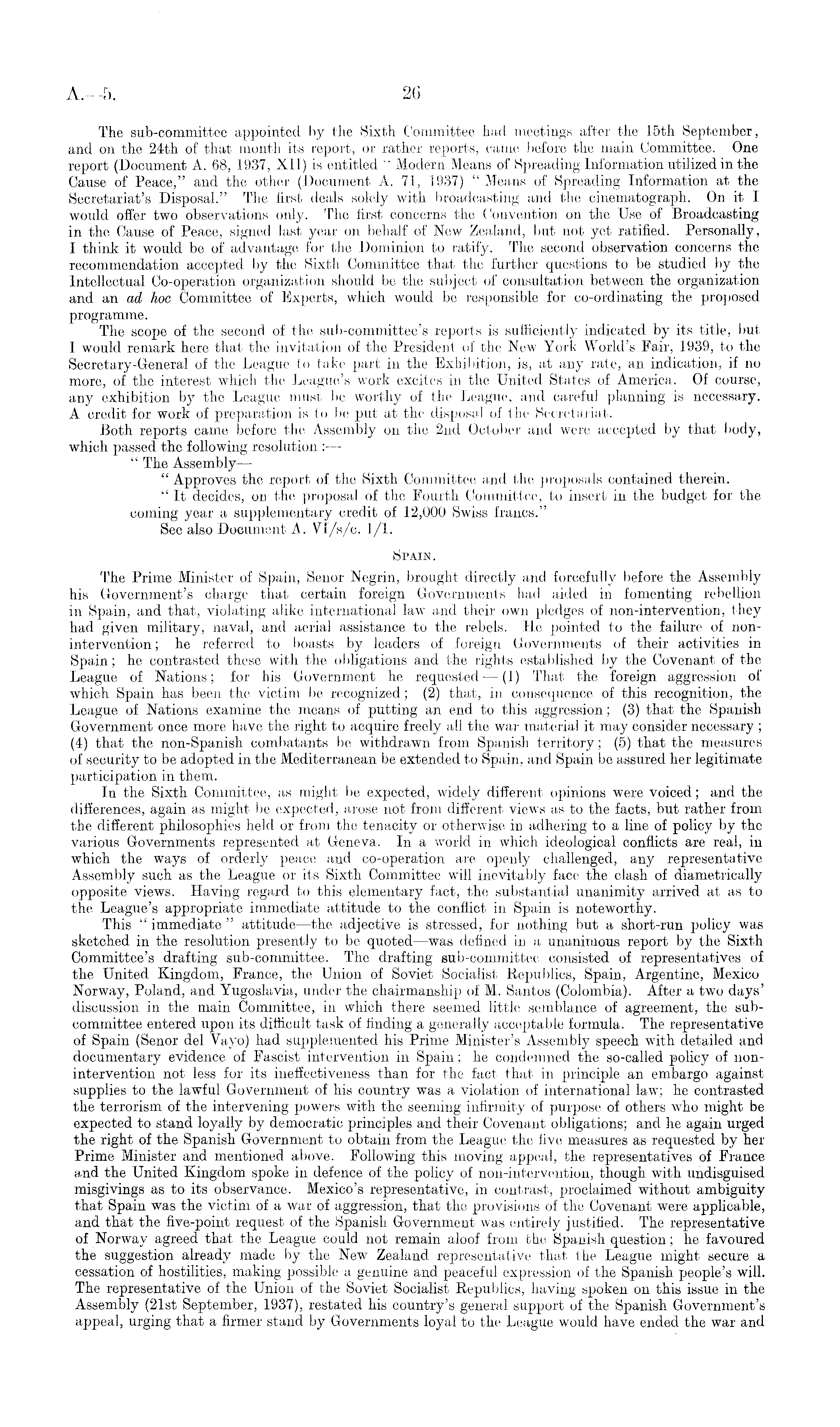 The sub-committee appointed by the Sixth Committee had meetings after the 15th September, and on the 24th of that month its report, or rather reports, came before the main Committee. One report (Document A. 68, 1937, XII) is entitled " Modern Means of Spreading Information utilized in the Cause of Peace," and the other (Document A. 71, 1937) " Means of Spreading Information at the Secretariat's Disposal." The first deals solely with broadcasting and the cinematograph. On it I would offer two observations only. The first concerns the Convention on the Use of Broadcasting in the Cause of Peace, signed last year on behalf of New Zealand, but not yet ratified. Personally, I think it would be of advantage for the Dominion to ratify. The second observation concerns the recommendation accepted by the Sixth Committee that the further questions to be studied by the Intellectual Co-operation organization should be the subject of consultation between the organization and an ad hoc Committee of Experts, which would be responsible for co-ordinating the proposed programme. The scope of the second of the sub-committee's reports is sufficiently indicated by its title, but I would remark here that the invitation of the President of the New York World's Fair, 1939, to the Secretary-General of the League to take part in the Exhibition, is, at any rate, an indication, if no more, of the interest which the League's work excites in the United States of America. Of course, any exhibition by the League must be worthy of the League, and careful planning is necessary. A credit for work of preparation is to be put at the disposal of the Secretariat. Both reports came before the Assembly on the 2nd October and were accepted by that body, which passed the following resolution : — " The Assembly— " Approves the report of the Sixth Committee and the proposals contained therein. " It decides, on the proposal of the Fourth Committee, to insert in the budget for the coming year a supplementary credit of 12,000 Swiss francs." See also Document A. VI/s/c. 1/1. Spain. The Prime Minister of Spain, Senor Negrin, brought directly and forcefully before the Assembly his Government's charge that certain foreign Governments had aided in fomenting rebellion in Spain, and that, violating alike international law and their own pledges of non-intervention, they had given military, naval, and aerial assistance to the rebels. He pointed to the failure of nonintervention ; he referred to boasts by leaders of foreign Governments of their activities in Spain; he contrasted these with the obligations and the rights established by the Covenant of the League of Nations; for his Government he requested — (1) That the foreign aggression of which Spain has been the victim be recognized; (2) that, in consequence of this recognition, the League of Nations examine the means of putting an end to this aggression; (3) that the Spanish Government once more have the right to acquire freely all the war material it may consider necessary ; (4) that the non-Spanish combatants be withdrawn from Spanish territory; (5) that the measures of security to be adopted in the Mediterranean be extended to Spain, and Spain be assured her legitimate participation in them. In the Sixth Committee, as might be expected, widely different opinions were voiced; and the differences, again as might be expected, arose not from different views as to the facts, but rather from the different philosophies held or from the tenacity or otherwise in adhering to a line of policy by the various Governments represented at Geneva. In a world in which ideological conflicts are real, in which the ways of orderly peace and co-operation are openly challenged, any representative Assembly such as the League or its Sixth Committee will inevitably face the clash of diametrically opposite views. Having regard to this elementary fact, the substantial unanimity arrived at as to the League's appropriate immediate attitude to the conflict in Spain is noteworthy. This " immediate " attitude —the adjective is stressed, for nothing but a short-run policy was sketched in the resolution presently to be quoted —was defined in a unanimous report by the Sixth Committee's drafting sub-committee. The drafting sub-committee consisted of representatives of the United Kingdom, France, the Union of Soviet Socialist Republics, Spain, Argentine, Mexico Norway, Poland, and Yugoslavia, under the chairmanship of M. Santos (Colombia). After a two days' discussion in the main Committee, in which there seemed little semblance of agreement, the subcommittee entered upon its difficult task of finding a generally acceptable formula. The representative of Spain (Senor del Vayo) had supplemented his Prime Minister's Assembly speech with detailed and documentary evidence of Fascist intervention in Spain; he condemned the so-called policy of nonintervention not less for its ineffectiveness than for the fact that in principle an embargo against supplies to the lawful Government of his country was a violation of international law; he contrasted the terrorism of the intervening powers with the seeming infirmity of purpose of others who might be expected to stand loyally by democratic principles and their Covenant obligations; and he again urged the right of the Spanish Government to obtain from the League the five measures as requested by her Prime Minister and mentioned above. Following this moving appeal, the representatives of France and the United Kingdom spoke in defence of the policy of non-intervention, though with undisguised misgivings as to its observance. Mexico's representative, in contrast, proclaimed without ambiguity that Spain was the victim of a war of aggression, that the provisions of the Covenant were applicable, and that the five-point request of the Spanish Government was entirely justified. The representative of Norway agreed that the League could not remain aloof from the Spanish question; he favoure