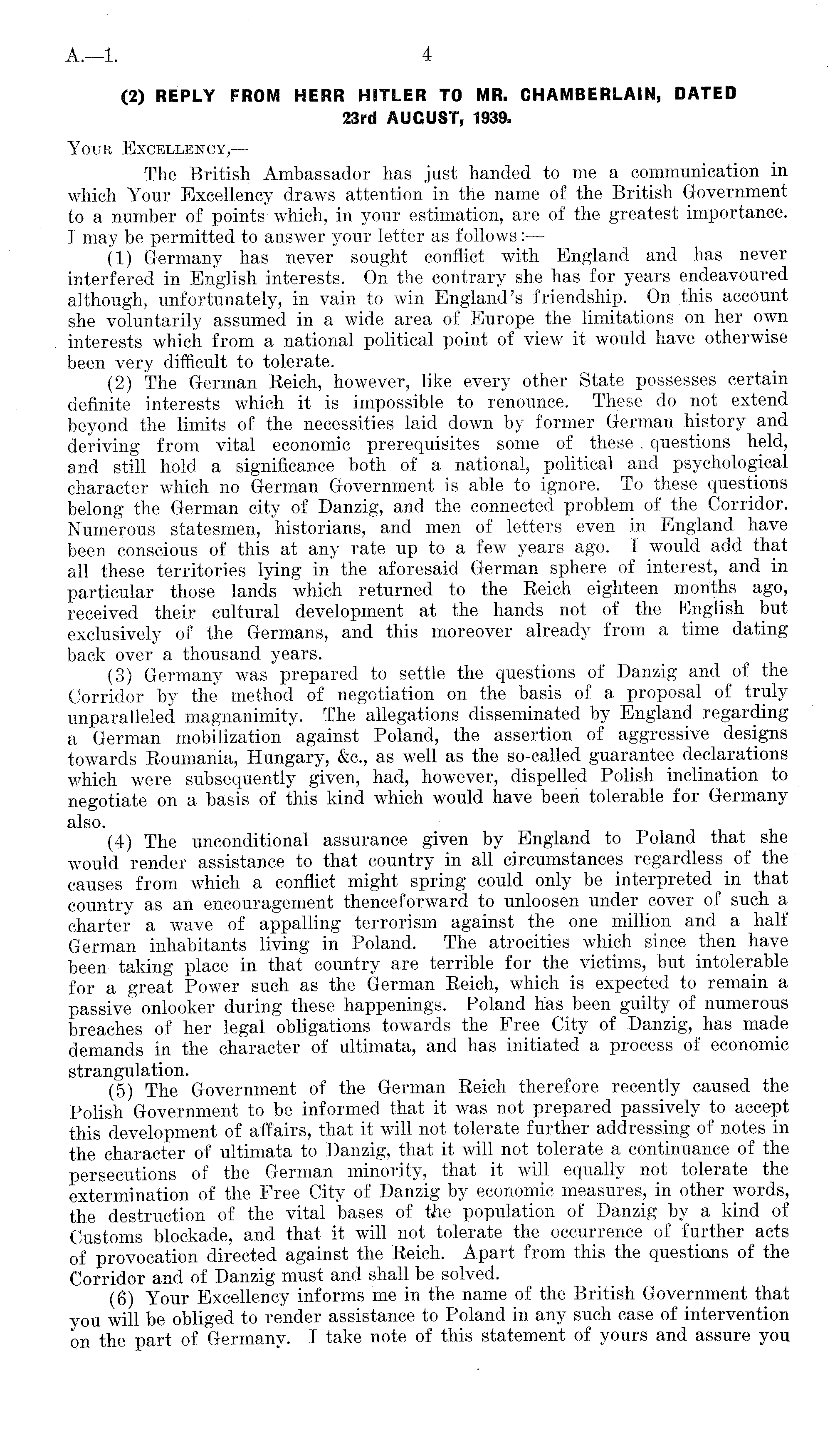 (2) REPLY FROM HERR HITLER TO MR. CHAMBERLAIN, DATED 23rd AUGUST, 1939, Your Excellency,— The British Ambassador has just handed to me a communication in which Your Excellency draws attention in the name of the British Government to a number of points which, in your estimation, are of the greatest importance. I may be permitted to answer your letter as follows: — (1) Germany has never sought conflict with England and has never interfered in English interests. On the contrary she has for years endeavoured although, unfortunately, in vain to win England's friendship. On this account she voluntarily assumed in a wide area of Europe the limitations on her own interests which from a national political point of view it would have otherwise been very difficult to tolerate. (2) The German Reich, however, like every other State possesses certain definite interests which it is impossible to renounce. These do not extend beyond the limits of the necessities laid down by former German history and deriving from vital economic prerequisites some of these questions held, and still hold a significance both of a national, political and psychological character which no German Government is able to ignore. To these questions belong the German city of Danzig, and the connected problem of the Corridor. Numerous statesmen, historians, and men of letters even in England have been conscious of this at any rate up to a few years ago. I would add that all these territories lying in the aforesaid German sphere of interest, and in particular those lands which returned to the Reich eighteen months ago, received their cultural development at the hands not of the English but exclusively of the Germans, and this moreover already from a time dating back over a thousand years. (3) Germany was prepared to settle the questions of Danzig and of the Corridor by the method of negotiation on the basis of a proposal of truly unparalleled magnanimity. The allegations disseminated by England regarding a German mobilization ' against Poland, the assertion of aggressive designs towards Roumania, Hungary, &c., as well as the so-called guarantee declarations which were subsequently given, had, however, dispelled Polish inclination to negotiate on a basis of this kind which would have been tolerable for Germany also. (4) The unconditional assurance given by England to Poland that she would render assistance to that country in all circumstances regardless _ of the causes from which a conflict might spring could only be interpreted in that country as an encouragement thenceforward to unloosen under cover of such a charter a wave of appalling terrorism against the one million and a half German inhabitants living in Poland. The atrocities which since then have been taking place in that country are terrible for the victims, but intolerable for a great Power such as the German Reich, which is expected to remain a passive onlooker during these happenings. Poland has been guilty of numerous breaches of her legal obligations towards the Free City of Danzig, has made demands in the character of ultimata, and has initiated a process of economic strangulation. (5) The Government of the German Reich therefore recently caused the Polish Government to be informed that it was not prepared passively to accept this development of affairs, that it will not tolerate further addressing of notes in the character of ultimata to Danzig, that it will not tolerate a continuance of the persecutions of the German minority, that it will equally not tolerate the extermination of the Free City of Danzig by economic measures, in other words, the destruction of the vital bases of the population of Danzig by a kind of Customs blockade, and that it will not tolerate the occurrence of further acts of provocation directed against the Reich. Apart from this the questions of the Corridor and of Danzig must and shall be solved. (6) Your Excellency informs me in the name of the British Government that you will be obliged to render assistance to Poland in any such case of intervention on the part of Germany. T take note of this statement of yours and assure you