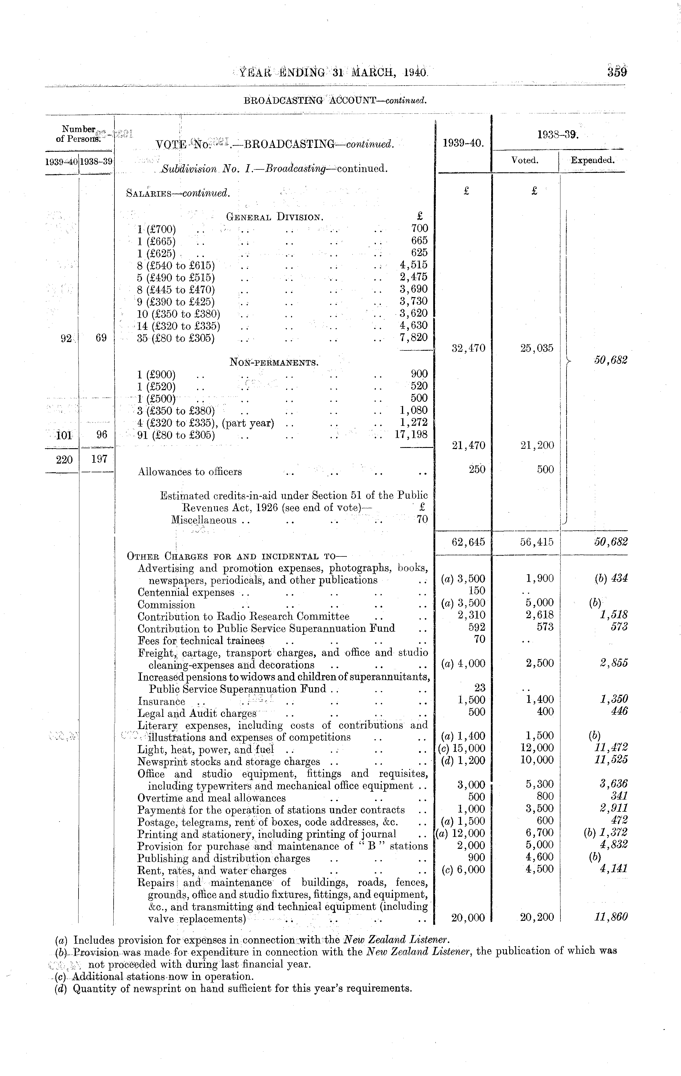 (a) Includes provision for expenses in connection with the New Zealand Listener. (&)-. Provision was made for expenditure in connection with the New Zealand Listener, the publication of which was C; \ not proceeded with during last financial year. (c) Additional stations now in operation. (d) Quantity of newsprint on hand sufficient for this year's requirements.