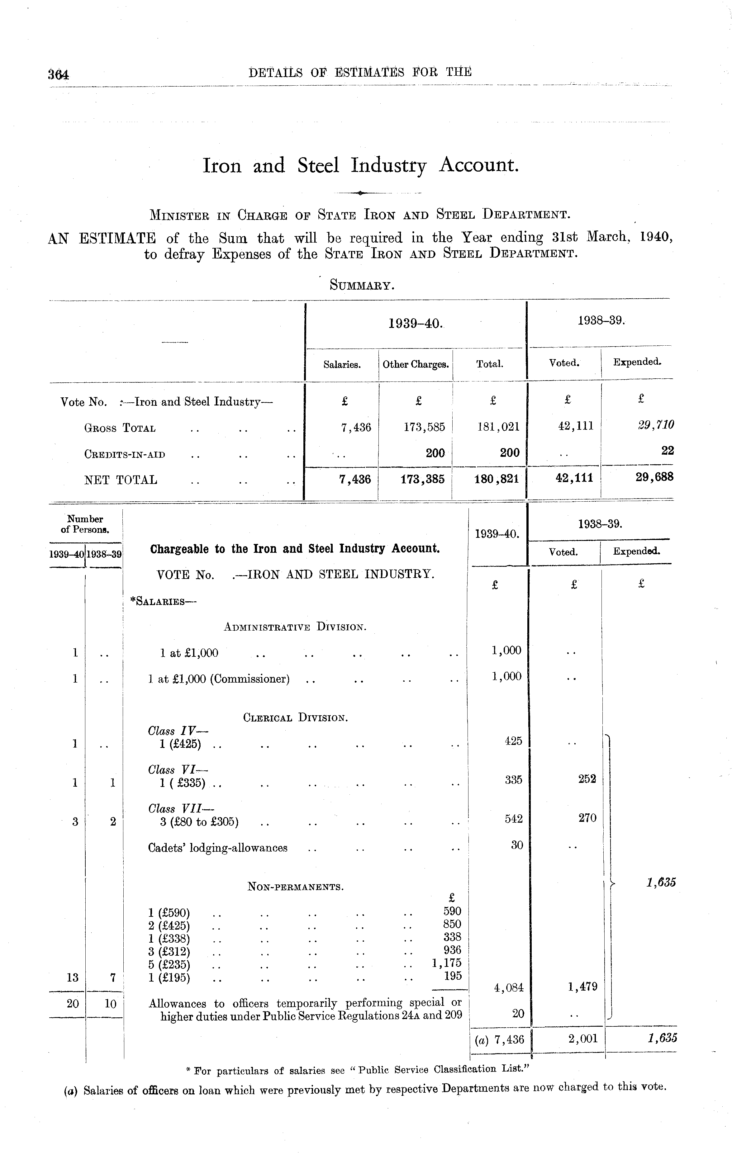 1939-40. 1938-39. Salaries. Other Charges. : Total. Voted. Expended. Vote No. .• —Iron and Steel Industry—• £ £ £ £ £ GROSS TOTAL .. .. .. 7,436 173,585 181,021 42,111 29,710 Credits-IN-AID .. .. .. 200 200 . 22 NET TOTAL .. .. 7,436 173,385 180,821 42,111 29,688 f N " mber 1938-39. of Persons. 1939-40. 1939^401938-39 Chargeable to the Iron and Steel Industry Account. Voted- Expended. ; VOTE No. .—IRON AND STEEL INDUSTRY. j ~ | £ £ £ ♦Salaries — Administrative Division. 1 .. 1 at £1,000 .. .. .. .. .. j 1,000 1 .. 1 at £1,000 (Commissioner) .. .. .. .. 1,000 Clerical Division. Class IV — 1 1 (£425) 425 Class VI — 1 1 1 (£335) .. .. .. .. •• • • 335 252 Class VII— 3 2 3 (£80 to £305) .. .. .. .. • • 542 270 Cadets' lodging-allowances .. .. ■ ■ • • 30 Non-perm anents. r" 1,635 £ 1 (£590) .. .. .. • • •• 590 2 (£425) .. .. .. .. • • 850 1 (£338) .. .. .. .. ■• 338 3 (£312) .. .. .. .. .. 936 5 (£235) .. .. .. .. 1,175 13 7 1 £195) .. .. .. .. •• 195 1 4,084 1,479 20 10 Allowances to officers temporarily performing special or higher duties under Public Service Regulations 24a and 209 20 (a) 7,436 2,001 1,635 | * For particulars of salaries see " Public Service Classification List."