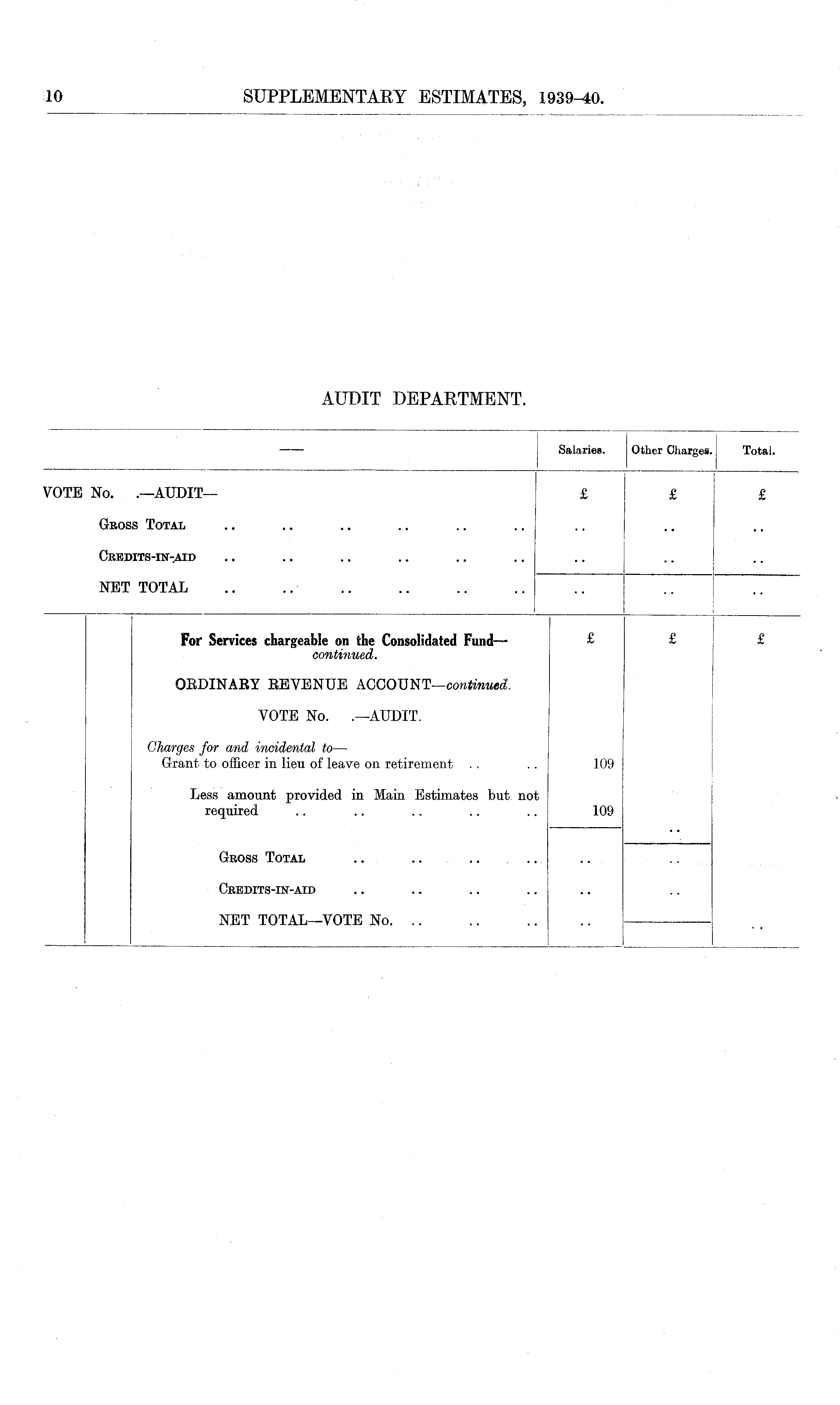 I | Salaries. Other Charges. Total. VOTE No. .—AUDIT— £ £ £ Gross Total Credits-in-aid NET TOTAL .. .. | I i For Services chargeable on the Consolidated Fund — £ £ £ continued. ORDINARY REVENUE ACCOUNT —continued. VOTE No. .—AUDIT. Charges for and incidental to — Grant to officer in lieu of leave on retirement . . .. I 109 Less amount provided in Main Estimates but not required .. .. .. .. .. 109 Gross Total Credits-in-aid NET TOTAL—VOTE No. .. .. .. ..