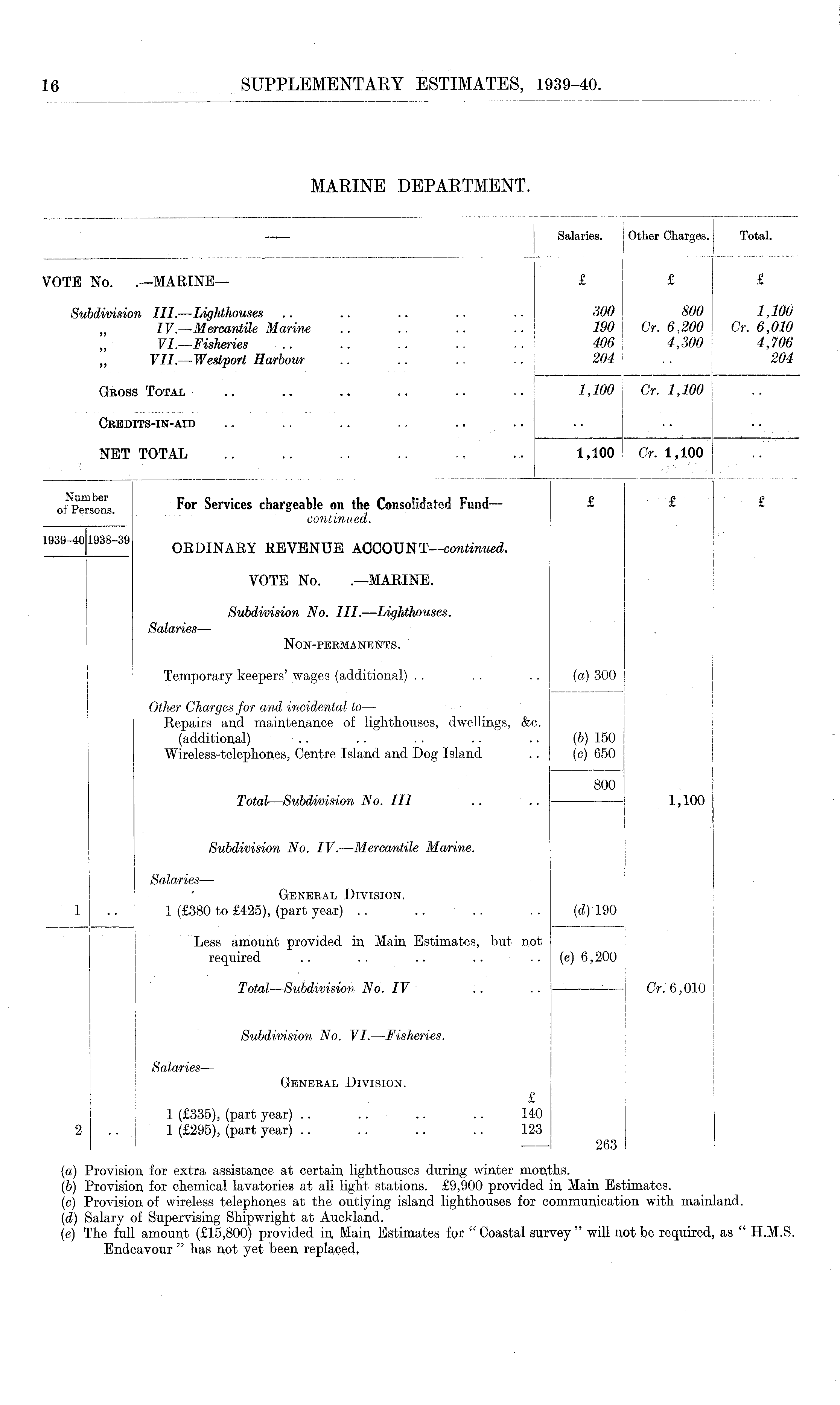 Salaries. Other Charges, i Total. VOTE No. .—MARINE— £ £ £ Subdivision III.—Lighthouses .. .. .. .. .. 300 800 1,100 „ IV. —Mercantile Marine .. .. .. .. 190 Or. 6,200 Cr. 6,010 VI.—Fisheries .. .. 406 4,300 4,706 „ VII.—Westport Harbour .. .. .. .. 204 .. 204 Gross Total .. .. .. .. .. .. 1,100 Cr. 1,100 Credits-in-aid NET TOTAL .. 1,100 Cr. 1,100 of N Persons. F° r Services chargeable on the Consolidated Fund — £ £ £ ' continued. 1939—id 193S-39 OEDINAEY KEVENUE ACCOUNT —continued. VOTE No. .—MARINE. Subdivision No. III. —Lighthouses. Salaries — Non-permanents. Temporary keepers' wages (additional) . . . . . . (a) 300 Other Charges for and incidental to— Repairs and maintenance of lighthouses, dwellings, &c. (additional) . . .. . . . . . . (b) 150 Wireless-telephones, Centre Island and Dog Island .. (c) 650 I 800 Total—Subdivision No. Ill .. .. — 1,100 Subdivision No. IV. —Mercantile Marine. Salaries — General Division. 1 1 (£380 to £425), (part year) .. .. .. . . (d) 190 Less amount provided in Main Estimates, but not required .. . . .. .. (e) 6,200 Total —Subdivision No. IV .. .. — Cr. 6,010 Subdivision No. VI. —Fisheries. Salaries — General Division. £ 1 (£335), (part year) .. .. .. .. 140 2 1 (£295), (part year) .. .. .. .. 123 I 263