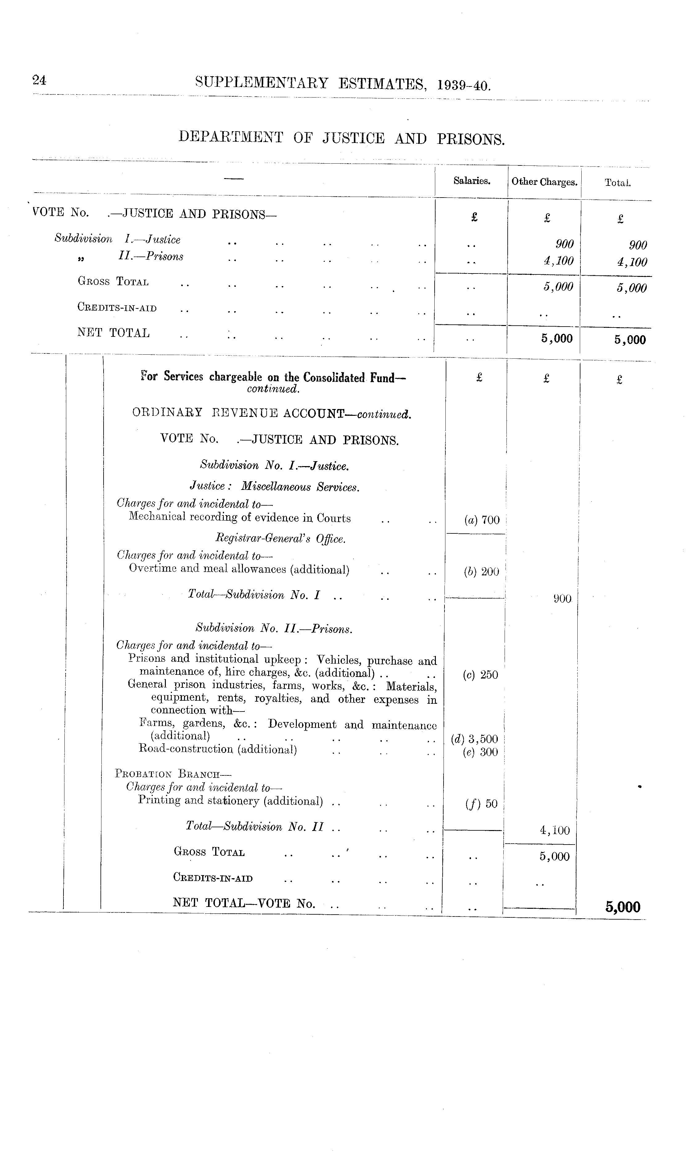 Salaries. Other Charges. ! Total. VOTE No. .—JUSTICE AND PRISONS— £ £ £ Subdivision I j —Justice .. .. .. qqq qqq » II—Prisons .. .. .. . 4,100 4,100 Gross Total .. ~ ~~ Credits-in-aid NET T0TAL ~ 5,000 5,000 _ _ __ I For Services chargeable on the Consolidated Fund— £ £ £ continued. ORDINARY REVENUE ACCOUNT—continued. VOTE No. .—JUSTICE AND PRISONS. Subdivision No. I.—Justice. Justice: Miscellaneous Services. Charges for and incidental to — Mechanical recording of evidence in Courts .. .. (a) 700 Registrar-General's Office. Charges for and incidental to — Overtime and meal allowances (additional) .. . . (6) 200 Total—Subdivision No. I .. .. .. . 900 j Subdivision No. II.—Prisons. Charges for and incidental to — Prisons and institutional upkeep : Vehicles, purchase and maintenance of, hire charges, &c. (additional) .. .. ( c ) 250 General prison industries, farms, works, &c. : Materials, equipment, rents, royalties, and other expenses in connection with— Farms, gardens, &c. : Development and maintenance (additional) .. .. .. .. (rf) 3,500 Road-construction, (additional) . . . . . . ( e ) 300 Probation Branch— Charges for and incidental to — : Printing and stationery (additional) .. . . .. (/) 50 I Total—Subdivision No. II .. .. .. 4,100 Gross Total .. .. ' .. .. _ _ j 5 000 Credits-in-aid ___ NET TOTAL—VOTE No. .. .. .. j, 5^000