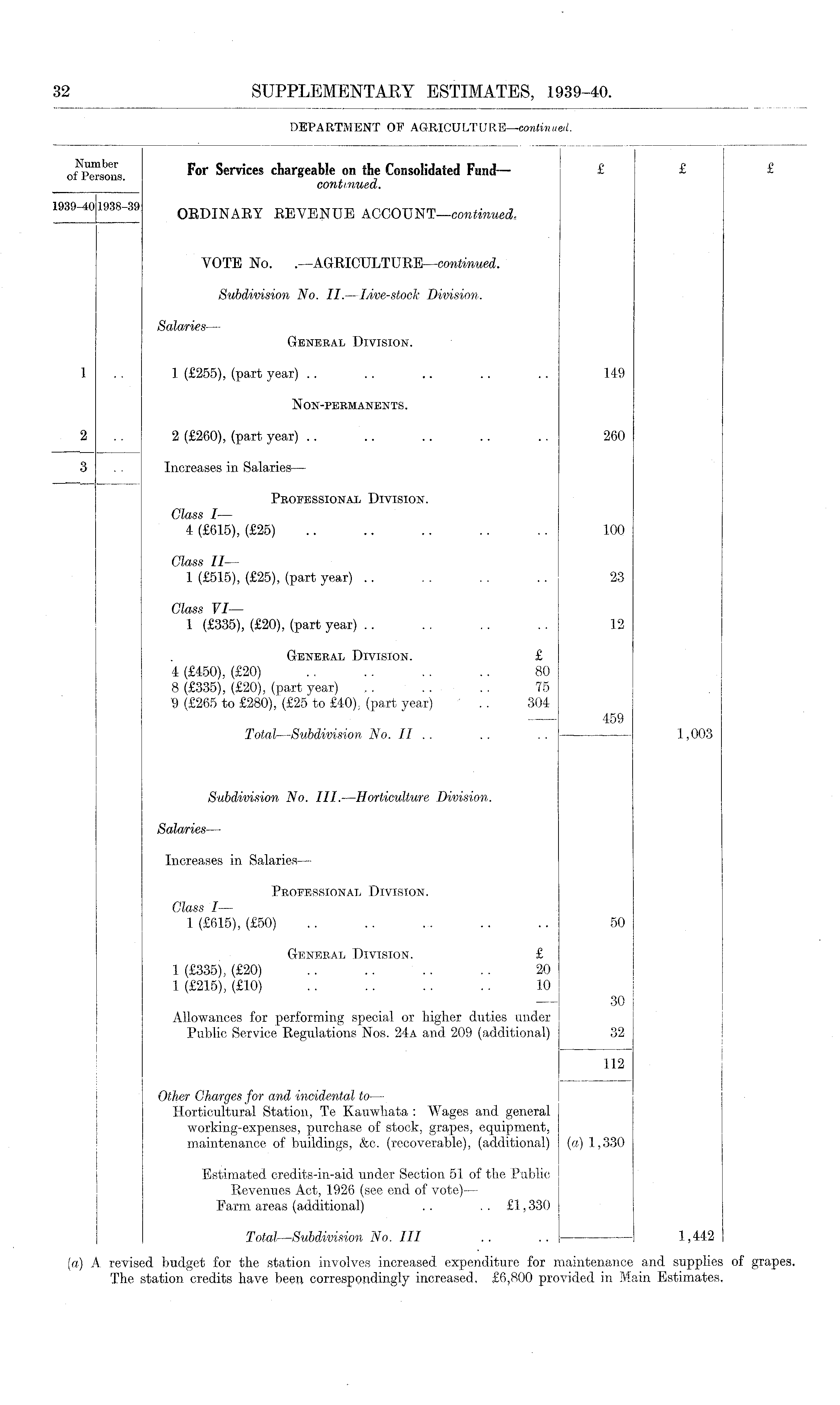of*Persc»is F<"" Services chargeable on the Consolidated Fund — £ £ £ continued. 1939-401938-39 ORDINARY REVENUE ACCOUNT—continued. VOTE No. . —AGRICULTURE —continued. Subdivision No. II.— Live-stock Division. Salaries — General Division. 1 1 (£255), (part year) .. .. .. .. .. 149 N ON-PERM ANENTS. 2 2 (£260), (part year) .. .. .. .. .. 260 3 . . Increases in Salaries— Professional Division. Class I— 4 (£615), (£25) .. .. .. .. .. 100 Class II— 1 (£515), (£25), (part year) .. .. .. .. 23 Class VI — 1 (£335), (£20), (part year) .. . . .. .. 12 General Division. £ 4 (£450), (£20) .. .. .. .. 80 8 (£335), (£20), (part year) ...... 75 9 (£265 to £280), (£25 to £40). (part year) .. 304 459 Total—Subdivision No. II .. .. .. 1,003 Subdivision No. III.—Horticulture Division. Salaries — Increases in Salaries — Professional Division. Class I — 1 (£615), (£50) .. .. .. .. .. 50 General Division. £ 1 (£335), (£20) .. .. .. .. 20 1 (£215), (£10) .. .. .. .. 10 30 Allowances for performing special or higher duties under Public Service Regulations Nos. 24a and 209 (additional) 32 112 Other Charges for and incidental to — Horticultural Station, Te Kauwhata : Wages and general working-expenses, purchase of stock, grapes, equipment, maintenance of buildings, &c. (recoverable), (additional) (a) 1,330 Estimated credits-in-aid under Section 51 of the Public Revenues Act, 1926 (see end of vote) — Farm areas (additional) .. £1,330 Total —Subdivision No. Ill .. .. 1,442
