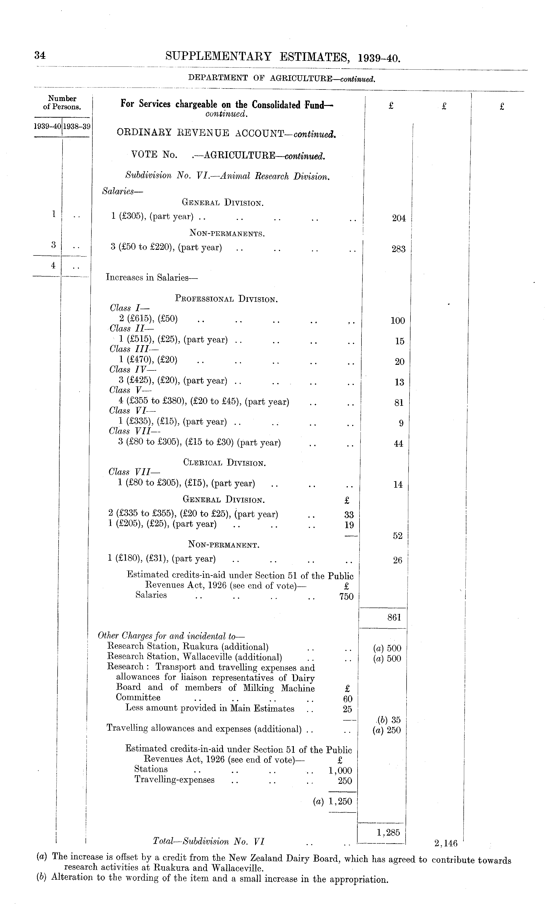 ofPersons. For Services chargeable on the Consolidated Fund— £ £ £ continued. ORDINARY REVENUE ACCOUNT'—continued, VOTE No. . —AGRICULTURE—continued. Subdivision No. VI.—Animal Research Division. Salaries— General Division. 1 1 (£305), (part year) .. .. .. .. ., 204 ! Non-perm anents . 3 .. 3 (£50 to £220), (part year) .. .. .. .. 283 4 Increases in Salaries— Professional Division. Glass I — 2 (£615), (£50) 100 •Class II— 1 (£515), (£25), (part year) .. .. .. 15 Class III— 1 (£470), (£20) 20 Class IV — 3 (£425), (£20), (part year) .. .. .. .. 13 Class V — 4 (£355 to £380), (£20 to £45), (part vear) .. .. 81 I Class VI — 1 (£335), (£15), (part vear) .. .. .. 9 Class VII— 3 (£80 to £305), (£15 to £30) (part year) .. .. 44 Clerical Division. Class VII— 1 (£80 to £305), (£15), (part year) .. .. .. 14 General Division. £ 2 (£335 to £355), (£20 to £25), (part year) .. 33 1 (£205), (£25), (part year) .. .. .. 19 j — 1 52 Non-permanent. 1 (£180), (£31), (part year) .. .. .. .. 26 Estimated credits-in-aid tinder Section 51 of the Public Revenues Act, 1926 (see end of vote) — £ Salaries .. .. . . .. 750 I 1 861 Other Charges for and incidental to — Research Station, Ruakura (additional) . . .. ( a ) 500 Research Station, Wallaceville (additional) . . . . («) 500 Research : Transport and travelling expenses and allowances for liaison representatives of Dairy Board and of members of Milking Machine £ Committee .. .. .. .. 60 Less amount provided in Main Estimates . . 25 — .(b) 35 Travelling allowances and expenses (additional) . . . . (a) 250 I ! Estimated credits-in-aid under Section 51 of the Public Revenues Act, 1926 (see end of vote) — £ Stations .. .. .. .. 1,000 Travelling-expenses .. .. .. 250 (a) 1,250 i,285 I Total—Subdivision No. VI .. .. 2.146