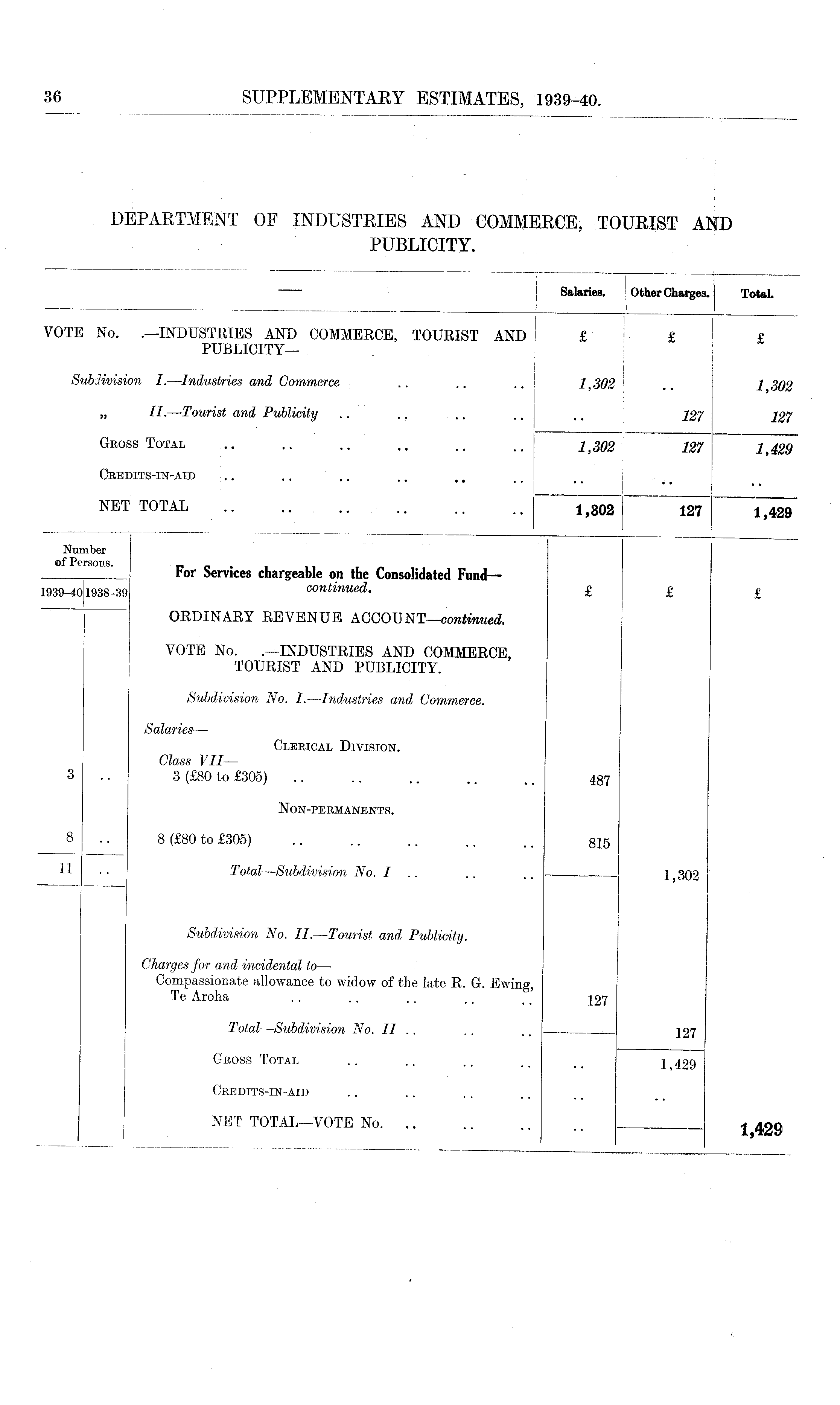 Salaries. Other Charges. Total. VOTE No. .—INDUSTRIES AND COMMERCE, TOURIST AND £ £ £ PUBLICITY— Subdivision I. —Industries and Commerce .. .. .. 1 ; 302 .. 1 302 „ 11.—Tourist and Publicity .. .. .. .. .. 227 127 Gross Total j )30 2 127 1,429 Credits-in-aid NET TOTAL .. .. .. .. .. .. lj302 m 1)42 g Number of Persons. _ „ ror services chargeable on the Consolidated Fund — 1939-401938-39 continued. £ £ £ ORDINARY REVENUE ACCOUNT—continued, VOTE No. .—INDUSTRIES AND COMMERCE, TOURIST AND PUBLICITY. Subdivision No. I.—Industries and Commerce. Salaries— Clerical Division. Class VII— 3 3 (£80 to £305) .. .. .. .. .. 487 Non-permanents. 8 8 (£80 to £305) .. .. .. .. .. 815 • • Total—Subdivision No. I . . .. 1 302 Subdivision No. II.—Tourist and Publicity. Charges for and incidental to — Compassionate allowance to widow of the late R. G. Ewing Te Aroha .. .. .. . _ ' 227 Total—Subdivision No. II .. .. .. 227 GROSS Total .. .. .. .. _ # 2 429 Credits-in-aid NET TOTAL—VOTE No ______ j 42 9